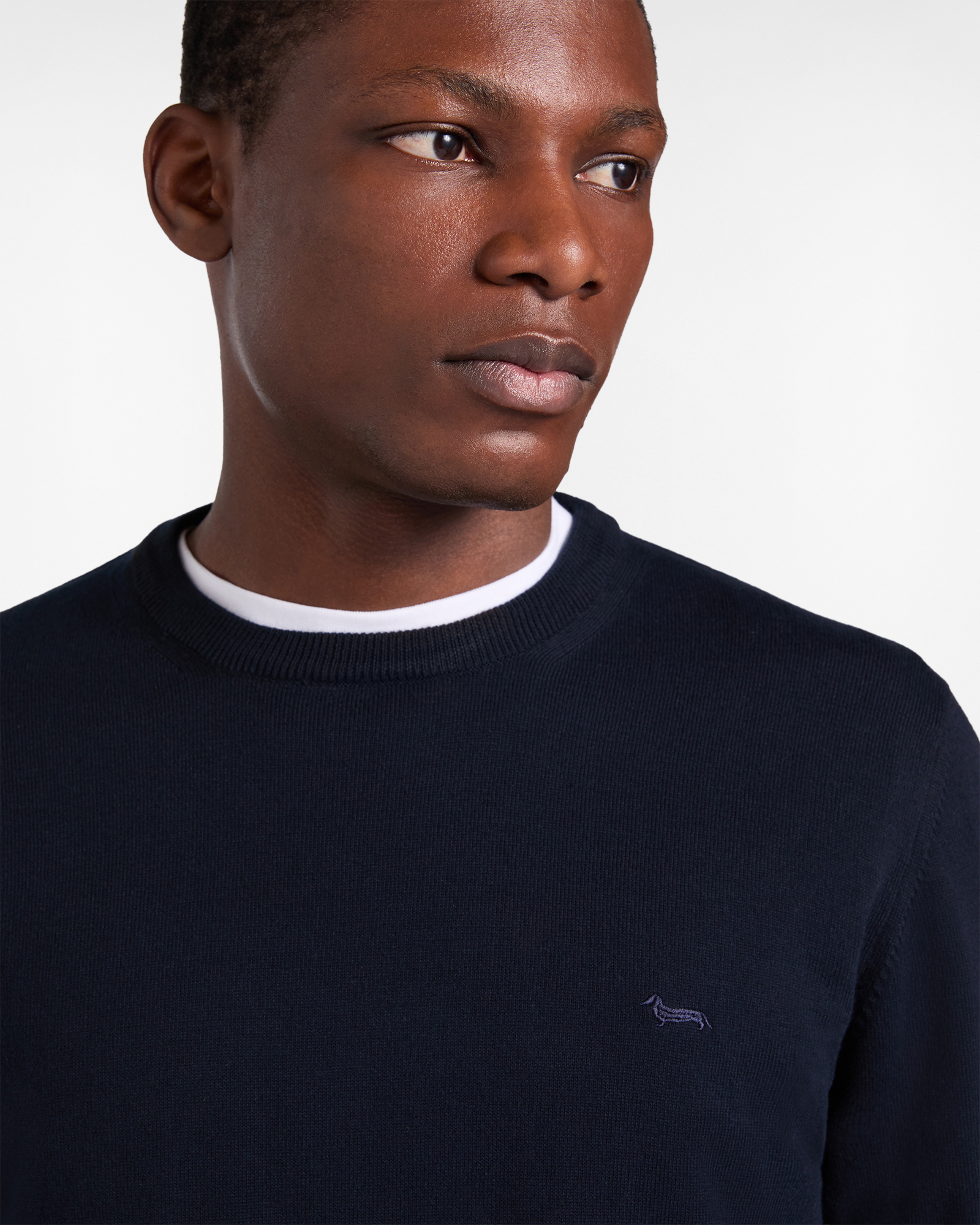 Scopri il pullover girocollo in puro cotone, un maglione essenziale per il tuo guardaroba quotidiano. Vestibilità regular, fondo capo, collo e polsi a costine. Interno collo a contrasto e bassotto ricamato lato cuore.