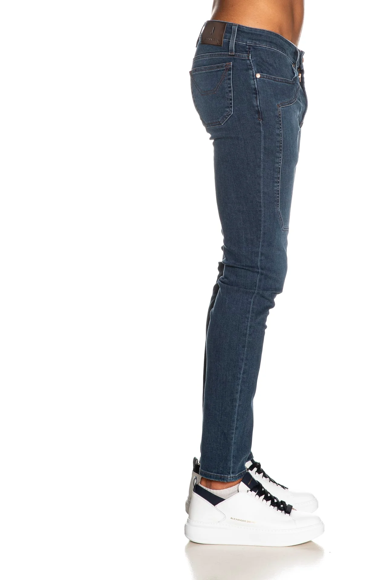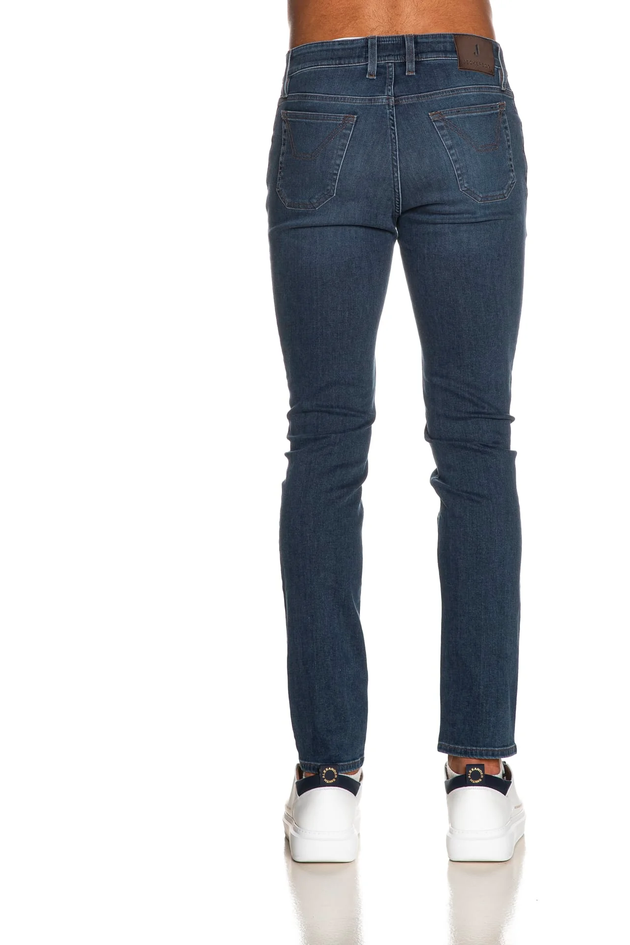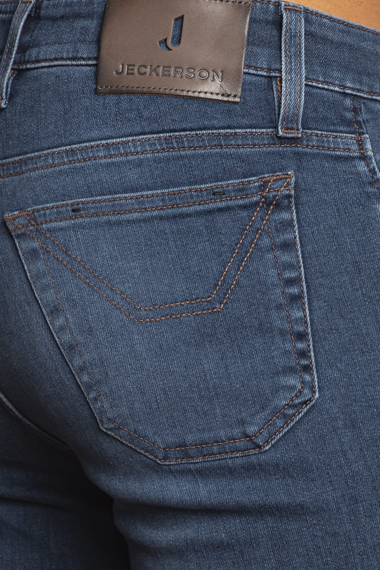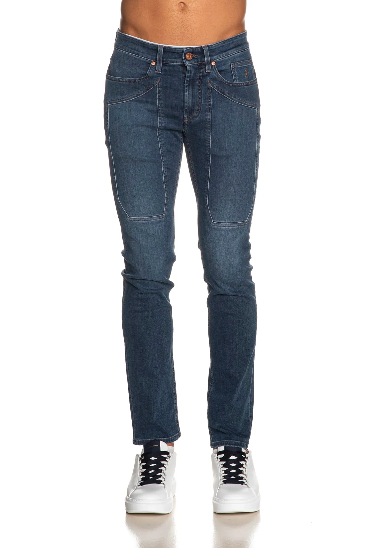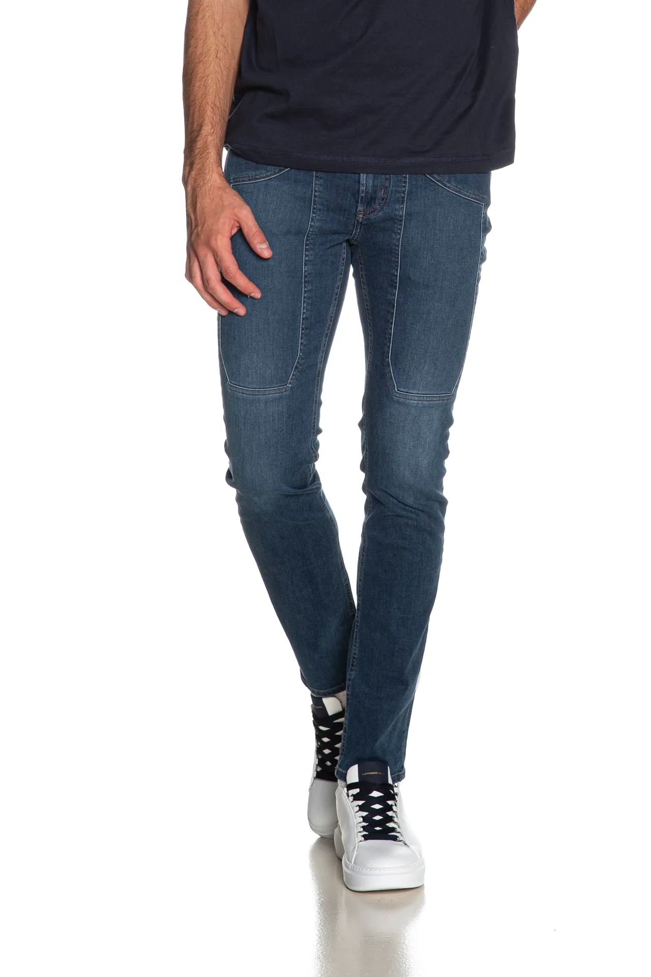 Jeans Jeckerson John 5Pkts Den da uomo in denim di cotone stretch, realizzato con tecnologia Tri Blend Evlox per una struttura ad elevata elasticità ed eccezionale recupero della forma e sottoposto a trattamento per una finitura di colore unica, modello cinque tasche slim fit, con chiusura zip, monogramma ricamato sul taschino anteriore e toppe over sulle gambe tono su tono
