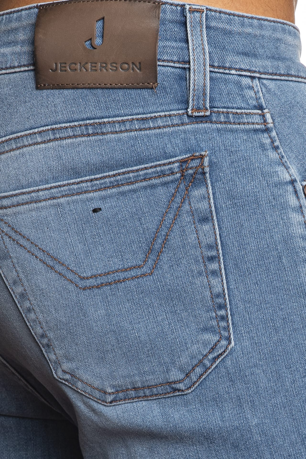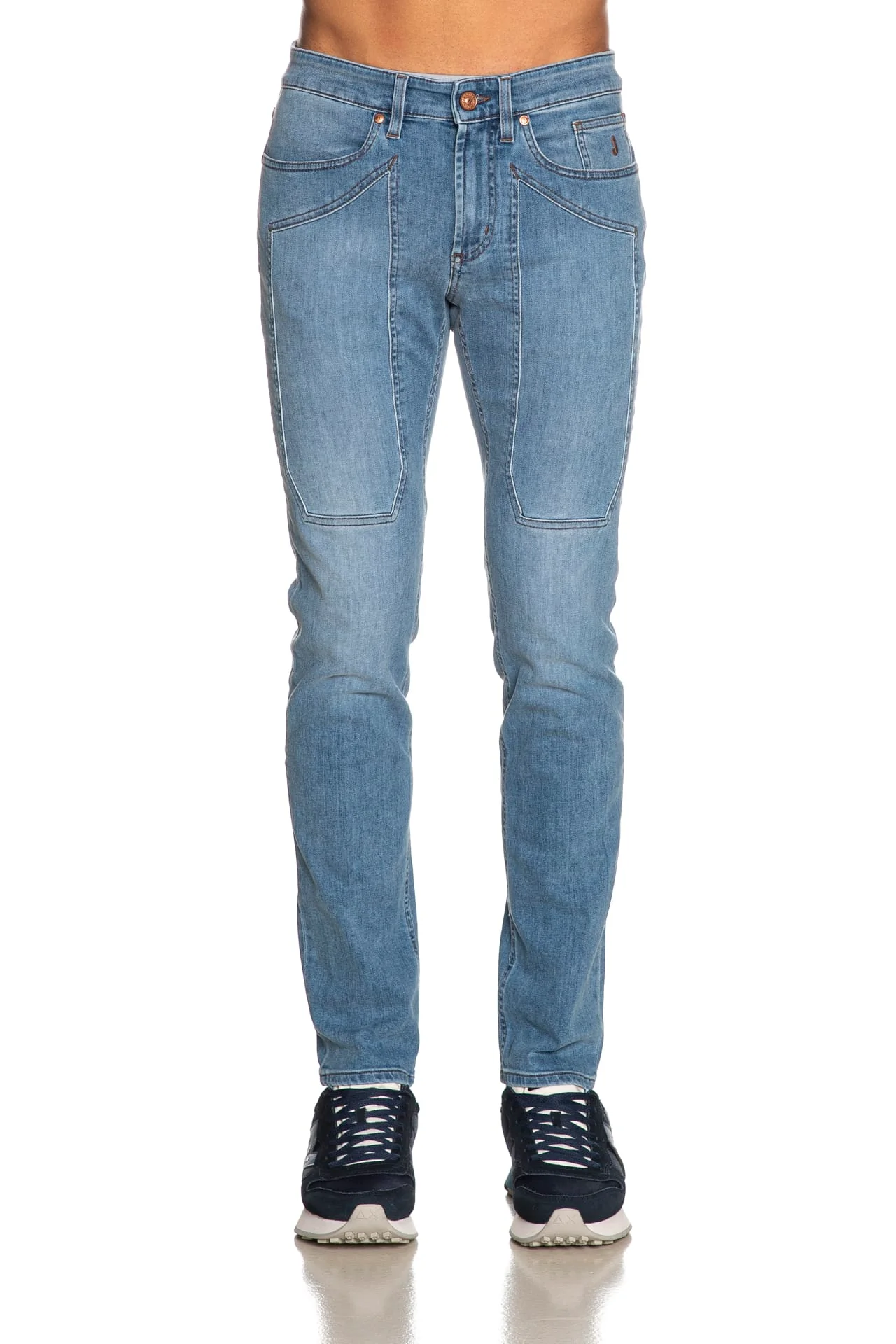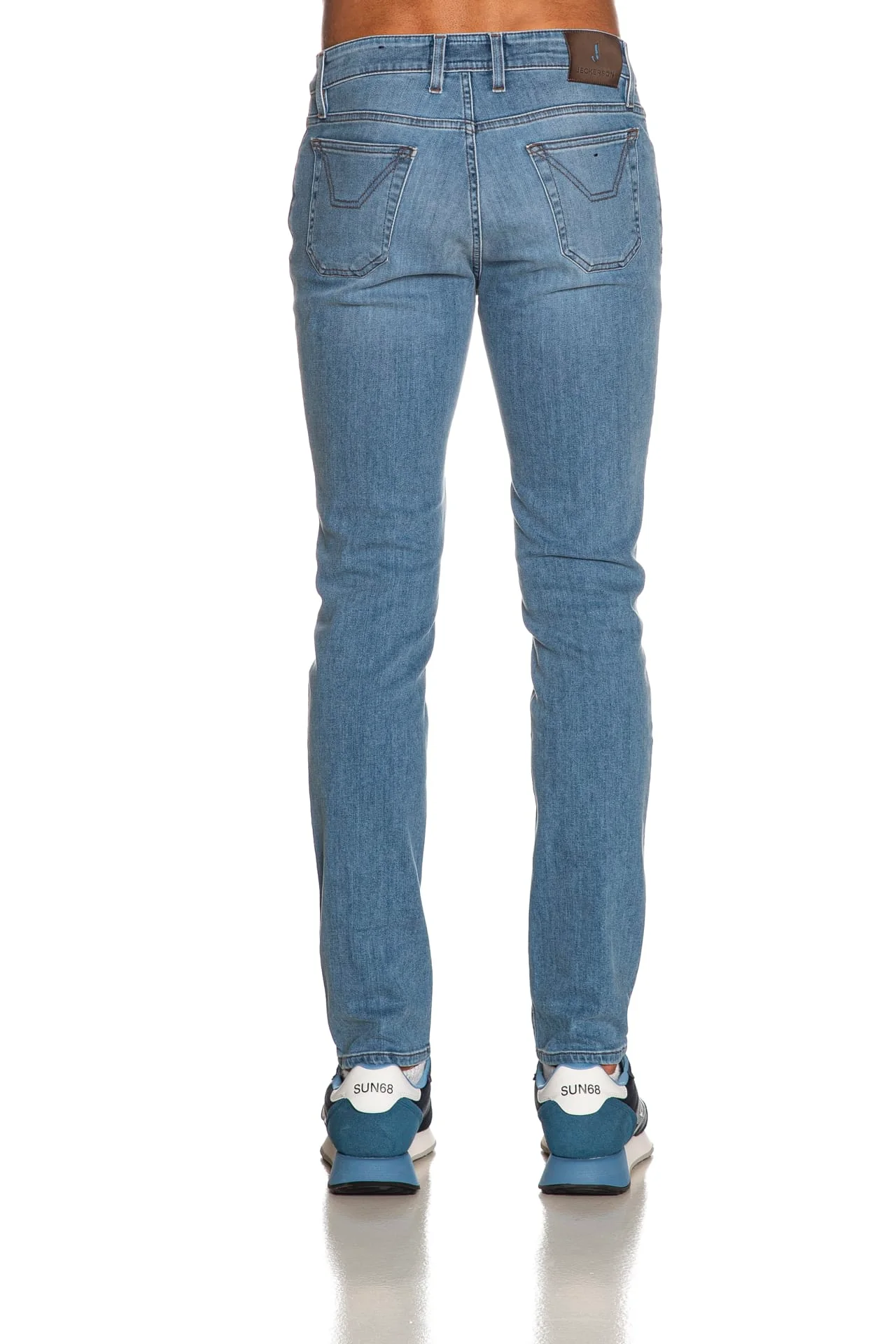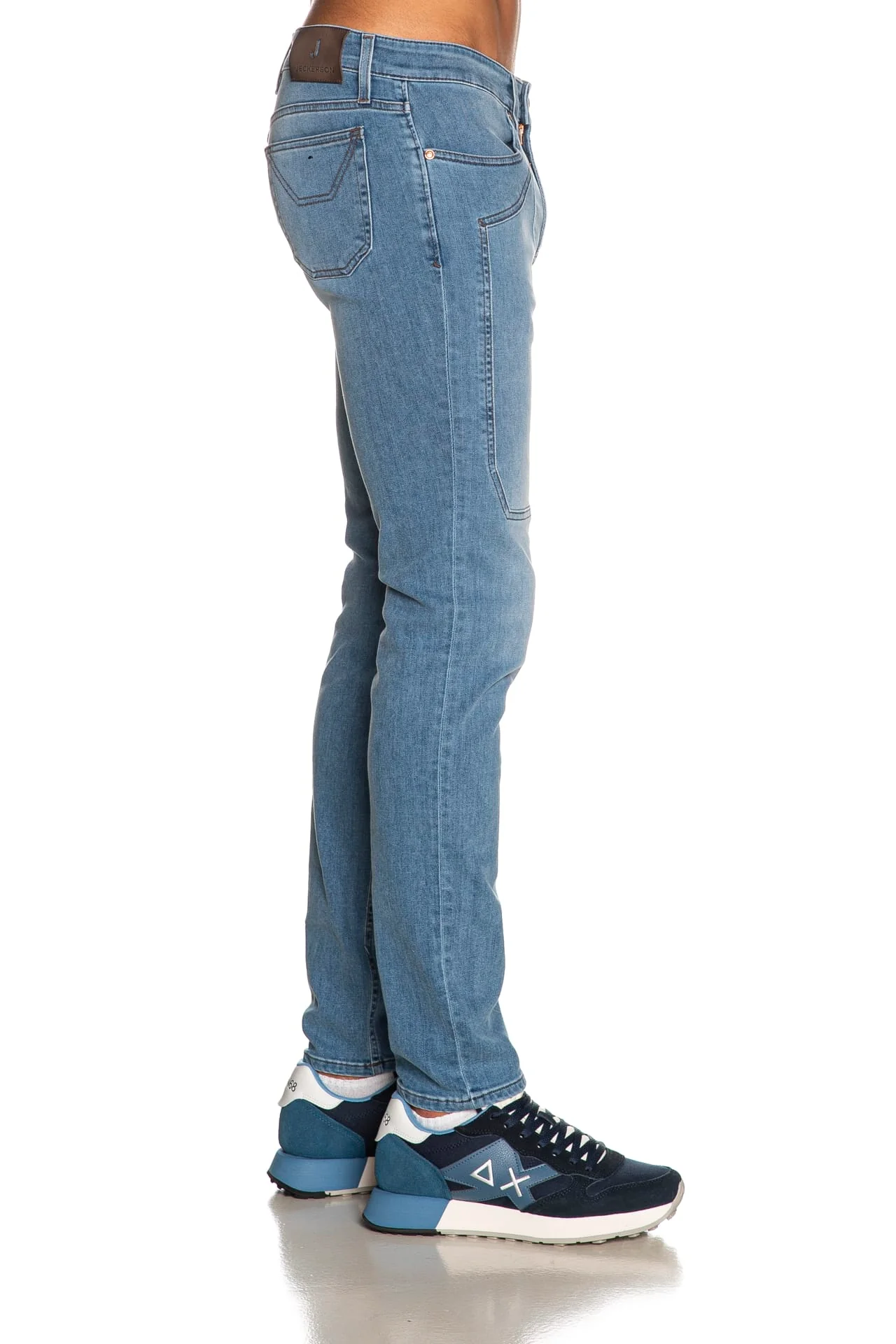 Jeans Jeckerson John 5Pkts Den da uomo in denim di cotone stretch, realizzato con tecnologia Tri Blend Evlox per una struttura ad elevata elasticità ed eccezionale recupero della forma e sottoposto a trattamento per una finitura di colore unica, modello cinque tasche slim fit, con chiusura zip, monogramma ricamato sul taschino anteriore e toppe over sulle gambe tono su tono
