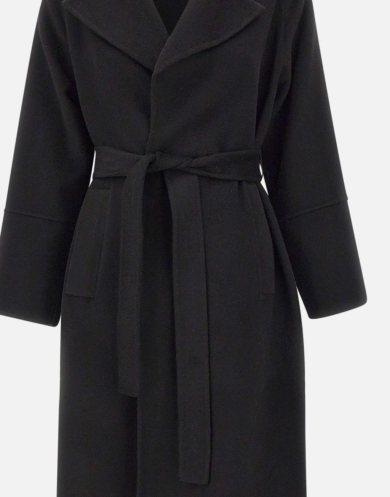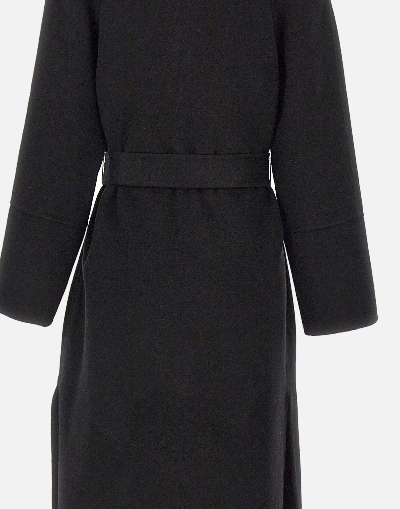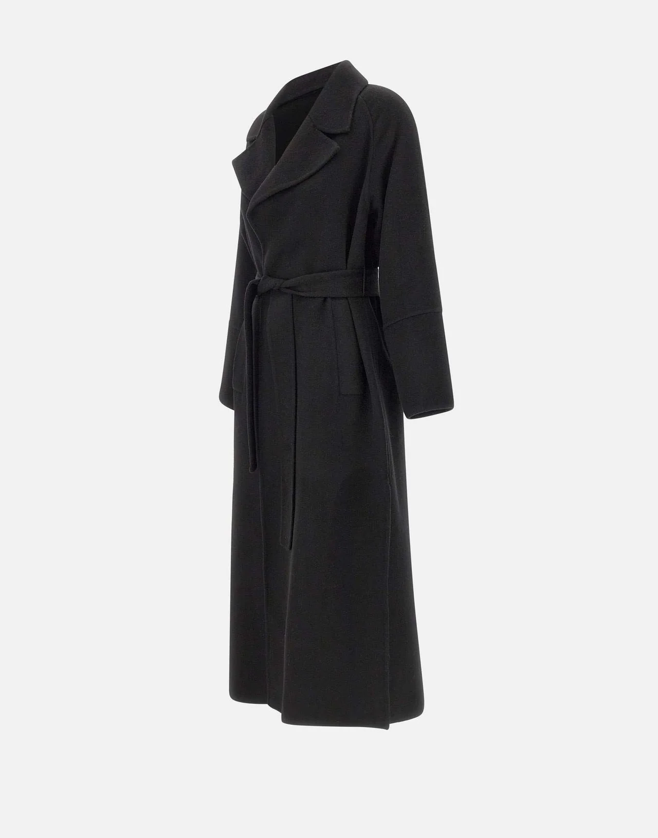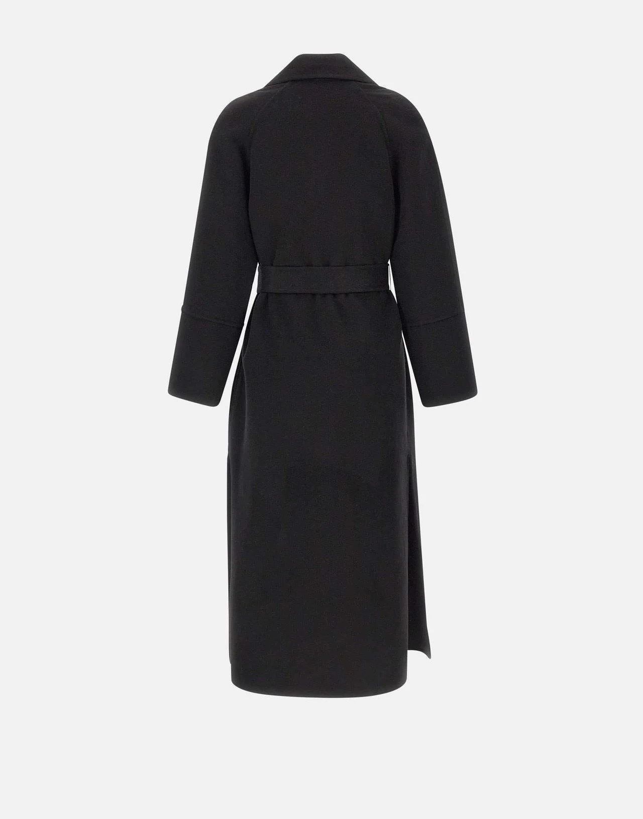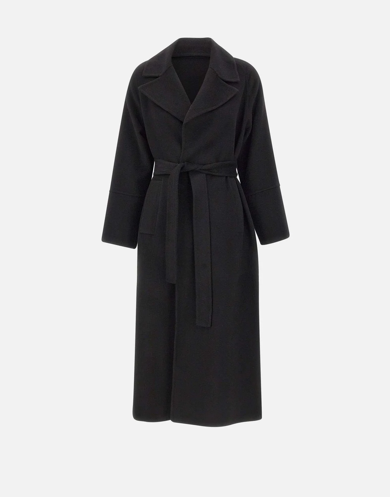 Cappotto Kaos in panno misto lana e viscosa, proposto nell'intramontabile colore nero, design sofisticato con collo ampio e rever a lancia, costruzione a vestaglia con cintura da annodare in vita che valorizza la silhouette. Le tasche laterali a filo, i comodi spacchi sul fondo e le maniche con spalle raglan completano il look, offrendo un fit relaxed ma raffinato. Perfetto per le mezze stagioni e l'inverno, ideale per outfit casual chic o eleganti.