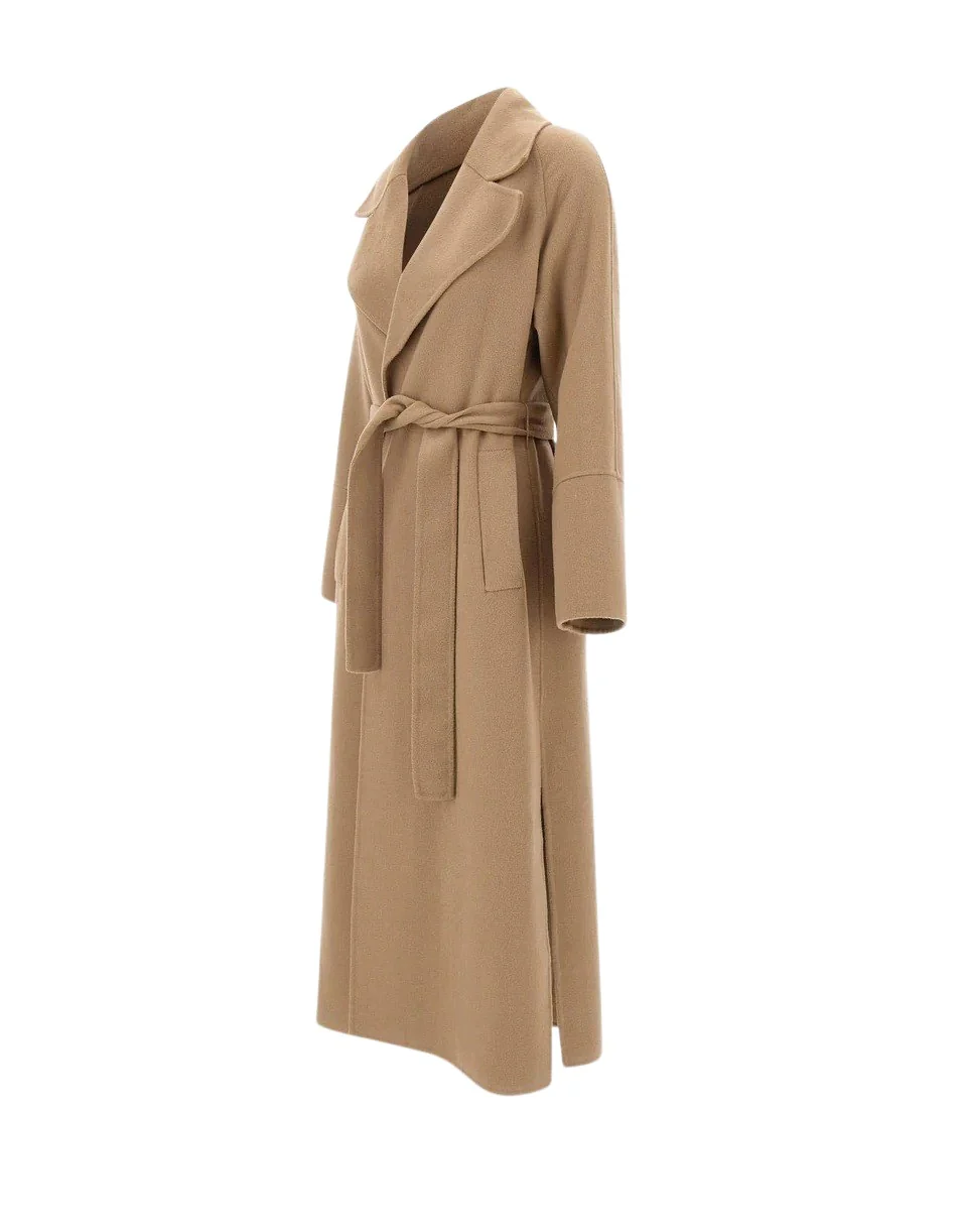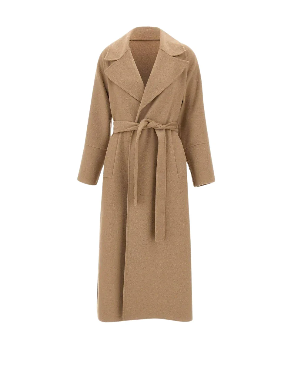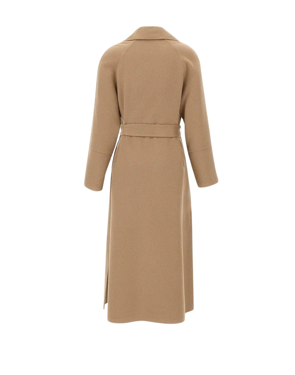 Cappotto Kaos in panno misto lana e viscosa, proposto nell'intramontabile colore cammello, design sofisticato con collo ampio e rever a lancia, costruzione a vestaglia con cintura da annodare in vita che valorizza la silhouette. Le tasche laterali a filo, i comodi spacchi sul fondo e le maniche con spalle raglan completano il look, offrendo un fit relaxed ma raffinato. Perfetto per le mezze stagioni e l'inverno, ideale per outfit casual chic o eleganti.