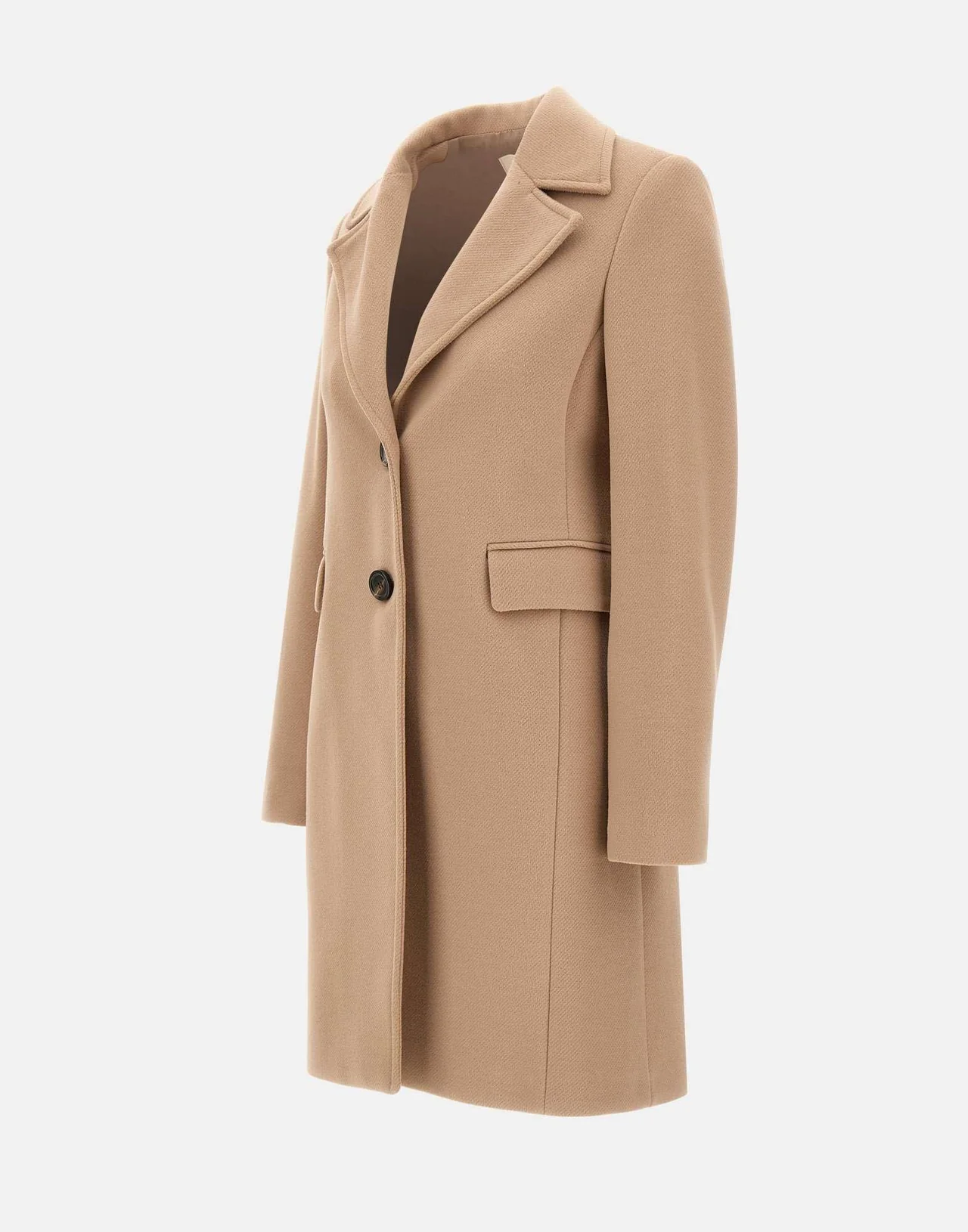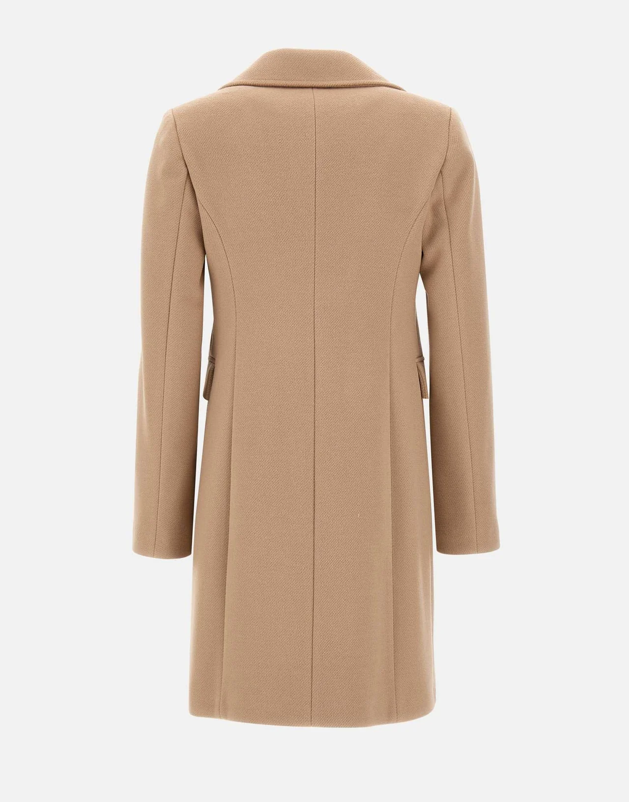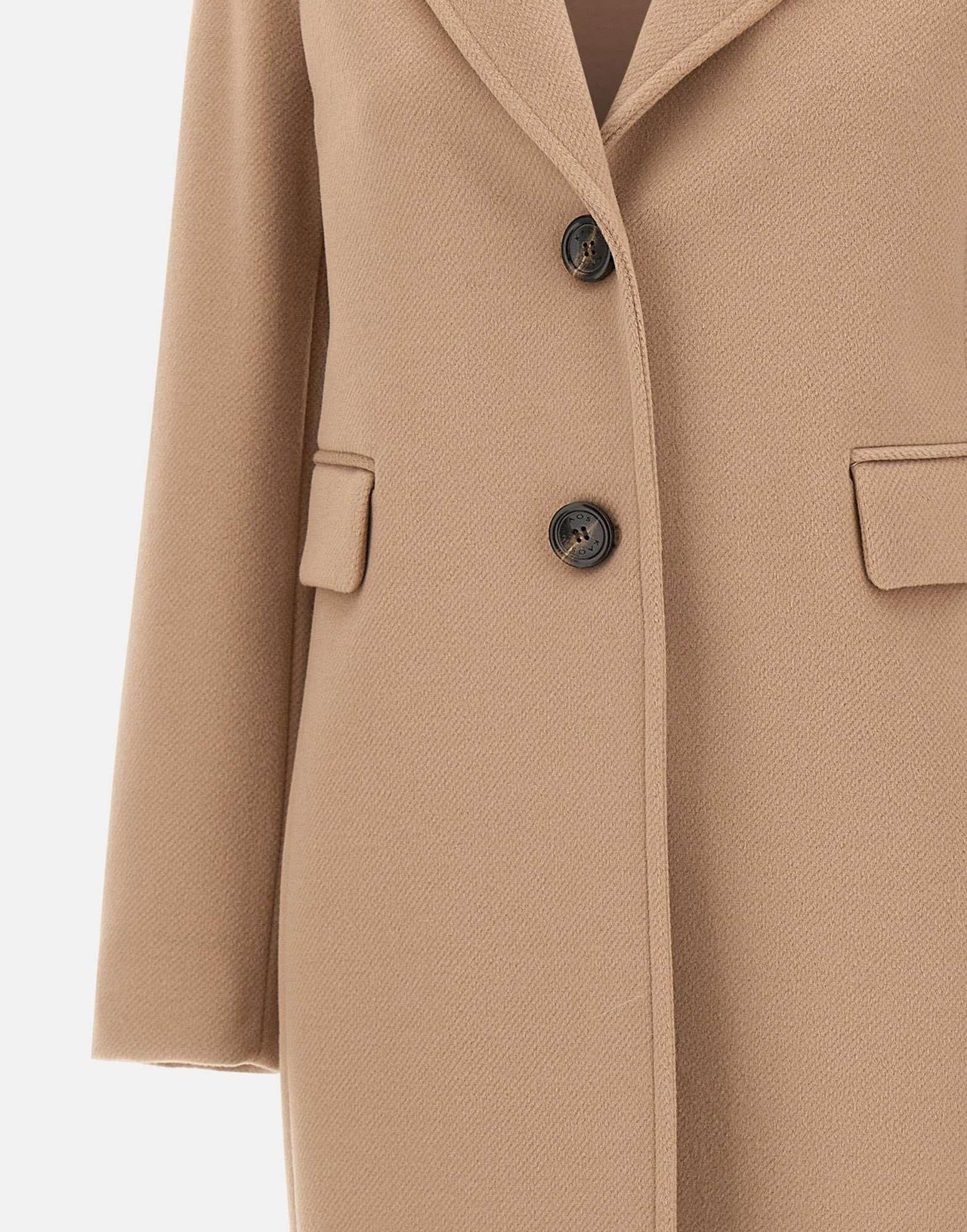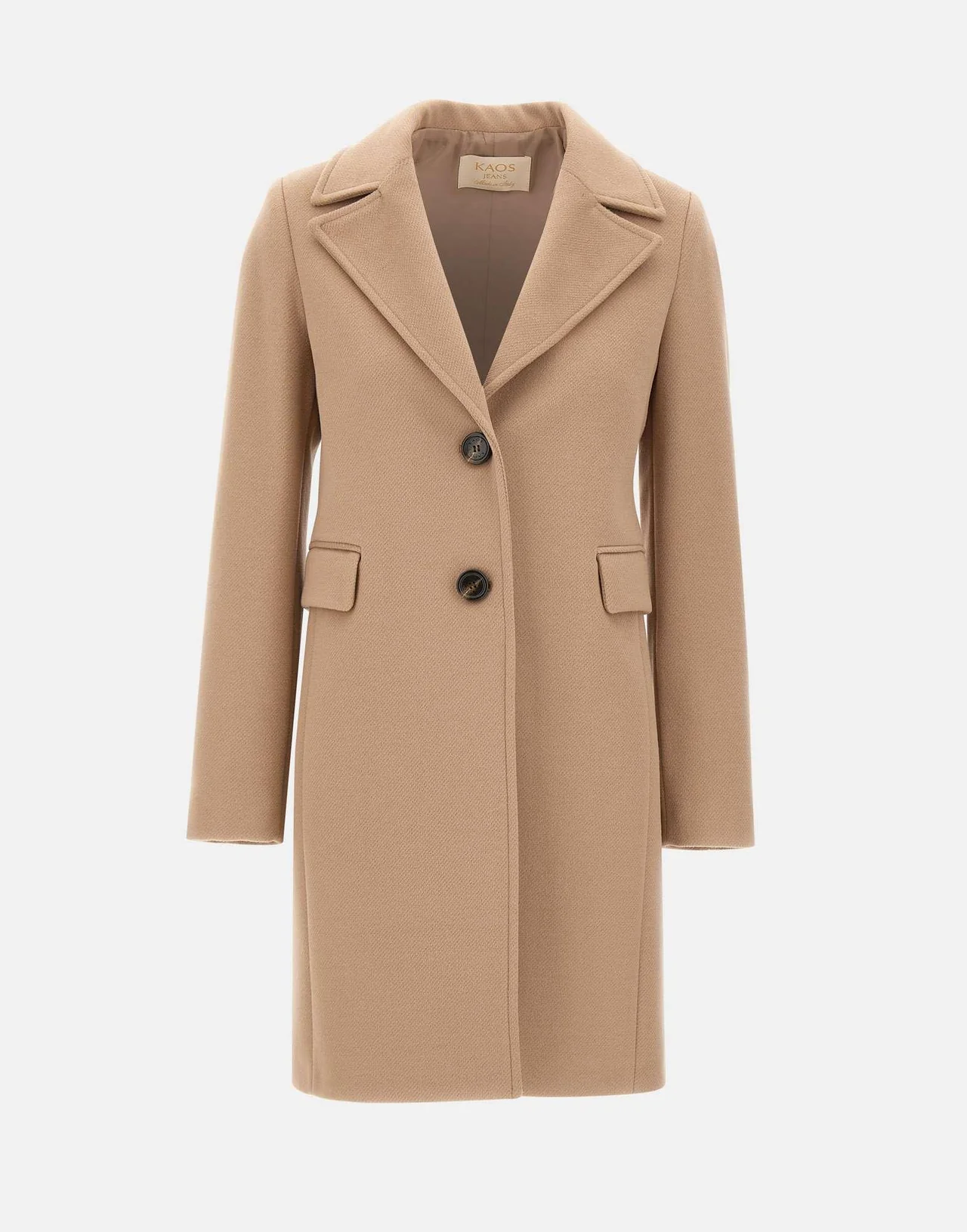 Cappotto Kaos, colore cammello, tessuto misto viscosa, trama operata, morbido e confortevole al tatto, rever a lancia, chiusura con due maxi bottoni logati in tinta, tasche anteriori con pattina, spalline imbottite, foderato tono su tono, regular fit, made in Italy