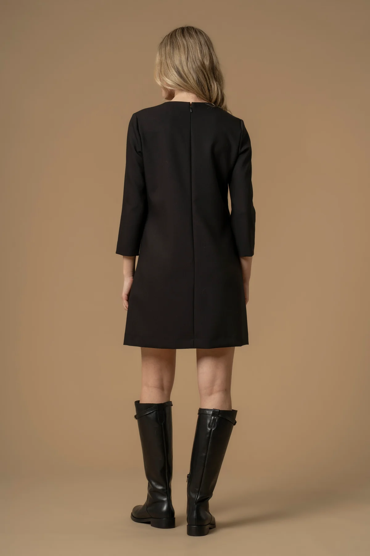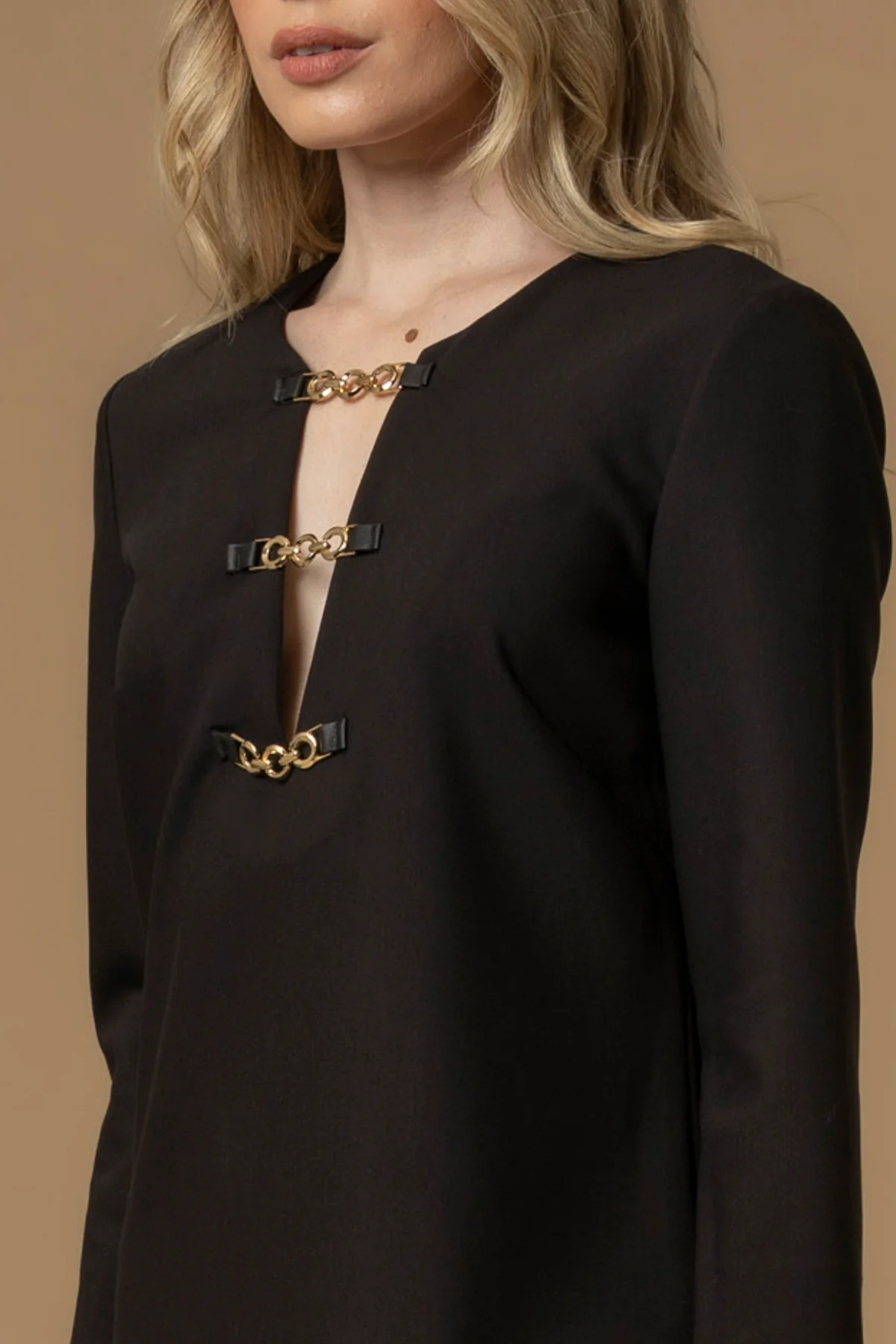 Elegante e versatile, questo abito corto è caratterizzato dallo scollo a V impreziosito da catene dorate. Il capo presenta una linea scivolata e fondo svasato.