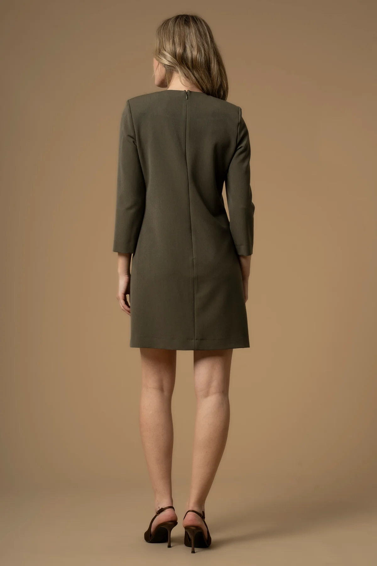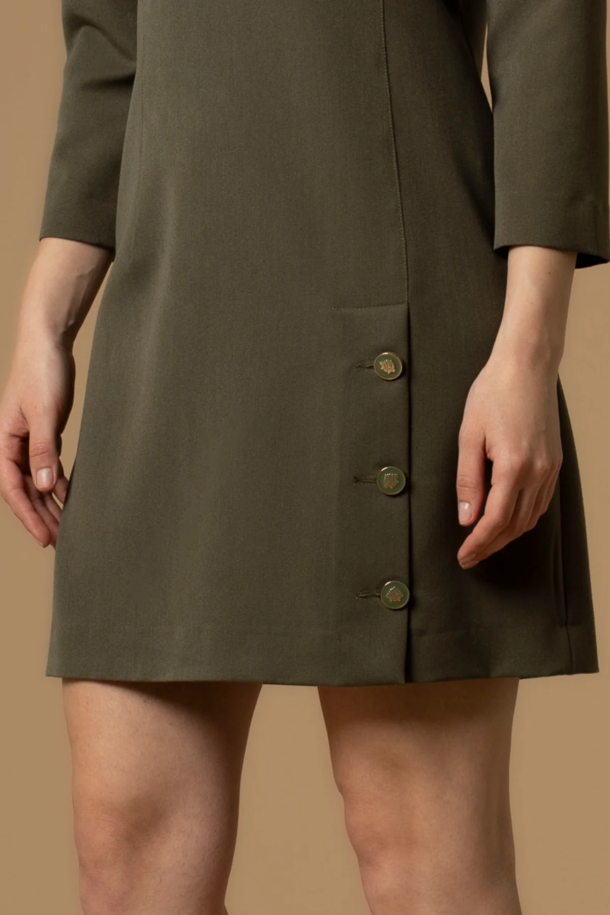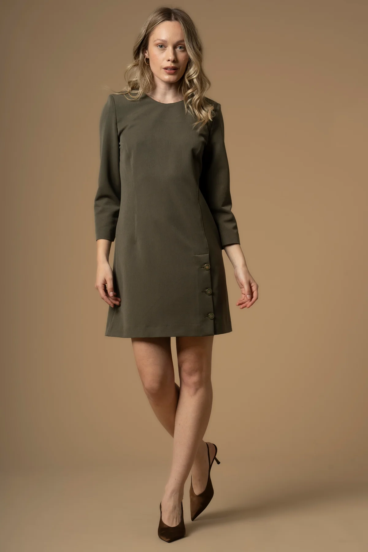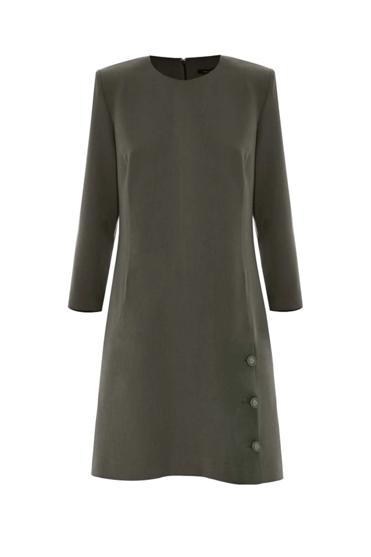 Stile minimal per questo elegante abito corto caratterizzato dallo scollo rotondo, vestibilità regolare e da uno spacco laterale impreziosito da bottoni gioiello.