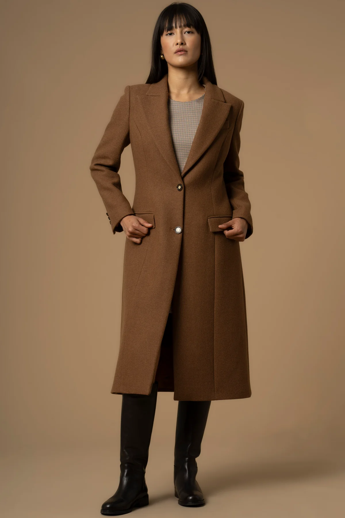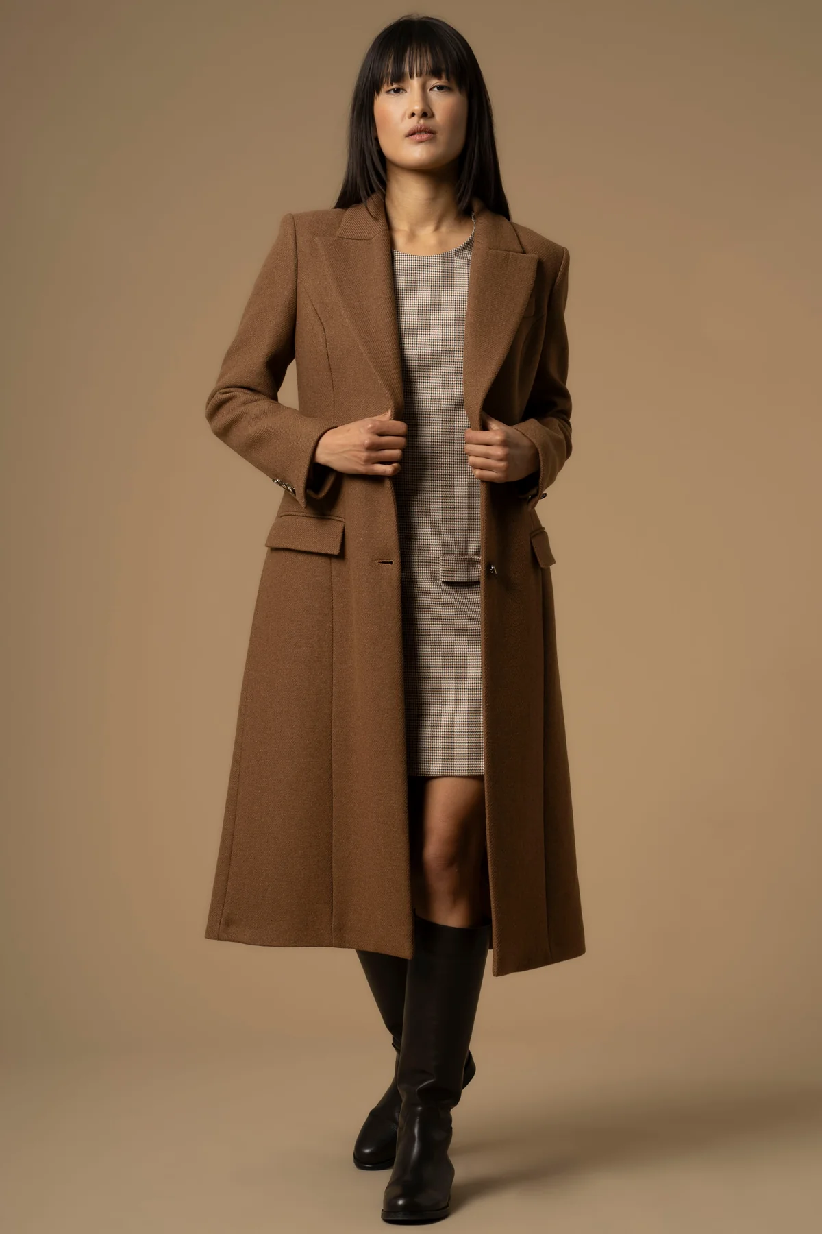 Stile elegante e intramontabile epr questo cappotto caratterizzato dallo scollo con revers, tasche con pattina sul davanti e chiusura con due bottoni decorati.