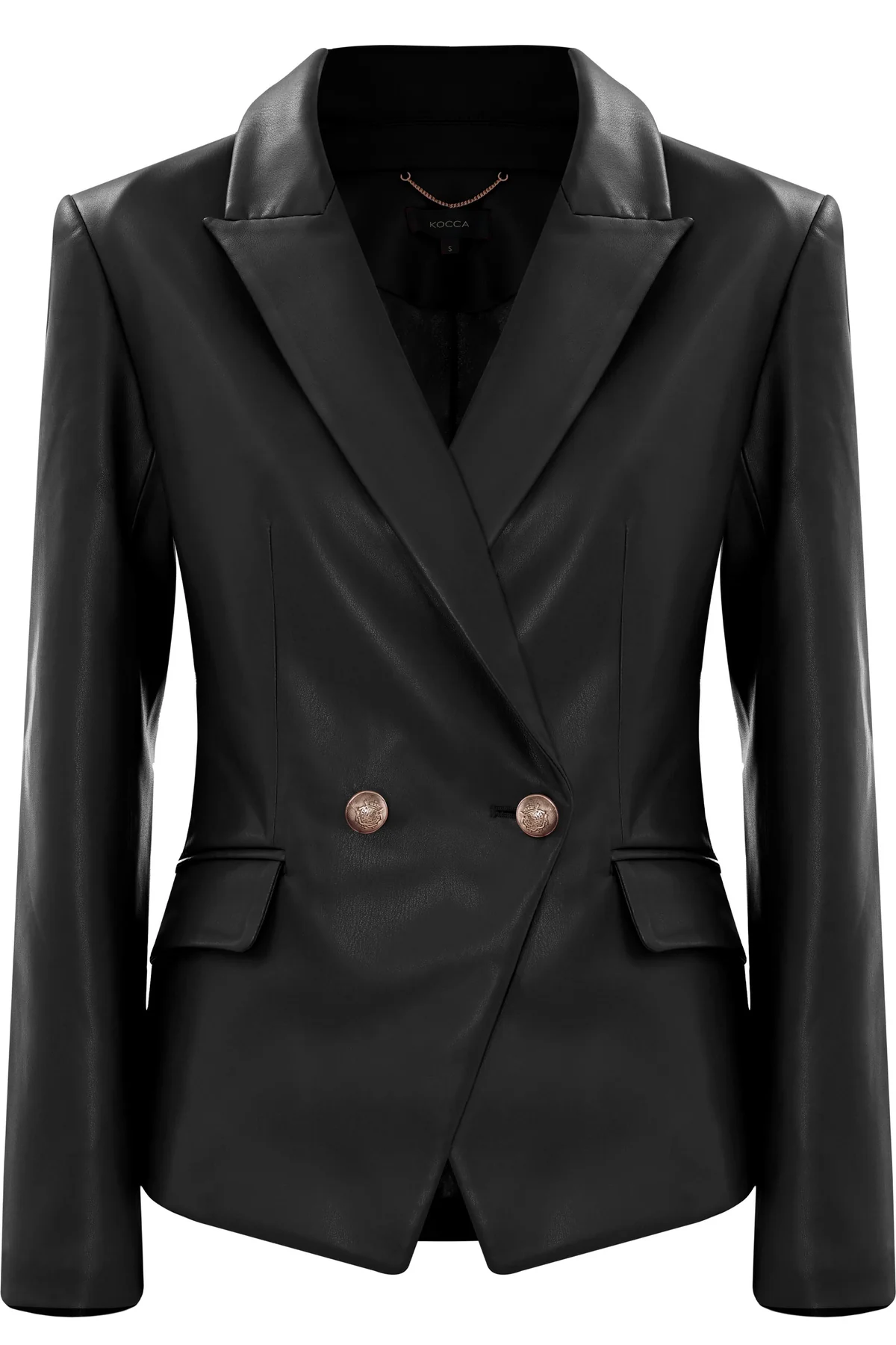 Moderna ed essenziale, questa giacca in ecopelle è caratterizzata da un fit aderente valorizzato dallo scollo con revers e chiusura con bottoni gioiello.