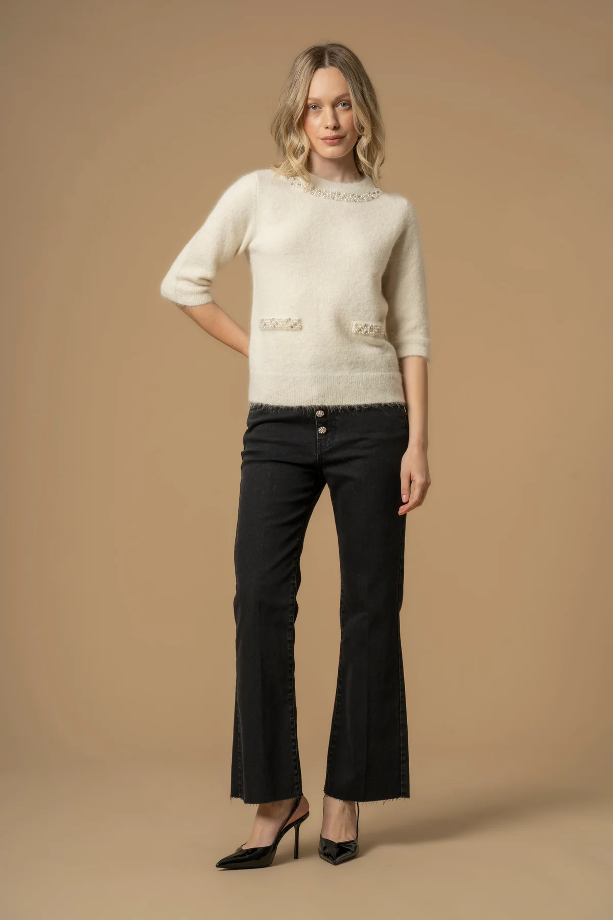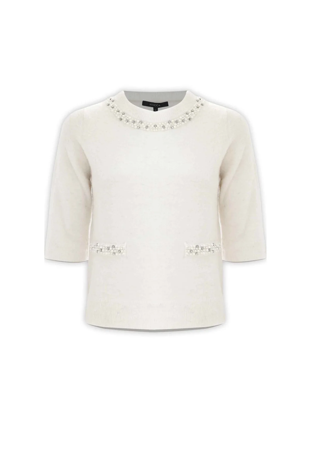 Lo stile classico di questa maglia con maniche a tre quarti è sottolineato dal dettaglio in perle sullo scollo e sul davanti. Il capo presenta lo scollo rotondo e bordi a costine.