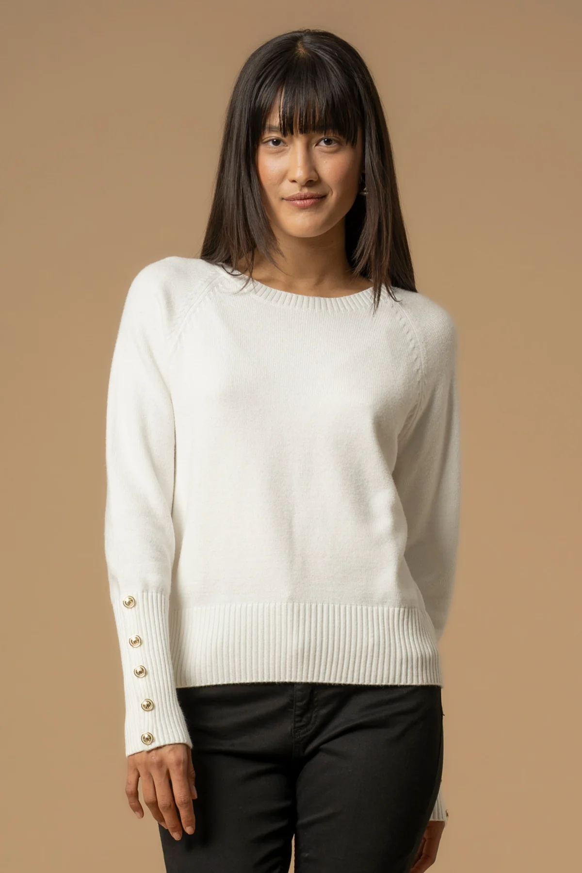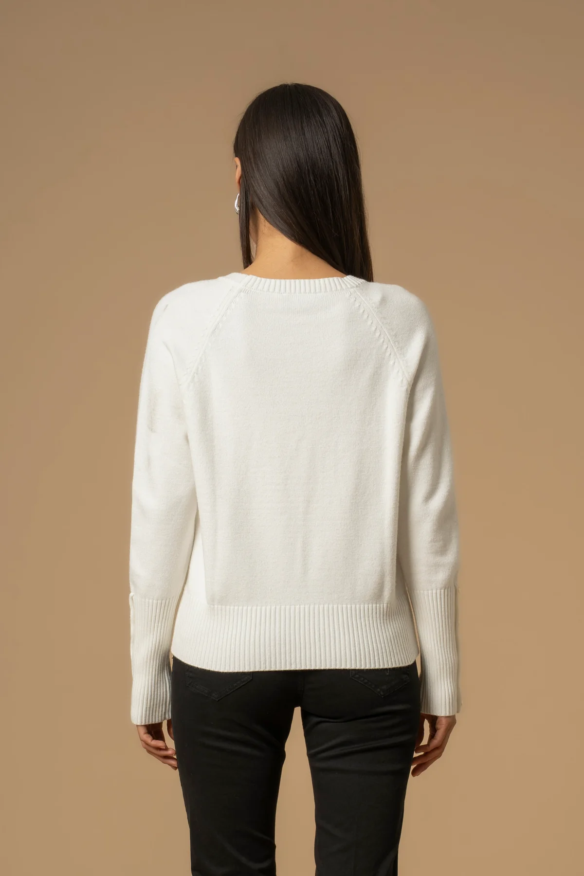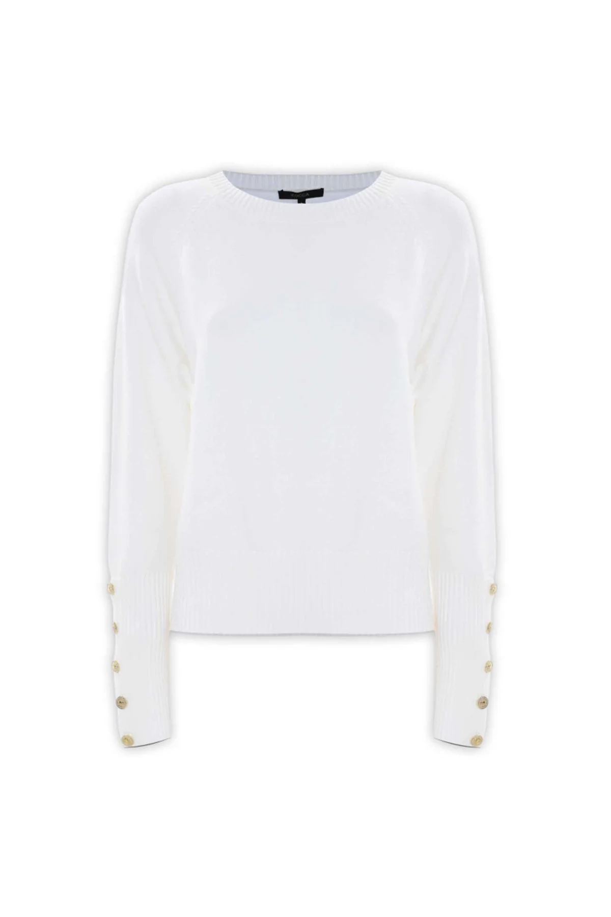 Elegante e ricca di dettagli, questa maglia presenta i polsini alti a costine, impreziositi da bottoni gioiello e maniche lunghe raglan. Il capo presenta scollo rotondo e vestibilità regolare