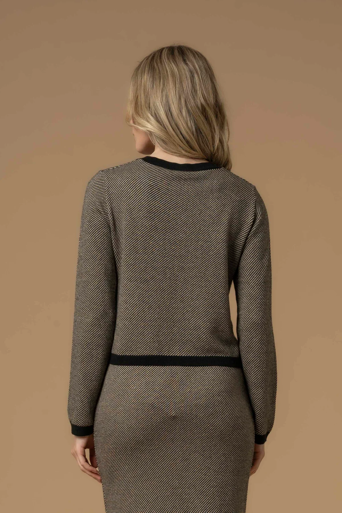 Questa maglia corta è impreziosita dal tessuto a righe in lurex e dai profili in contrasto che regalano stile e personalità al capo. Il modello presenta chiusura frontale con bottoni dorati, tasche a filetto con bottone sul davanti e scollo rotondo.