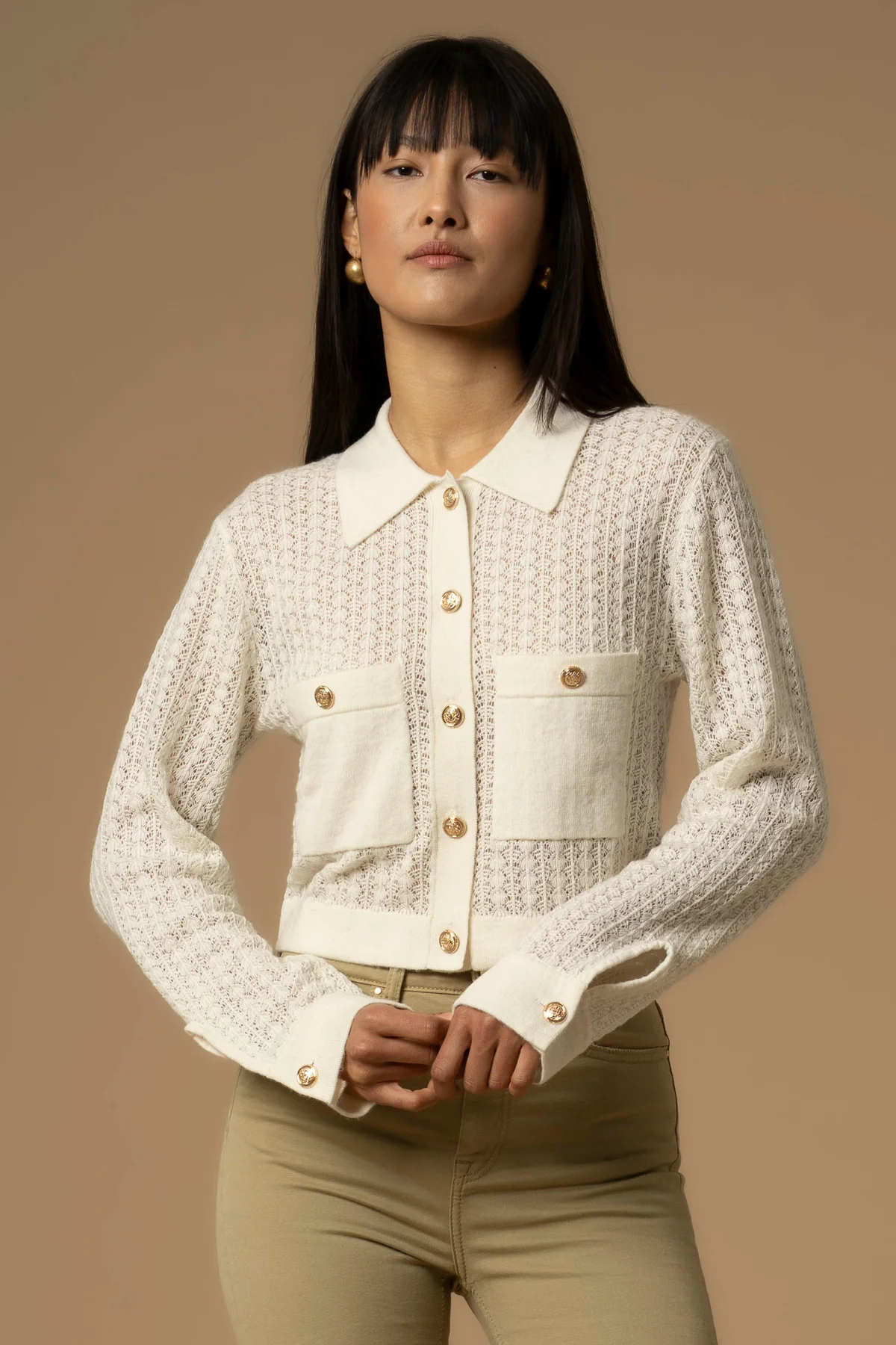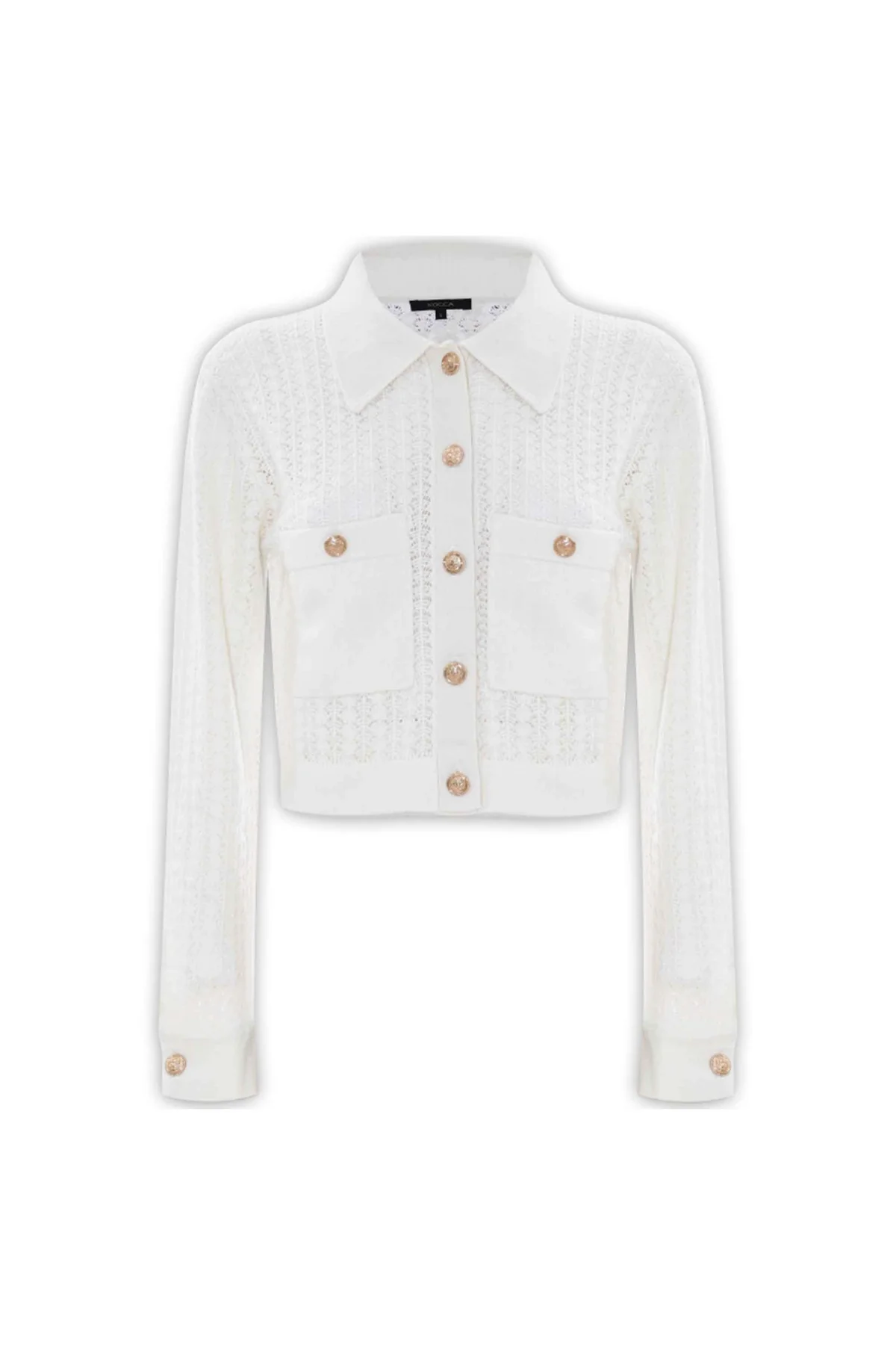 Questa maglia è caratterizzata da un taglio crop impreziosito dal tessuto all over traforato e dai profili in contrasto. Il capo presenta colletto a punta, tasche sul davanti, polsini e chiusura frontale con bottoni dorati.