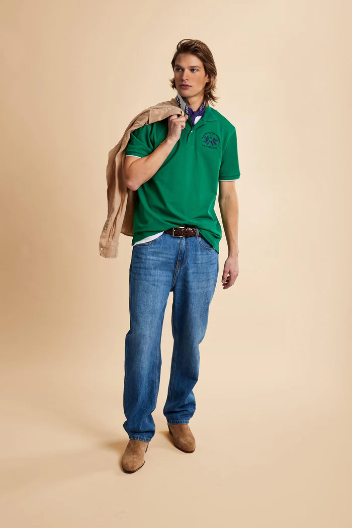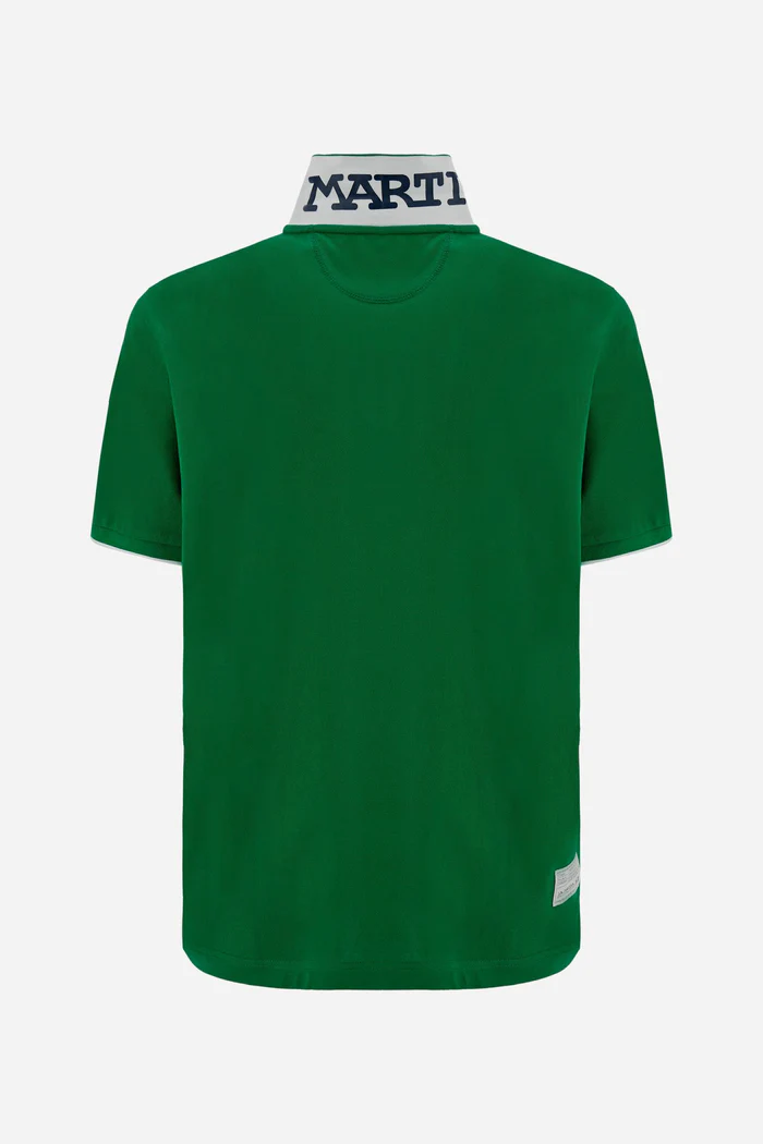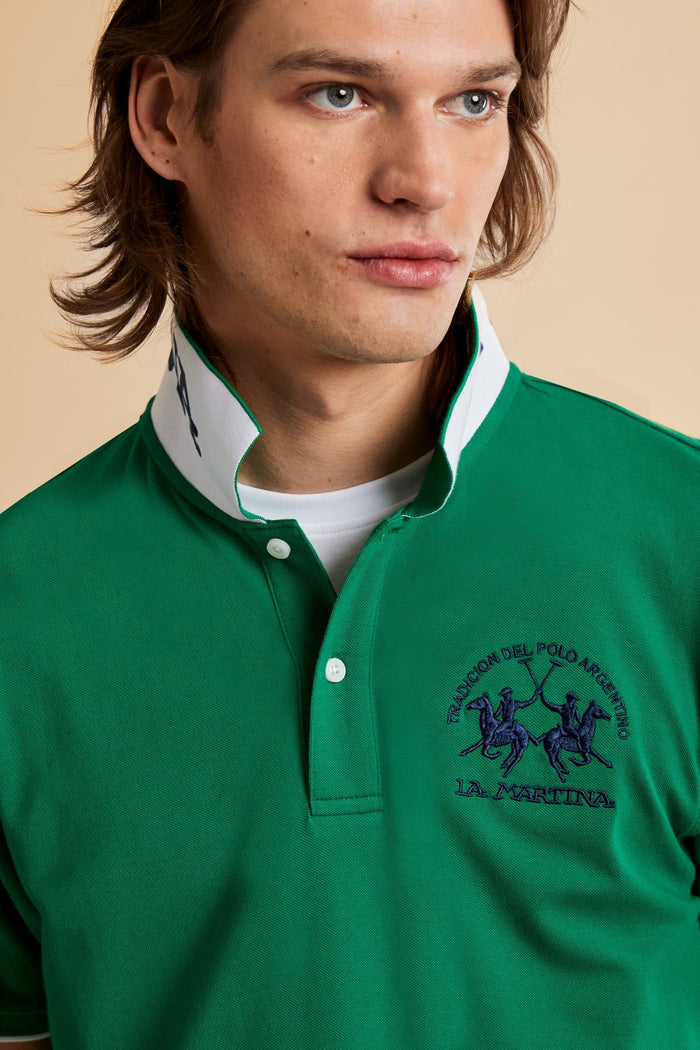 Polo da uomo a manica corta realizzata in piquet stretch tinta unita. Il modello presenta apertura frontale a due bottoni con colletto e polsini in costina tono su tono. Iconico del brand, il design si distingue per il maxi team logo ricamato a contrasto sul petto e per la grande stampa del brand allinterno del sottocollo in colore a contrasto. La vestibilità regolare garantisce comfort e stile in ogni occasione.