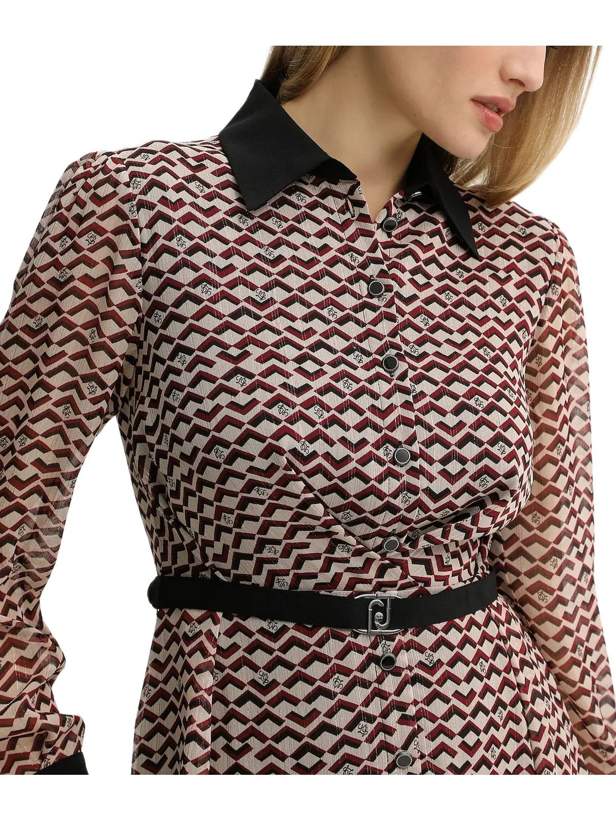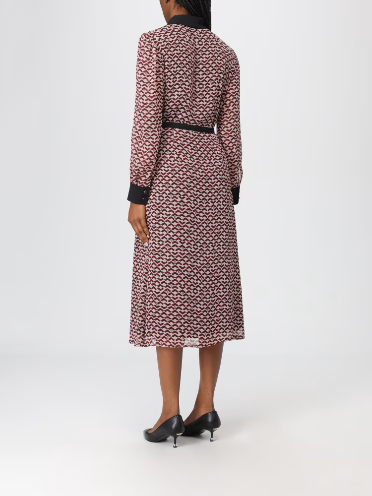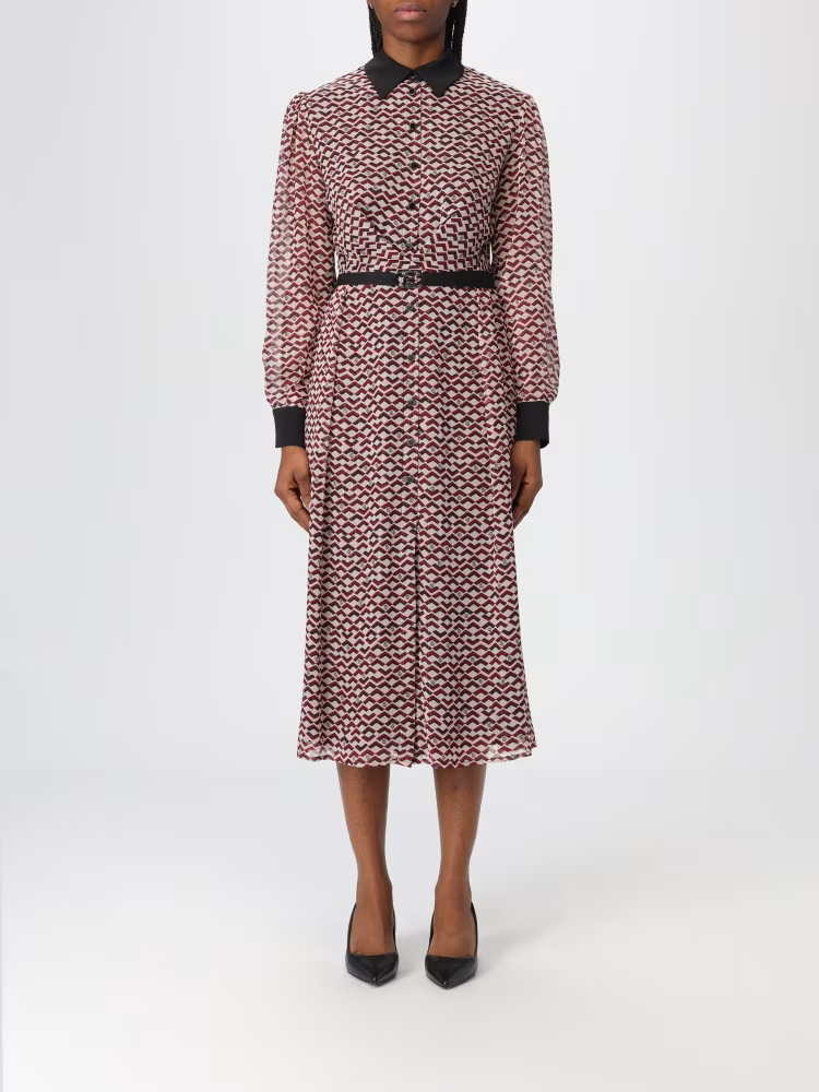 Abito midi beige chiaro e rosso di Liu Jo con motivo geometrico. Dotato di chiusura frontale a bottoni e maniche lunghe per un look elegante e raffinato