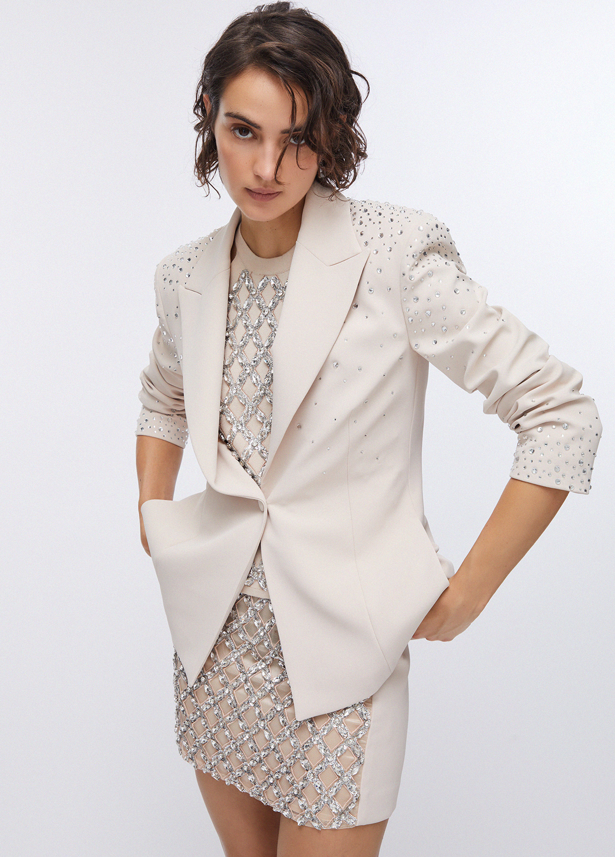 Il taglio essenziale del cadi stretch incontra la luminosità dei ricami gioiello. Questo blazer slim fit cattura ogni sguardo nella versione all-white, per rendere speciale anche loutfit più essenziale.