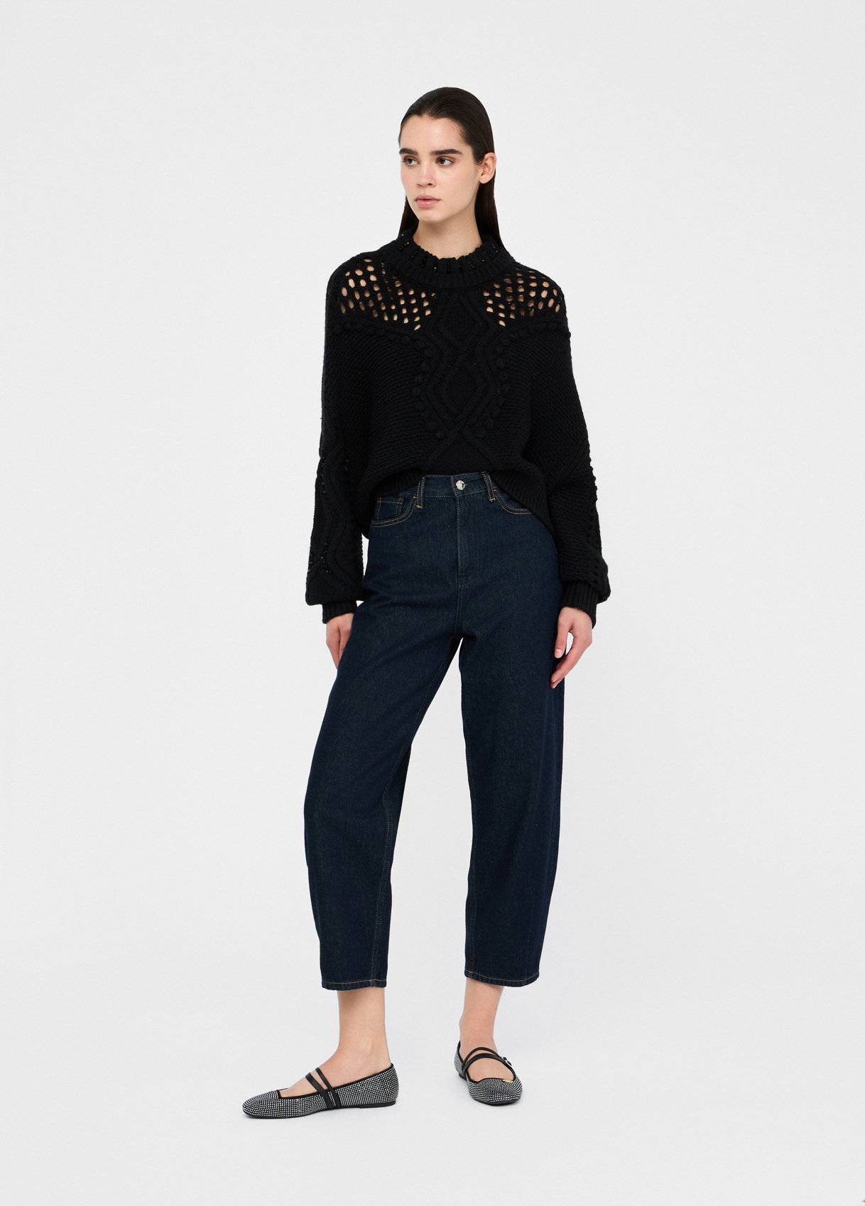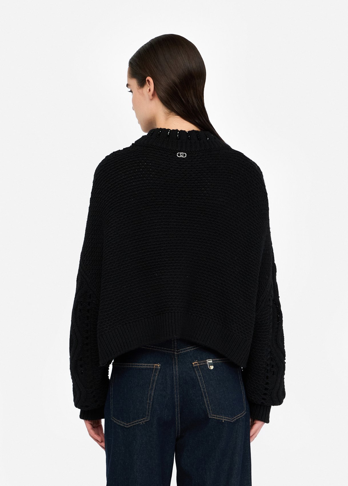 Texture che si intrecciano, traforature dall'effetto see-through, perline che illuminano il look. Questo morbido pullover in lana ridefinisce il concetto di knitwear.