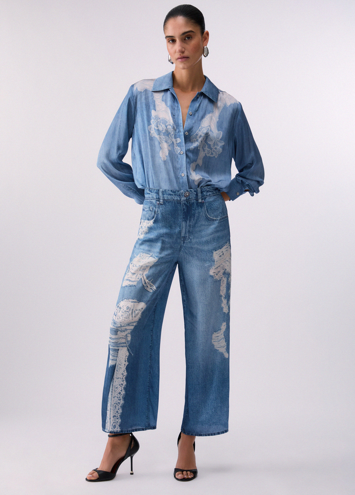 Realizzati in raso che scivola fluido sulla pelle, questi pantaloni giocano con lillusione optical del denim grazie a una stampa digitale realistica. Perfetti per trasformare anche il più semplice top in look da protagonista.