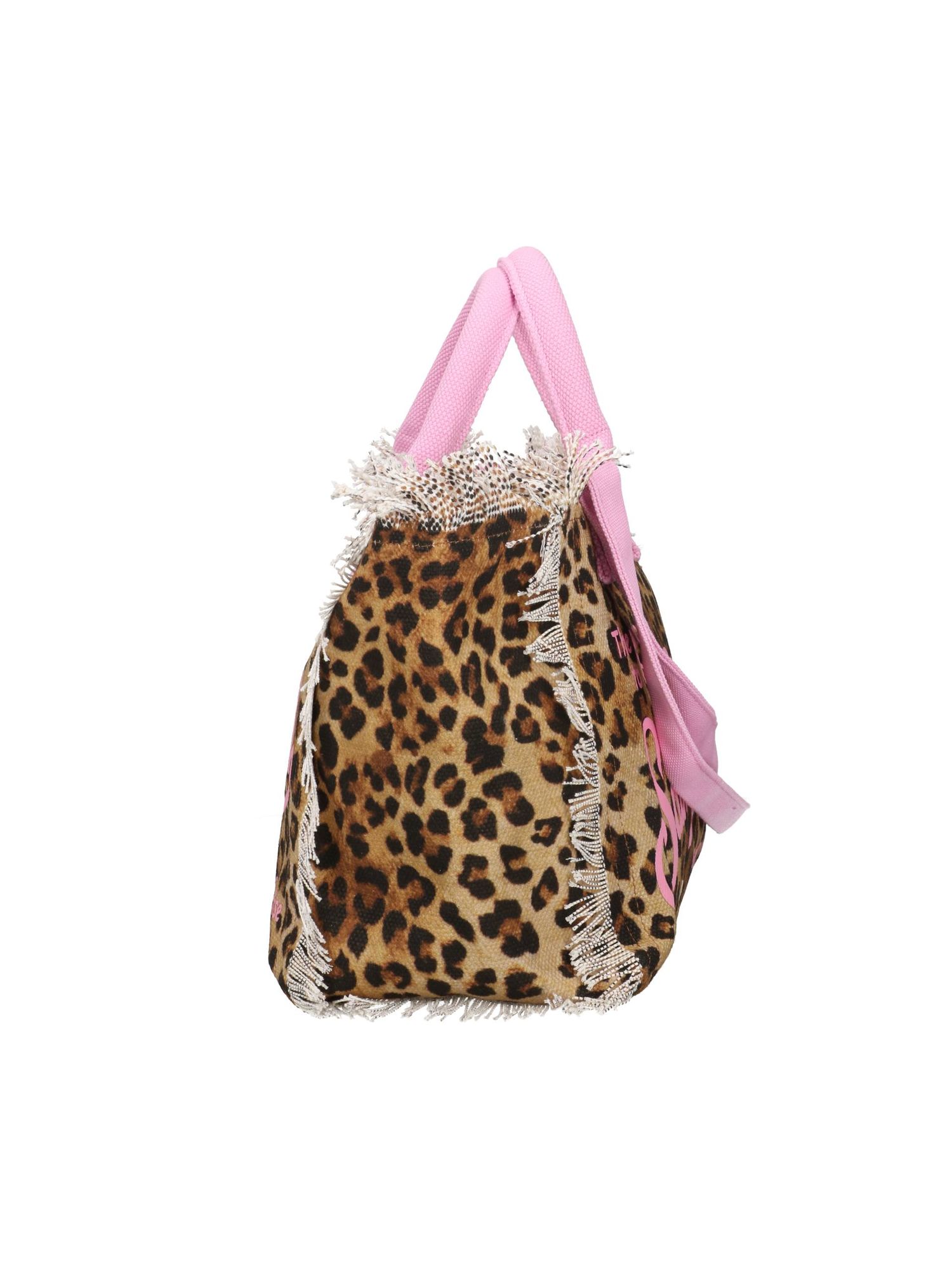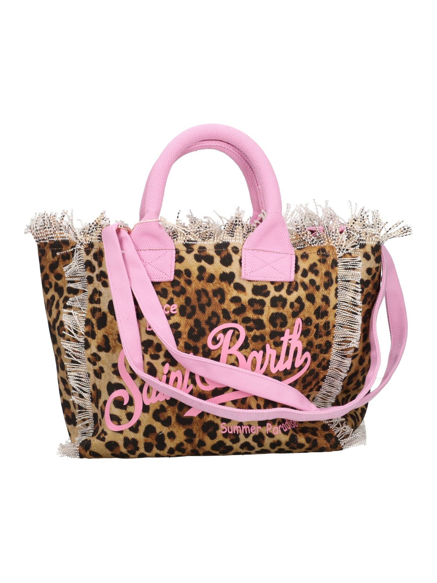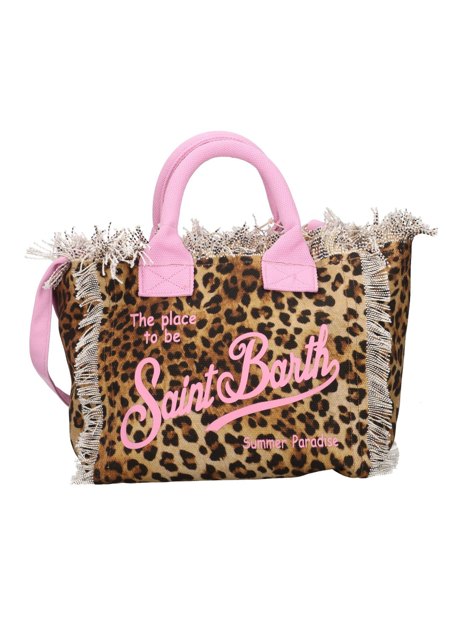 Borsa mare Colette in canvas leopardata MC2 Saint Barth con texture compatta e manici corti strutturati. Logo script Saint Barth sul fronte realizzato con micro strass luminosi che creano un effetto grafico raffinato. Profili sfrangiati lungo i bordi aggiungono un tocco dinamico al volume squadrato. Tracolla coordinata in tessuto completa il design e valorizza la silhouette essenziale della shopper.