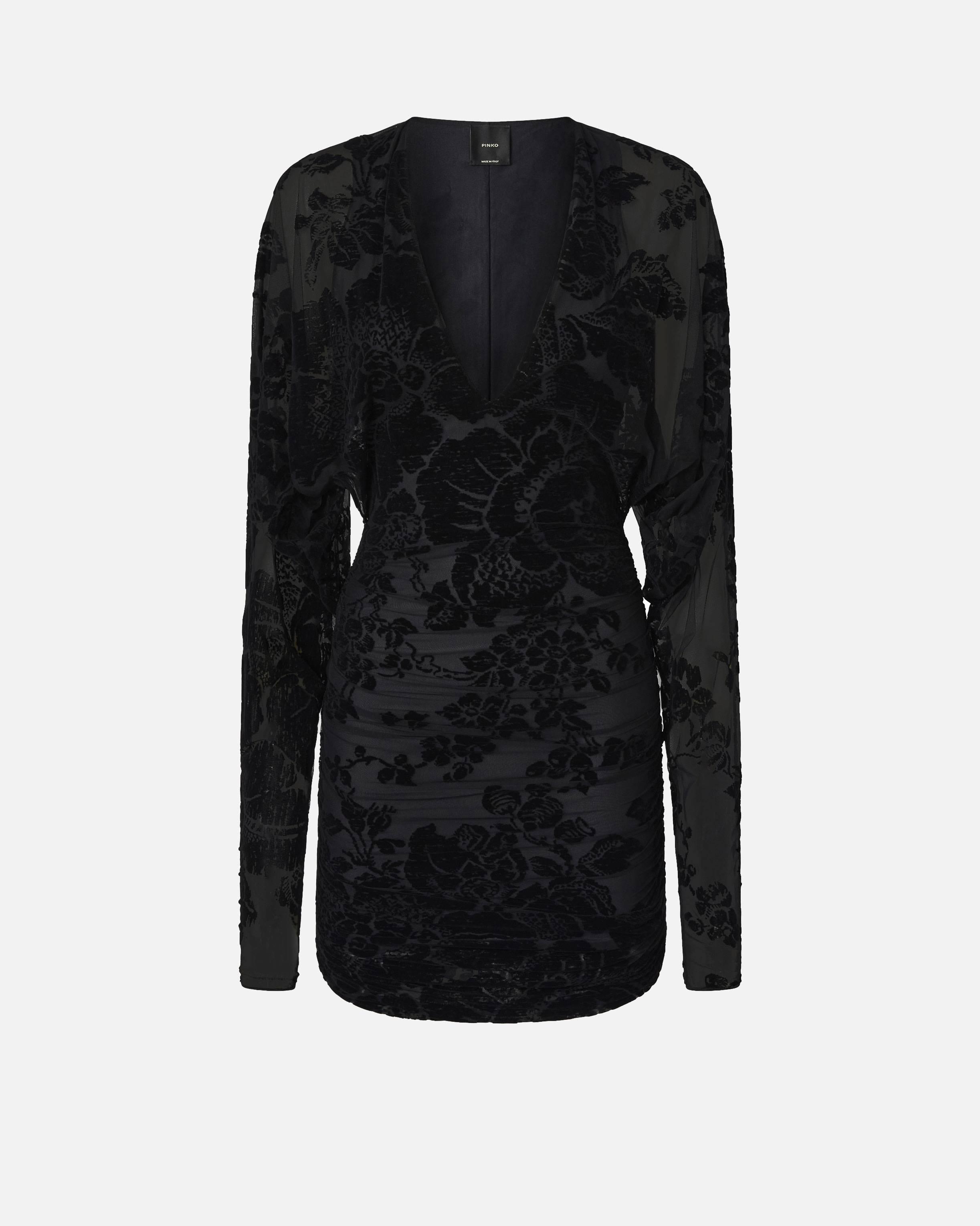 Abito corto e aderente con scollo a V realizzato in tulle con stampa, ispirato ai motivi tapestry ma con un twist contemporaneo. Il tulle indemagliabile è un tessuto particolarmente resistente, che è stato sottoposto a uno speciale trattamento che consente alla maglia di non sfaldarsi in caso di rottura. L'effetto dévoré è ottenuto tramite una stampa flock che esalta il disegno floreale ricco di ramage e dettagli intricati, creando un gioco sofisticato che conferisce alla superficie profondità e una sensazione di tridimensionalità. Il contrasto tra la morbidezza della texture e la complessità del motivo floreale regala un impatto visivo e tattile di raffinata sensualità.