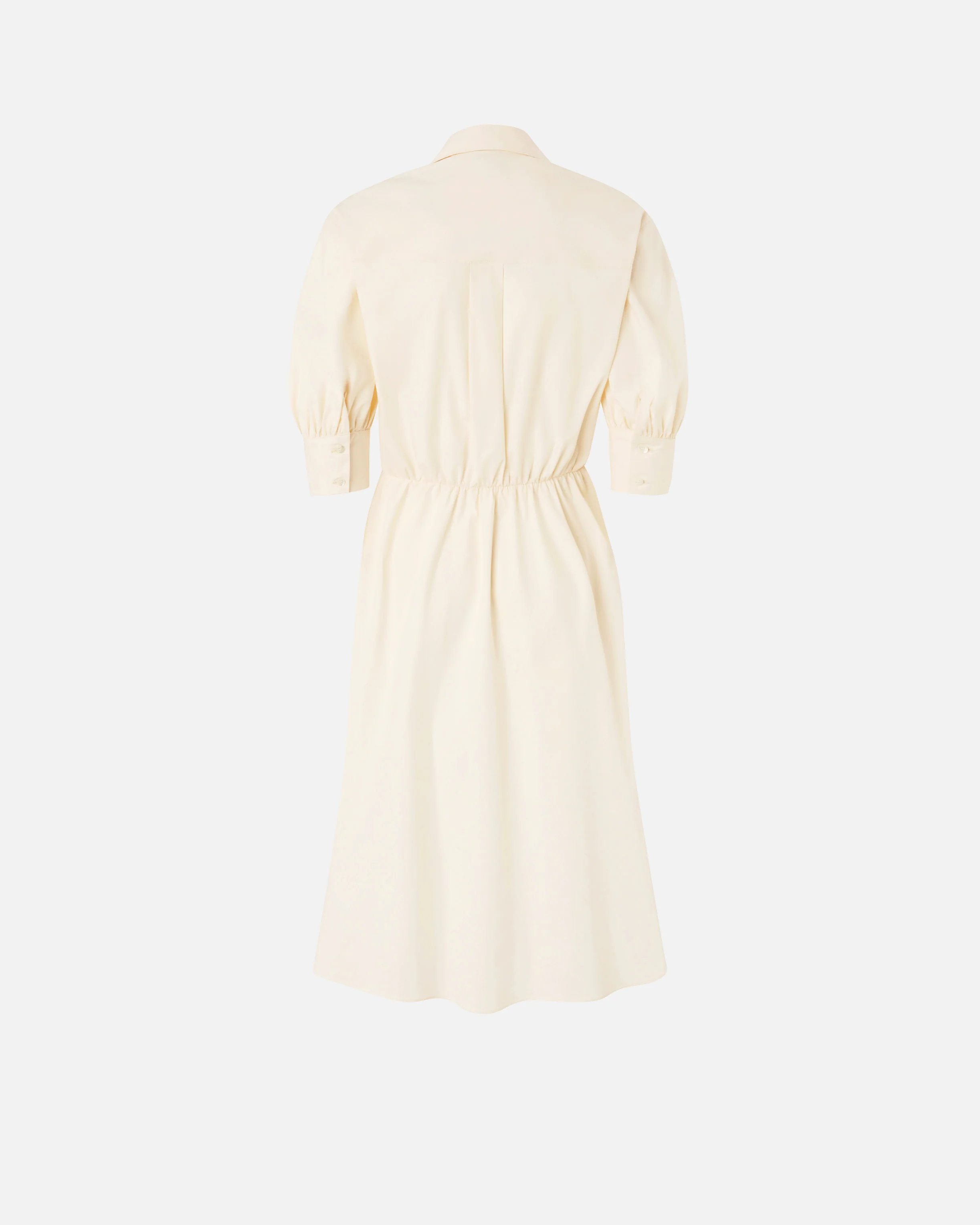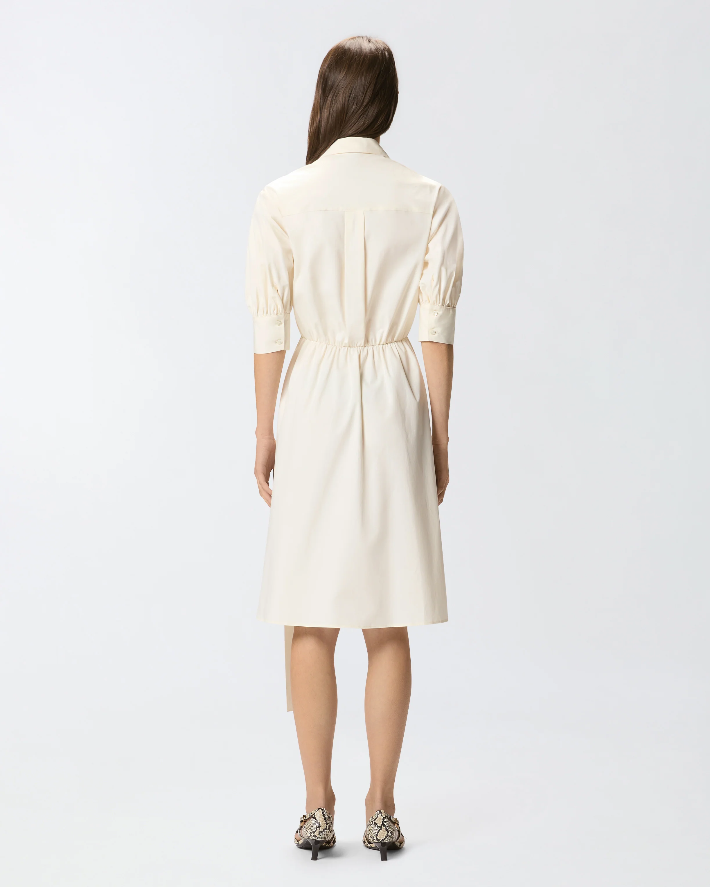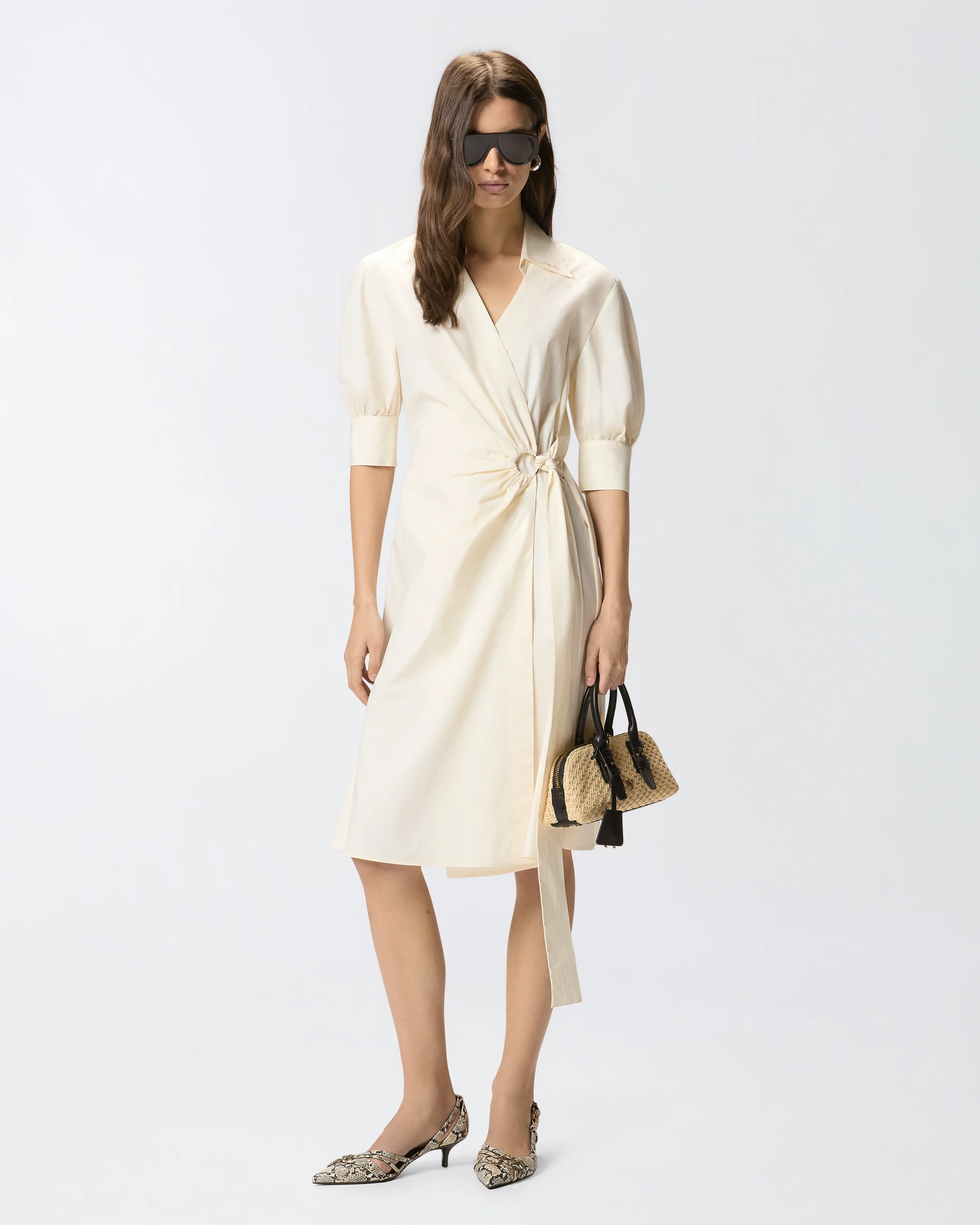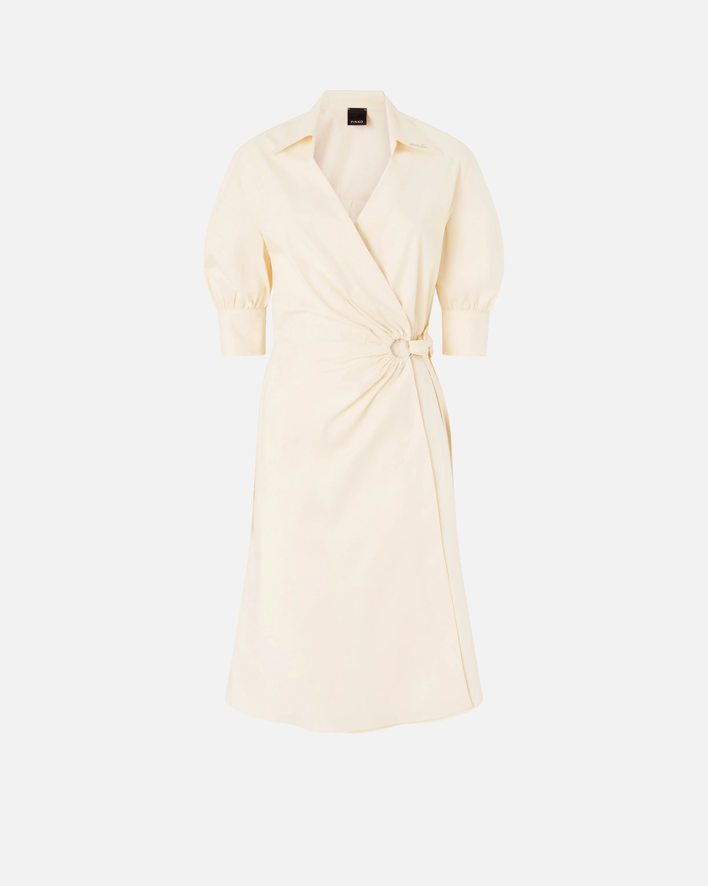 Abito midi con parte superiore definita da mezze maniche a palloncino con bottoni sul fondo e da un colletto a camicia con apertura a V e logo lettering PINKO ricamato in corsivo. Il capo si presenta in un popeline di cotone comfort dalla mano morbida ma compatta, ed è reso speciale dal design a portafoglio, che si chiude su un lato grazie al morbido nastro da infilare nel dettaglio ad anello. Il vestito, rifinito inoltre dalla vita elasticizzata e arricciata sul retro e dal raffinato carré posteriore con doppia piega, mostra una versatilità senza pari, perfetta per accompagnarti in diverse occasioni d'uso dalla mattina fino alla sera. - ALINE ABITO