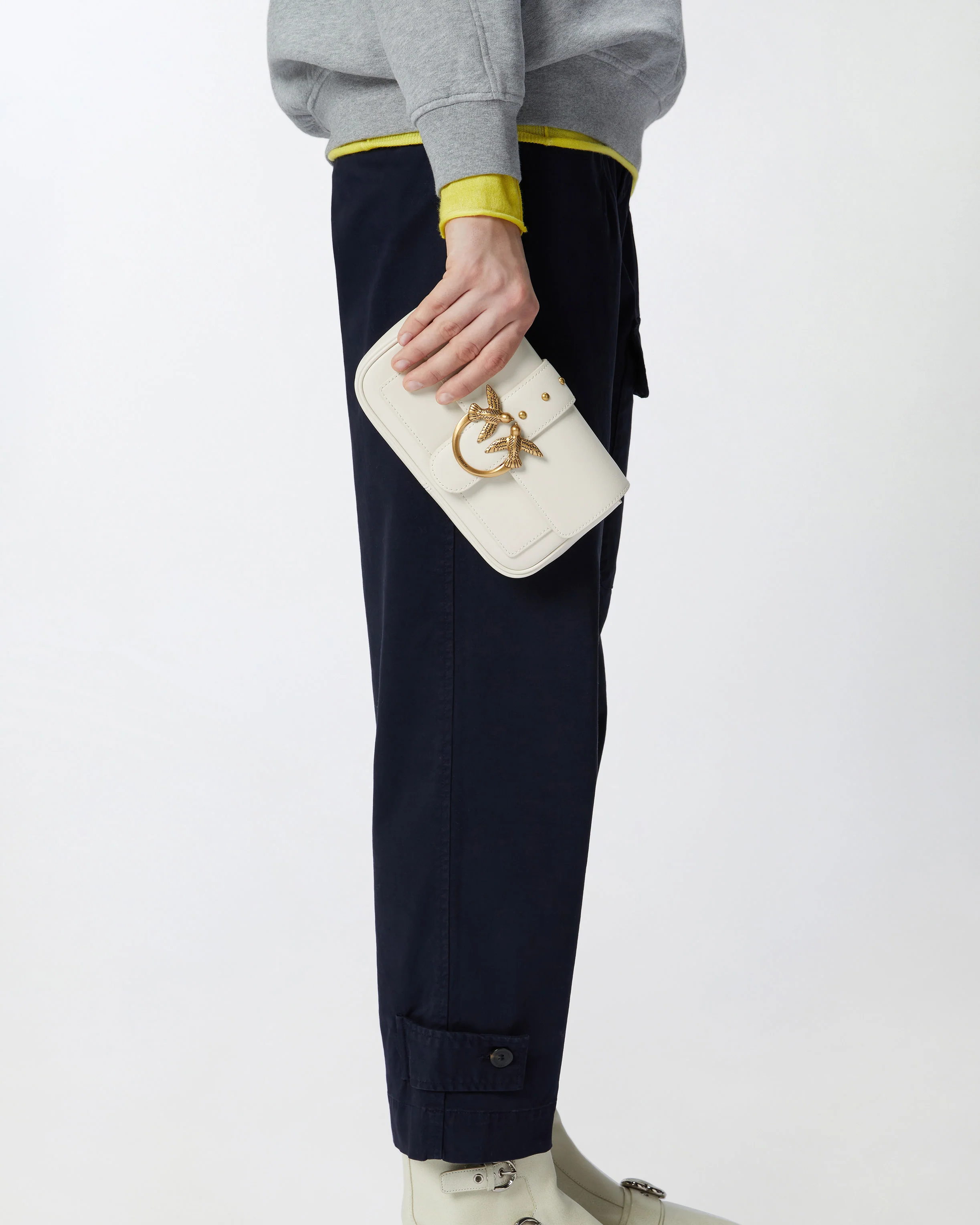 Pocket Love Bag One in morbida pelle mano seta. La chiusura con baccello in pelle e piccole borchie è completata da fibbia in metallo Love Birds Diamond Cut. L'interno è foderato in tessuto tecnico e comprende tasca con zip e spazi per carte di credito. Tracolla rimovibile a catena rotonda sottile in metallo. - LOVE ONE POCKET C