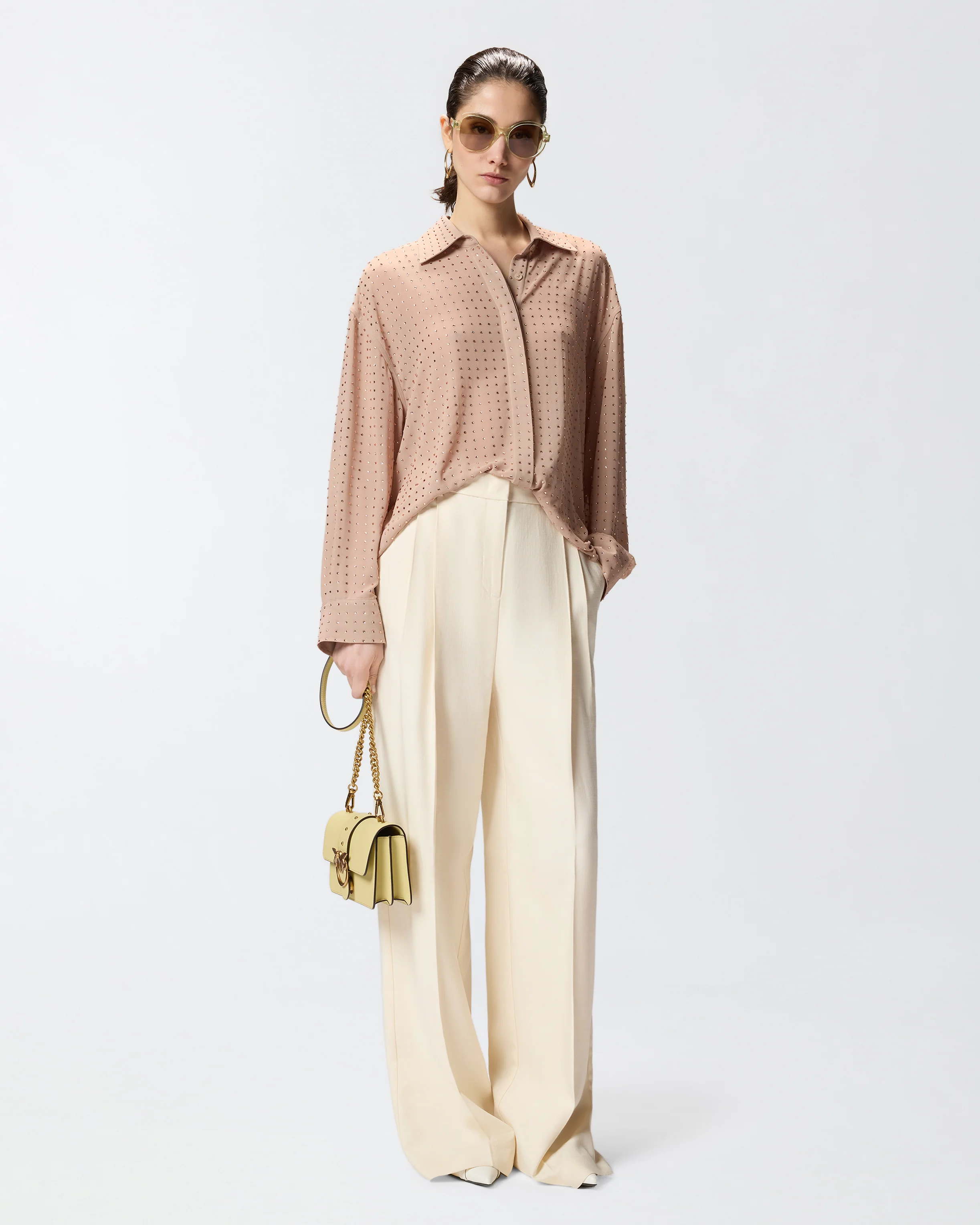 Camicia dalla linea dritta con parte superiore leggermente più voluminosa, dotata di colletto classico e maniche lunghe con spalla scesa e polsino. Il modello è realizzato in un tessuto georgette dal raffinato aspetto opaco che accompagna il corpo con delicatezza e permette di ottenere una silhouette fluida e leggera, ed è impreziosito da brillanti strass disposti su tutta la superficie del capo, perfetta espressione del DNA PINKO. La camicia è completata dalla chiusura frontale nascosta con soltanto il primo bottone visibile, per offrire un tocco di funzionalità discreta senza interrompere la continuità della decorazione. - OLIVA CAMICIA