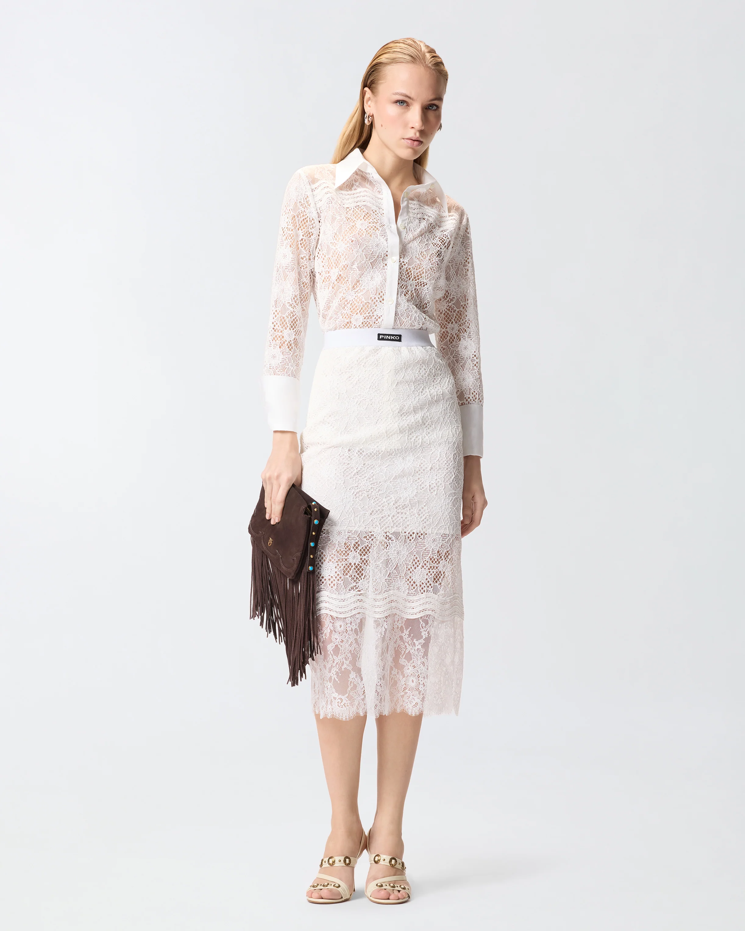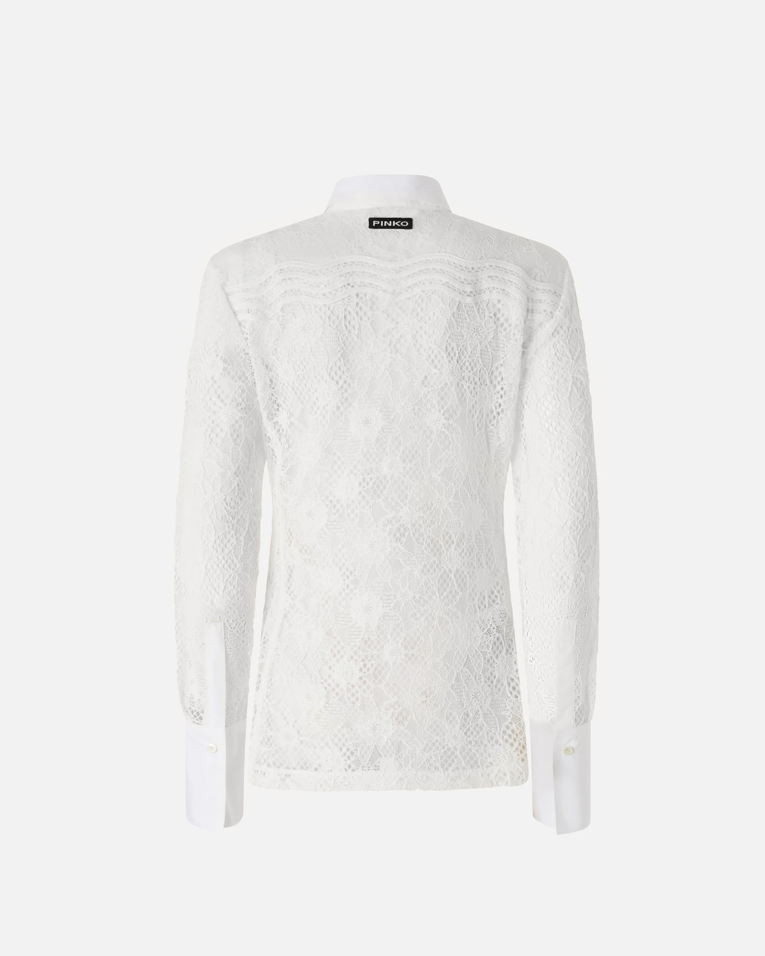 Camicia dal taglio classico dotata di maniche lunghe con polsino alto e bottone, fondo capo dritto e abbottonatura frontale a vista. Realizzato a partire da una base in tulle molto trasparente e impalpabile, il modello è interamente decorato da un elaborato mix di diverse tipologie di pizzo, ognuna caratterizzata da un aspetto unico: il pizzo rebrodé si distingue per l'effetto in rilievo, il pizzo chantilly, più fine e leggero, rifinisce le bordure, e il pizzo macramè impreziosisce le applicazioni ondulate della parte superiore. Il risultato è una camicia dall'aspetto tridimensionale e grafico che non rinuncia a un tocco di velata sensualità: indossala per look speciali o da sera con un paio di pantaloni sartoriali, oppure provala con dei jeans per un raffinato gioco di contrasti. - COLINE CAMICIA