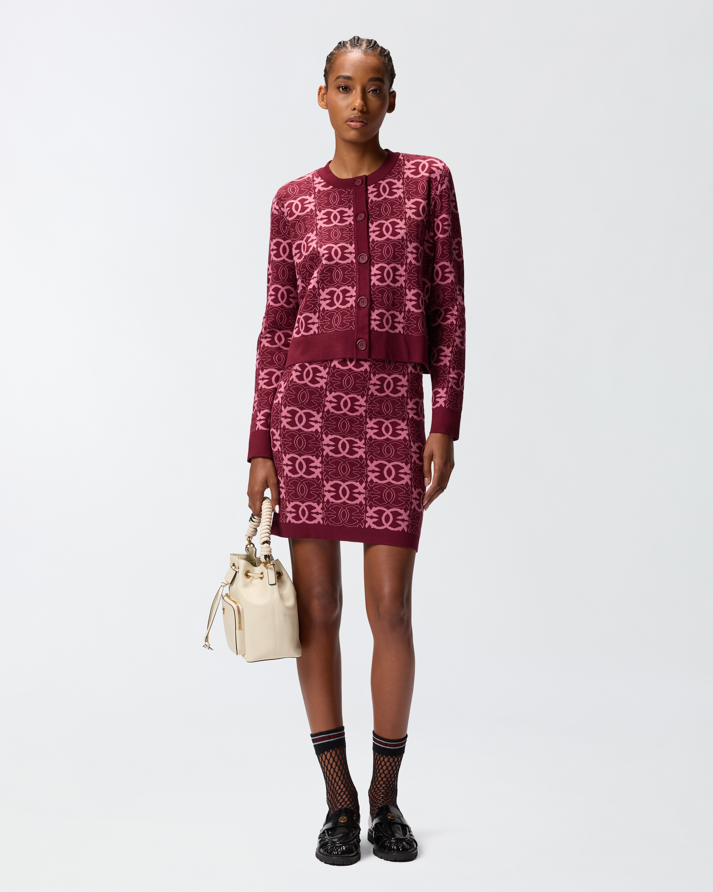 Cardigan girocollo in maglia a maniche lunghe con bottoni tono su tono e polsini, abbottonatura e scollo a contrasto. Il pattern logo Love Birds all over con lavorazione jacquard è un elemento d'impatto che arricchisce il modello. Abbina questo capo raffinato e versatile alla gonna coordinata della stessa collezione, per un look che non lascia nulla al caso. Il capo è stato sottoposto a prove di finissaggio per ridurre al minimo la possibile formazione di pilling, garantendo una maggiore morbidezza e durabilità del tessuto.