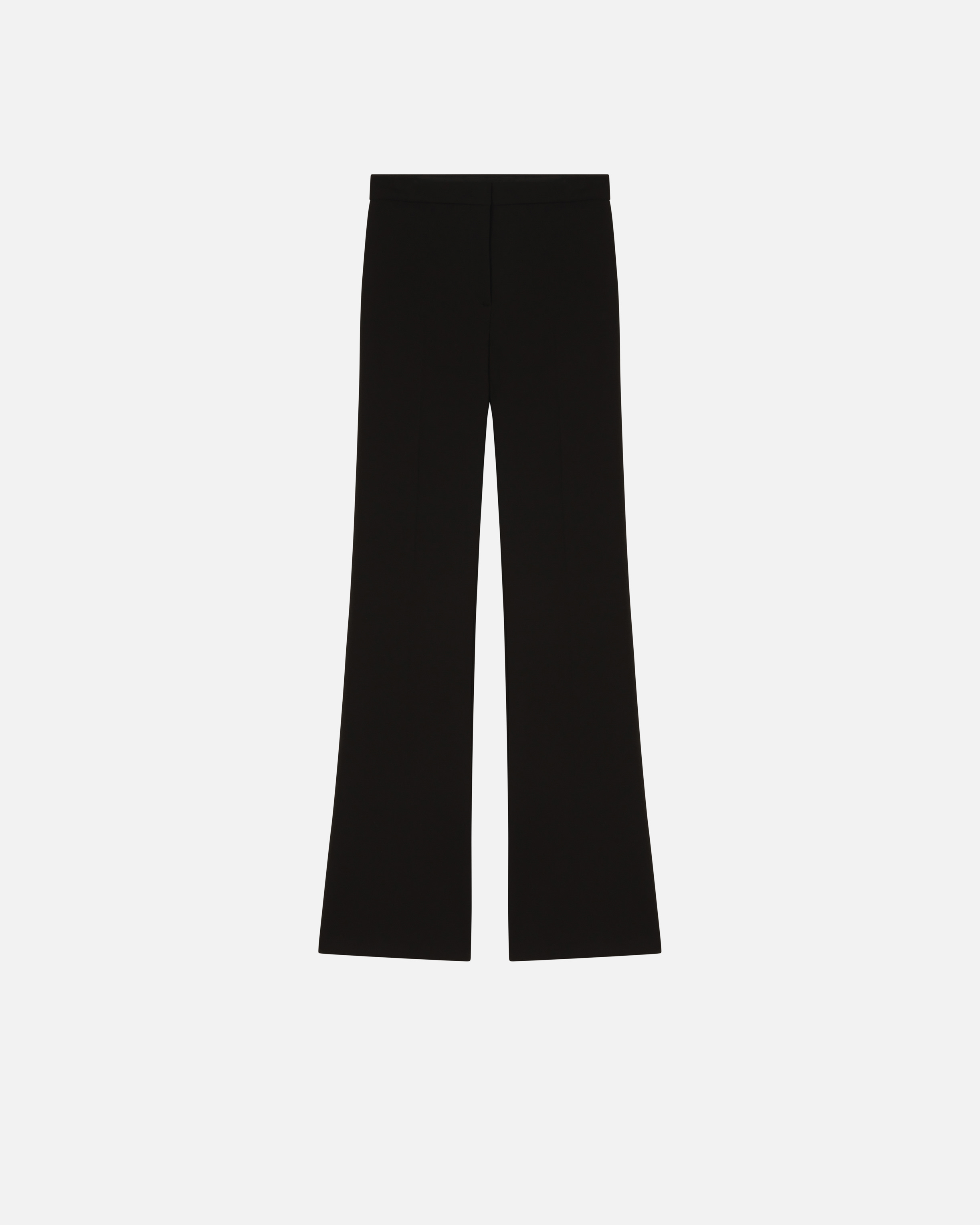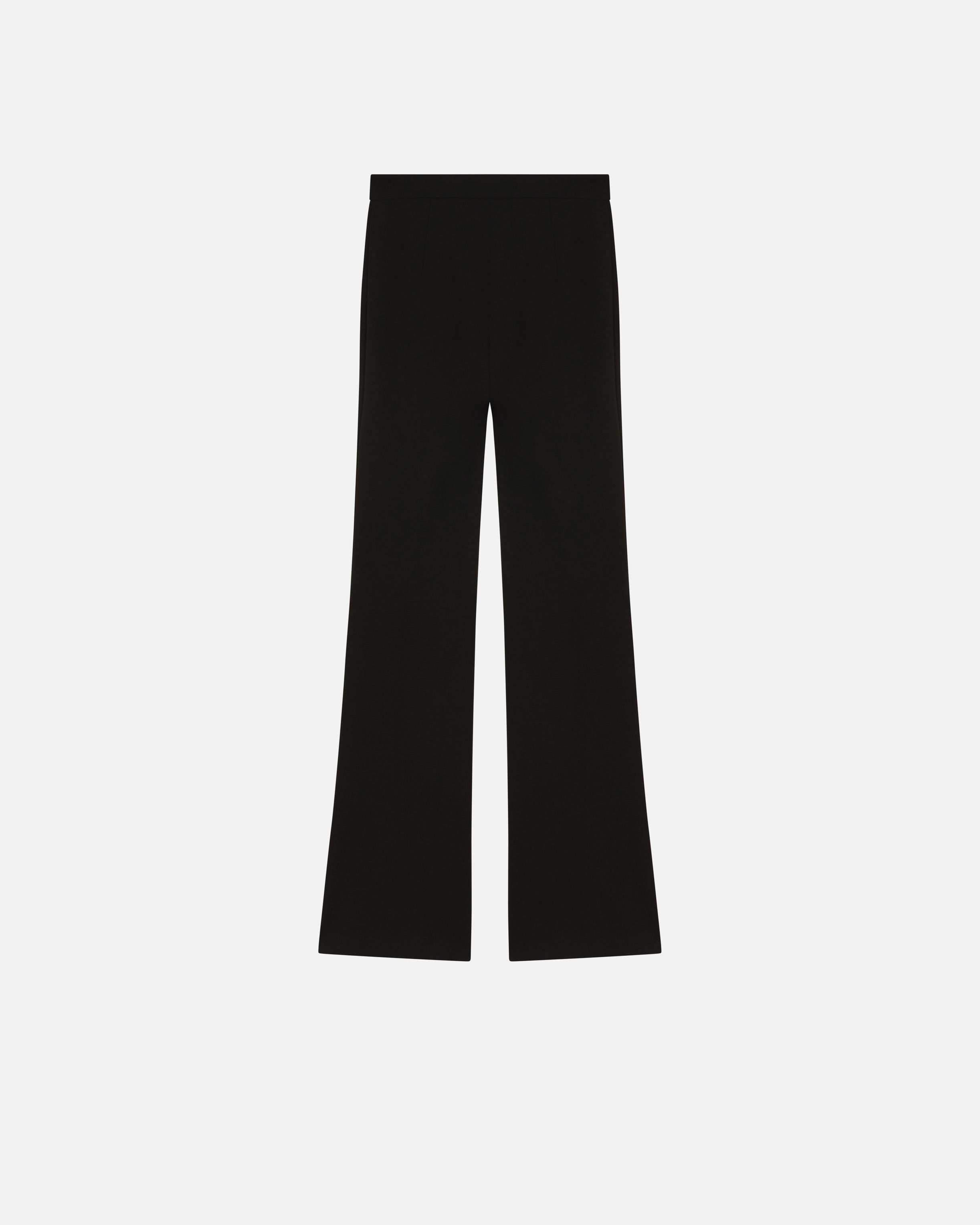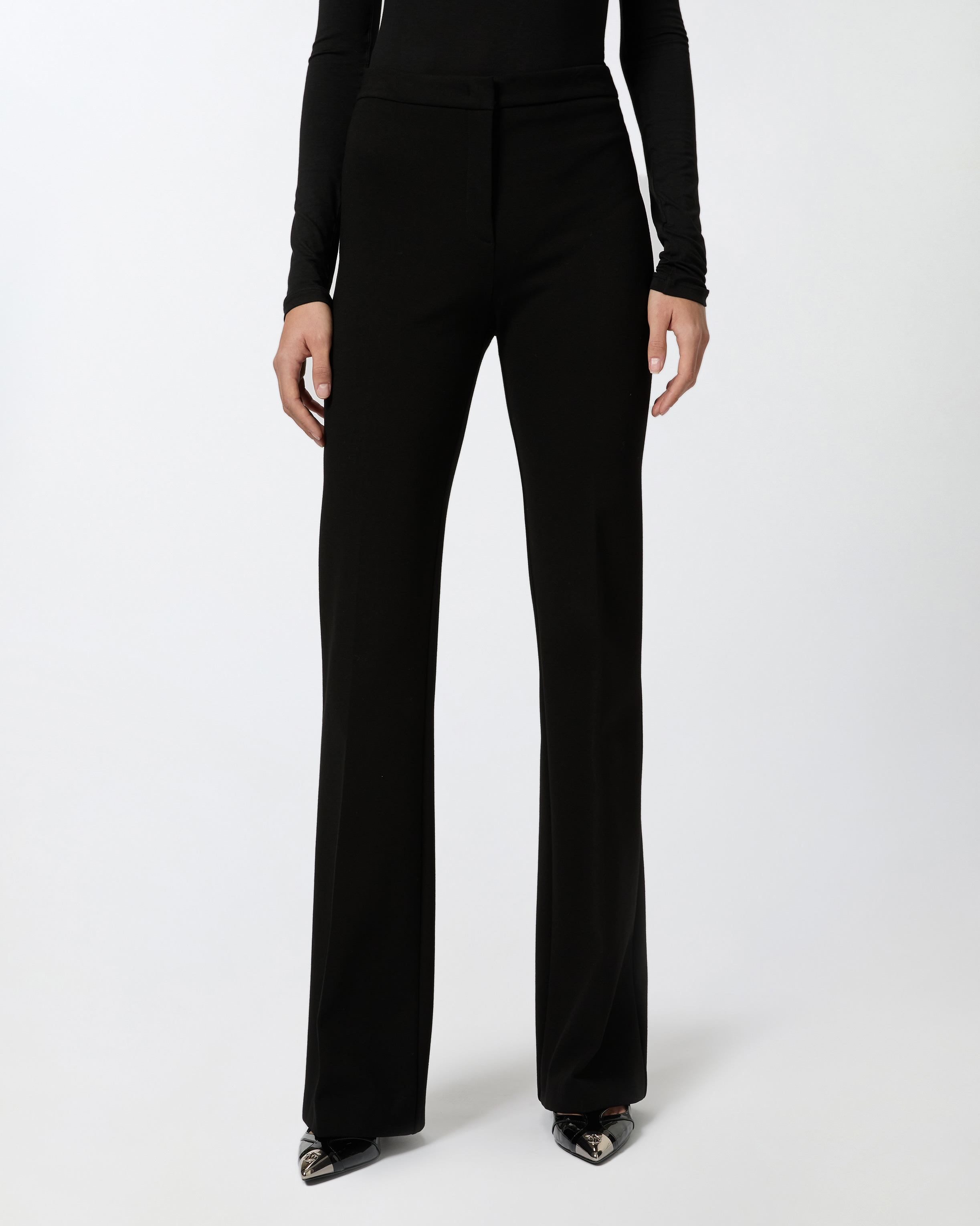 Pantaloni flare-fit in viscosa stretch lavorata a punto stoffa, un tessuto in maglia dal look laniero che risulta molto confortevole e performante, assicurando una mano compatta. Questo capo è caratterizzato dalla gamba di linea aderente fino al ginocchio e svasata verso il fondo, che costruisce la classica e iconica silhouette a zampa d'elefante, di ispirazione anni 70. Chiusura con zip e piccolo gancio. Elegante e versatile allo stesso tempo, questo modello è perfetto in qualsiasi occasione, grazie anche alla sua texture e alla sua vestibilità unica.