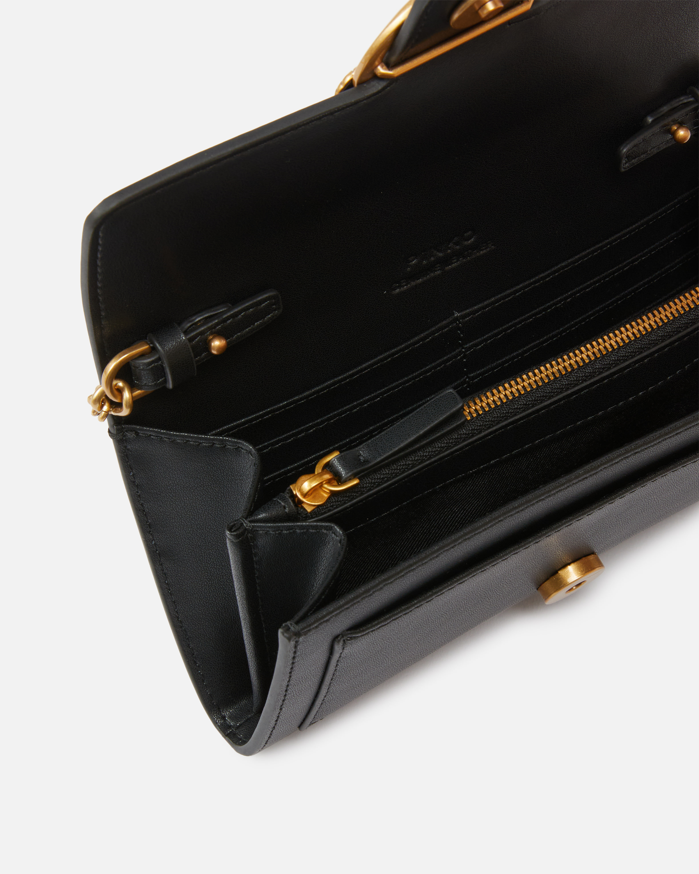 Portafoglio in pelle morbida Love Bag, dalla texture liscia, completo di tracolla sottile a catena metallica che permette di indossarlo come una borsetta da sera. La chiusura con baccello in pelle e piccole borchie è completata da fibbia in metallo Love Birds Diamond Cut. L'interno, foderato in tessuto tecnico, comprende una pratica tramezza con zip e spazi per carte di credito. Attiva la tua borsa PINKO: verifica l'autenticità del tuo prodotto e accedi all'esperienza personalizzata avvicinando il tuo smartphone al ricamo Love Birds che trovi sul retro della borsa!