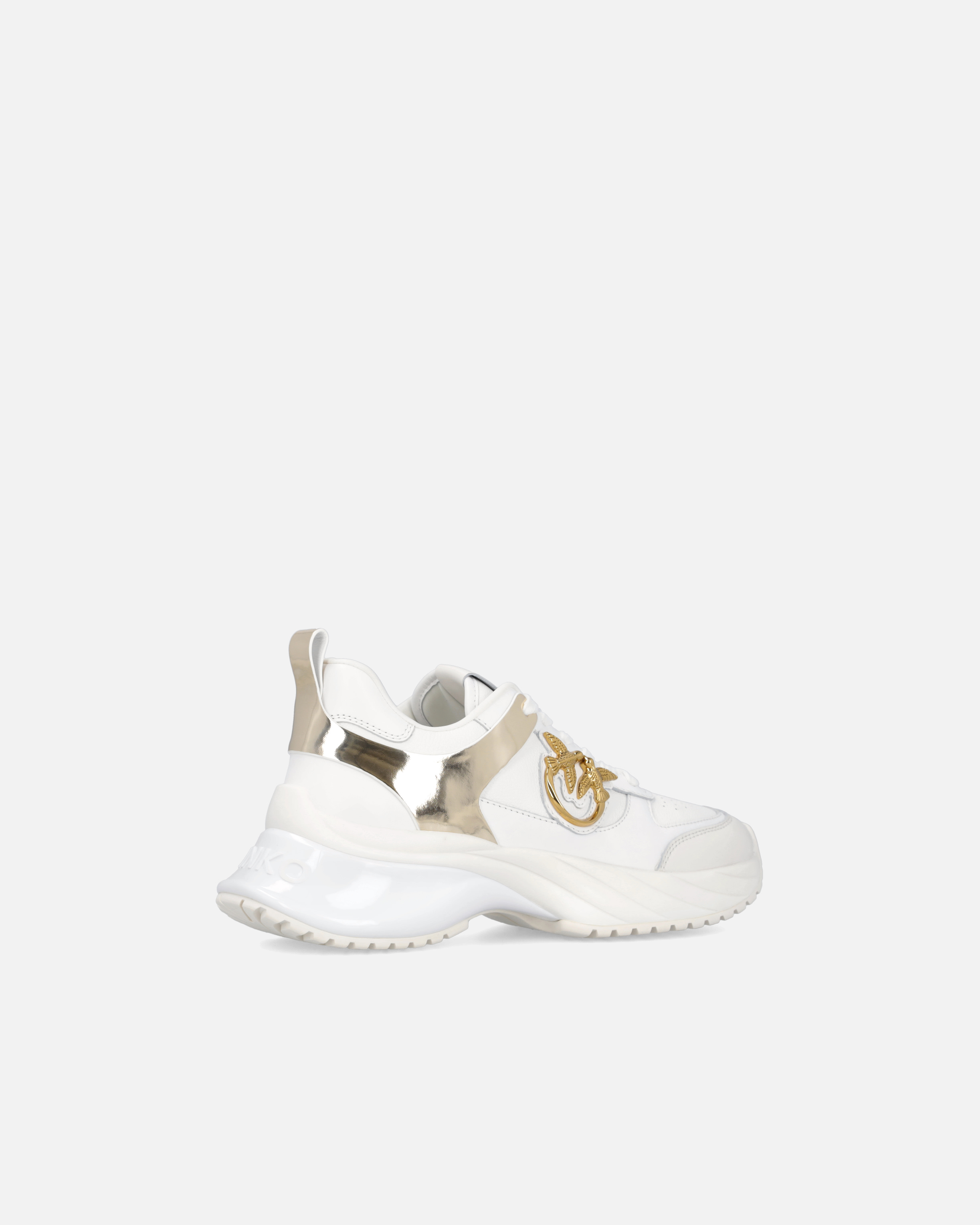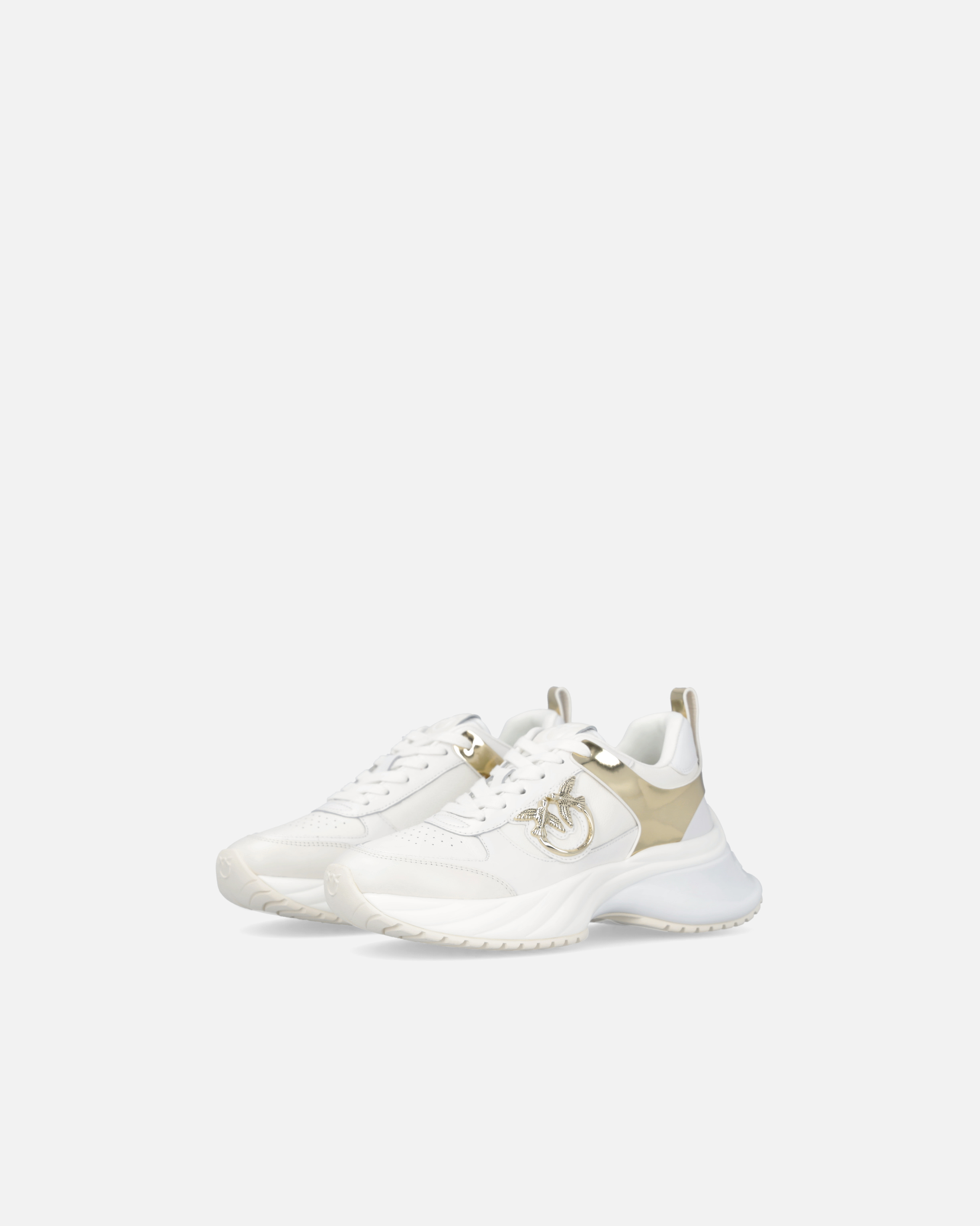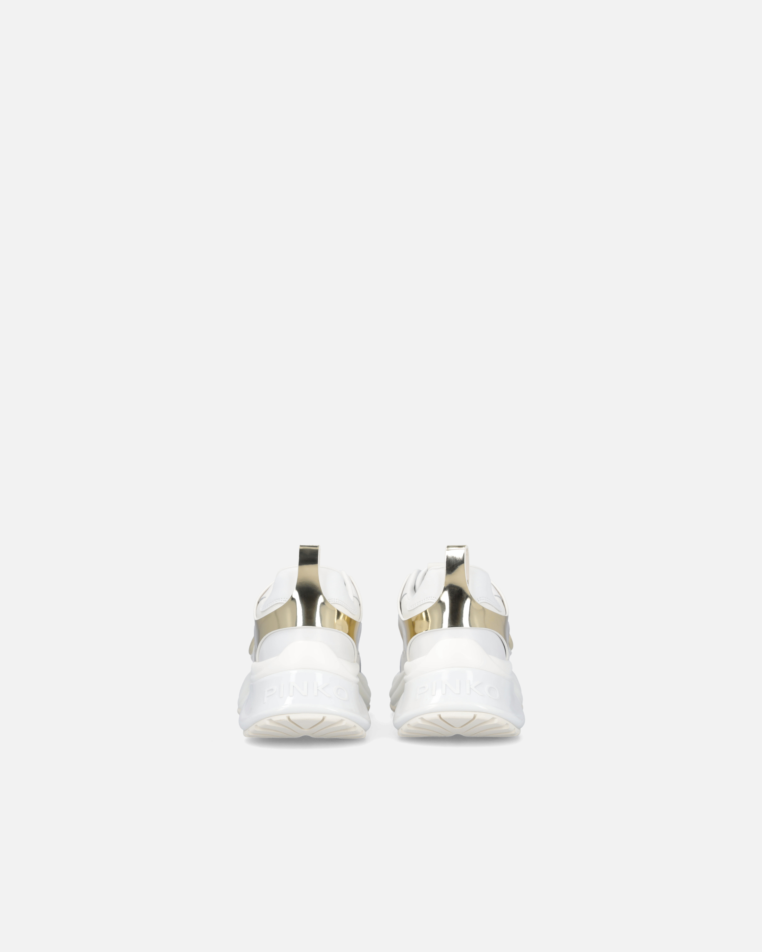 Scarpe da ginnastica da giorno realizzate in tessuto effetto pelle martellata e liscia personalizzate con inserto effetto specchio e logo Love Birds metallico, applicato sul lato esterno. Le sneakers sono un modello iconico della collezione, grazie alla suola running sagomata, alta 7 cm nel suo punto più alto, realizzata in materiale gommato con spoiler in TPU leggermente lucido e personalizzato con logo PINKO. La fodera in tessuto e la soletta interna in pelle completano le sneakers da donna che sono un vero must-have per la stagione, sia per i look casual che per quelli più formali.