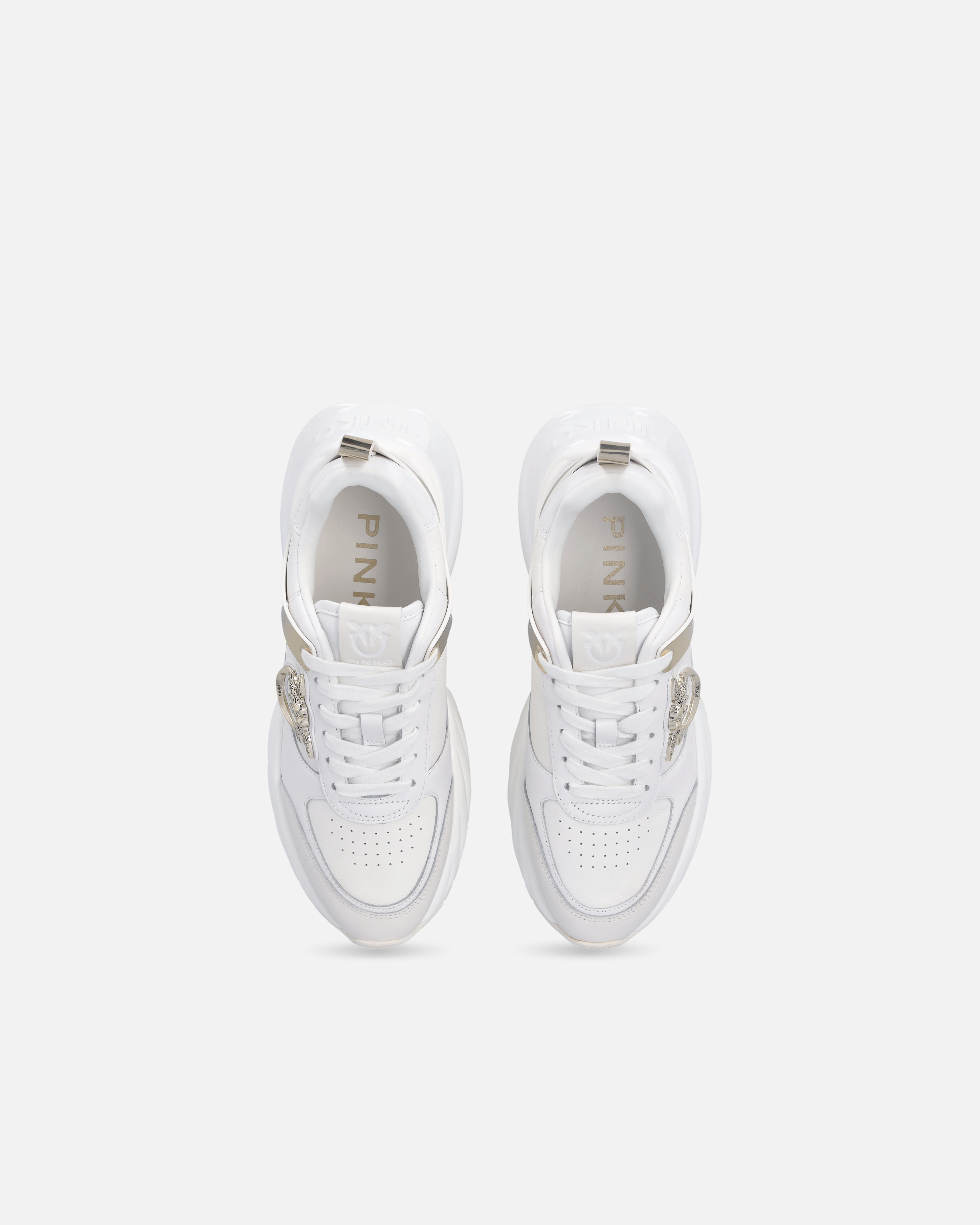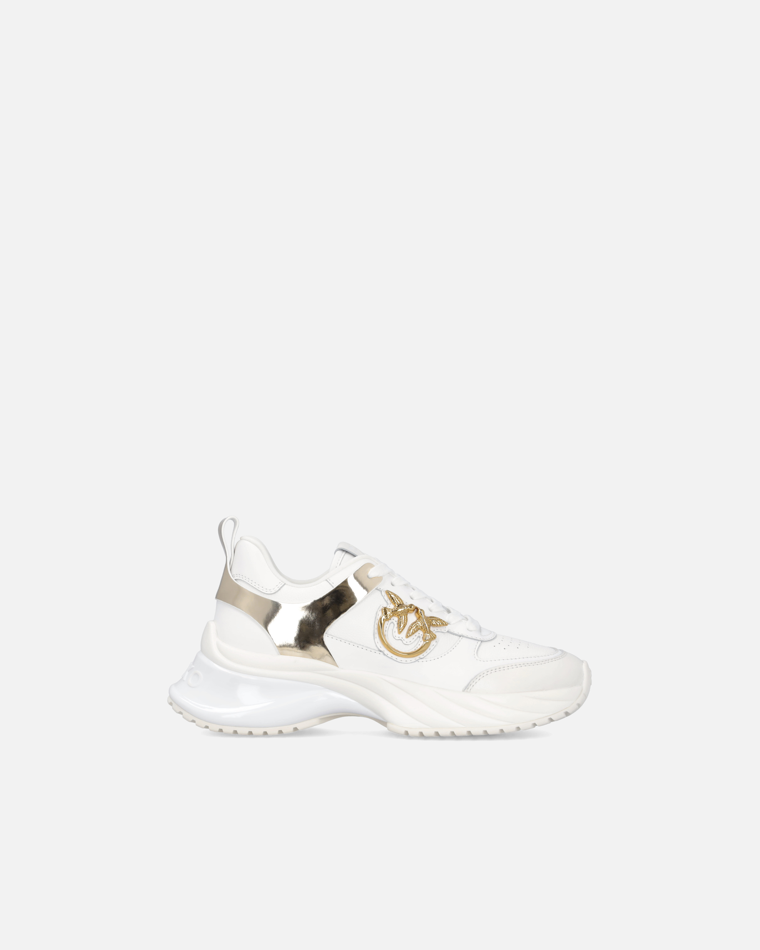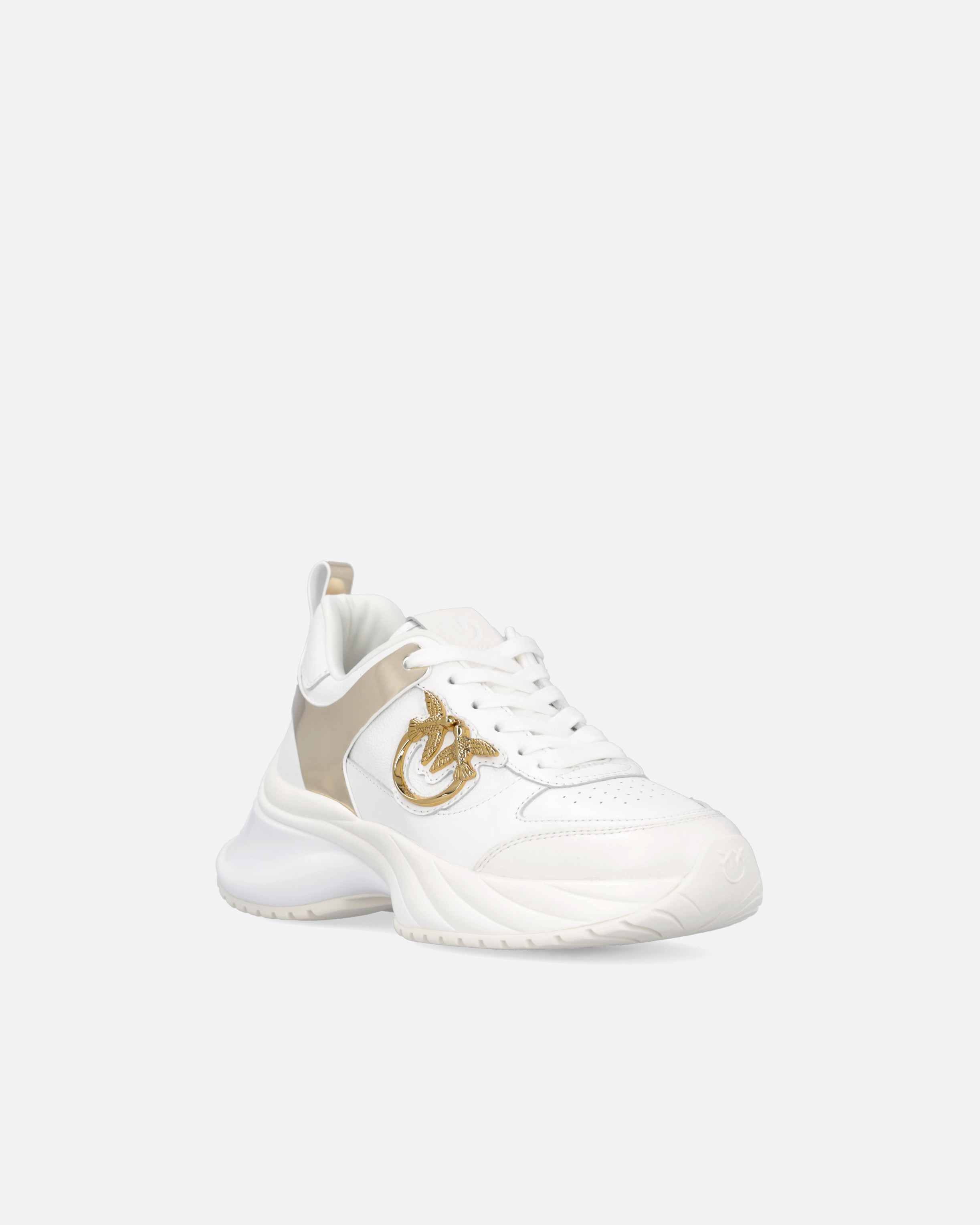 Scarpe da ginnastica da giorno realizzate in tessuto effetto pelle martellata e liscia personalizzate con inserto effetto specchio e logo Love Birds metallico, applicato sul lato esterno. Le sneakers sono un modello iconico della collezione, grazie alla suola running sagomata, alta 7 cm nel suo punto più alto, realizzata in materiale gommato con spoiler in TPU leggermente lucido e personalizzato con logo PINKO. La fodera in tessuto e la soletta interna in pelle completano le sneakers da donna che sono un vero must-have per la stagione, sia per i look casual che per quelli più formali.