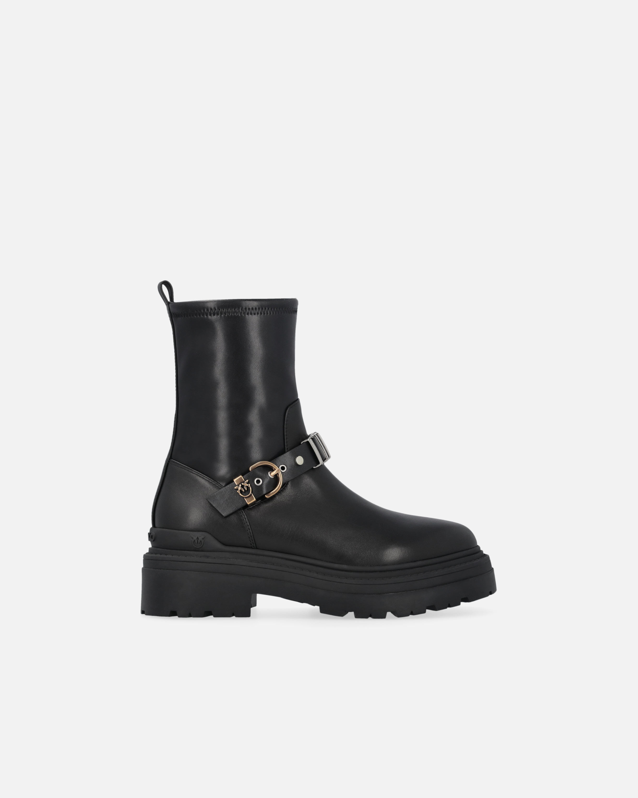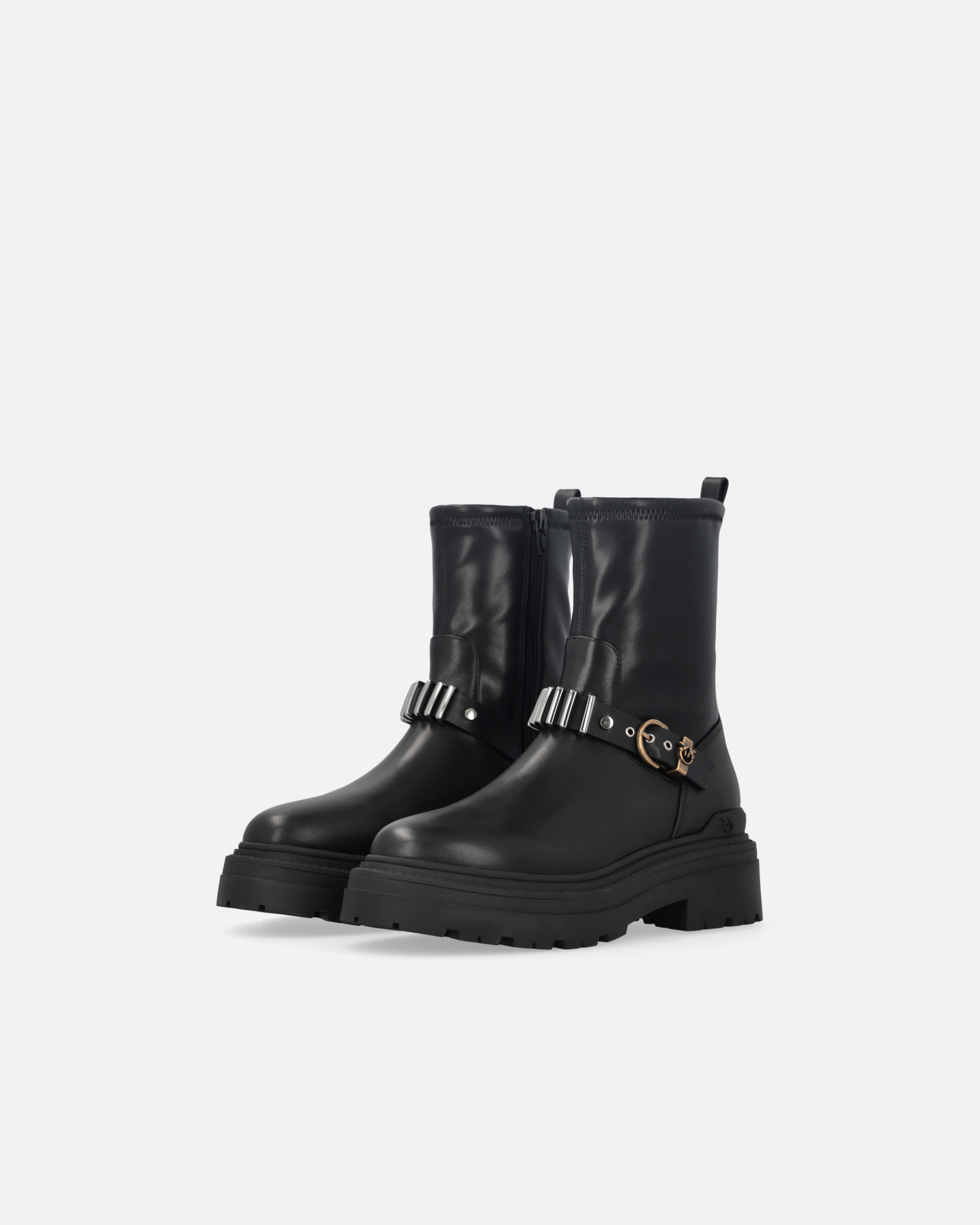 Stivaletti al polpaccio, realizzati in pelle liscia con suola in gomma alta 5,5 cm. Questo modello in nappa stretch si distingue per il suo design essenziale ma deciso, arricchito da dettagli metallici che ne accentuano la personalità. Il tirante posteriore facilita la calzata, mentre il cinturino frontale regolabile dotato di fibbia e passante metallico con logo Love Birds aggiunge un tocco rock e sofisticato. Sappiamo bene che sono i dettagli a fare la differenza: scegli questo modello per aggiungere un tocco di irriverenza ai tuoi look casual.