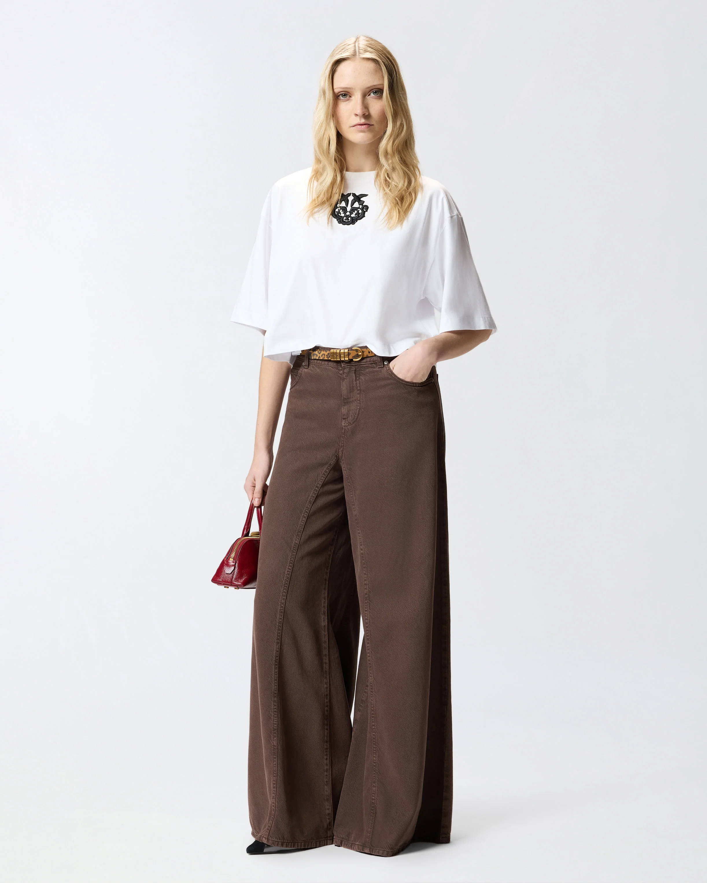 T-shirt cropped girocollo realizzata in fresco e morbido jersey di cotone stretch. Il capo presenta ampie mezze maniche con spalla scesa, ed è caratterizzato da un ricamo a contrasto sul petto con il logo Love Birds in stile texano. Pratico, originale e dallo stile unico: questo modello è destinato a diventare un vero e proprio passe-partout.
