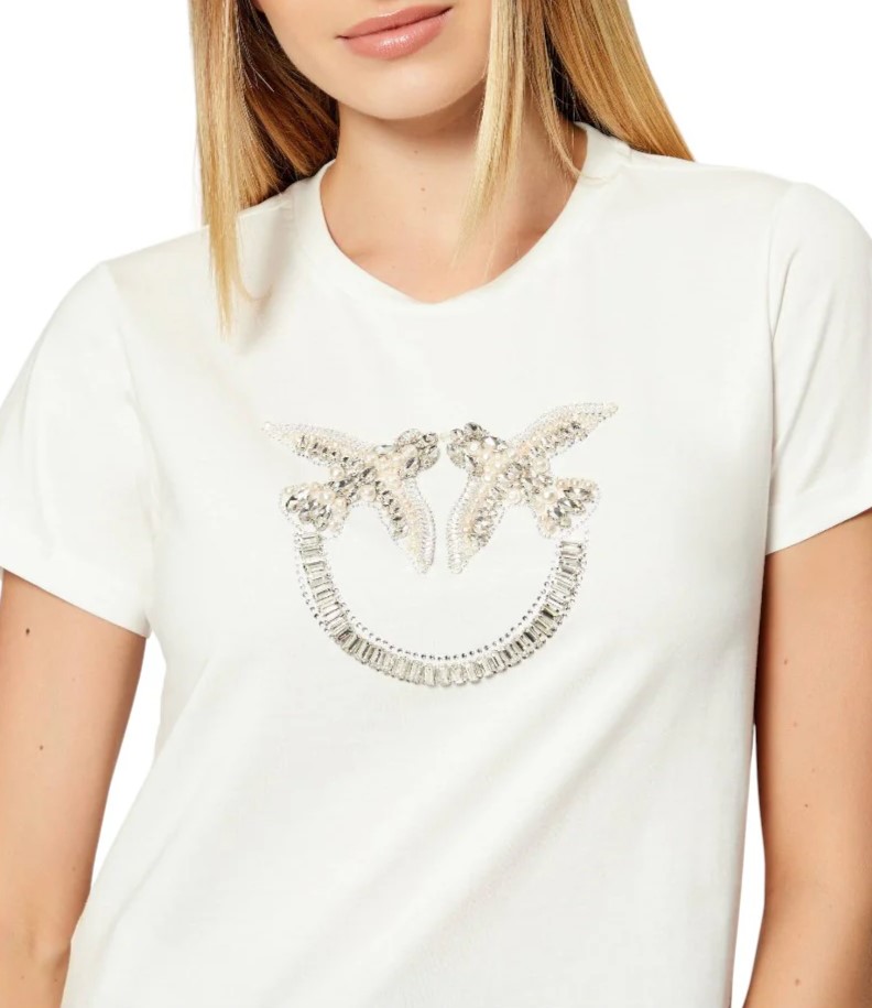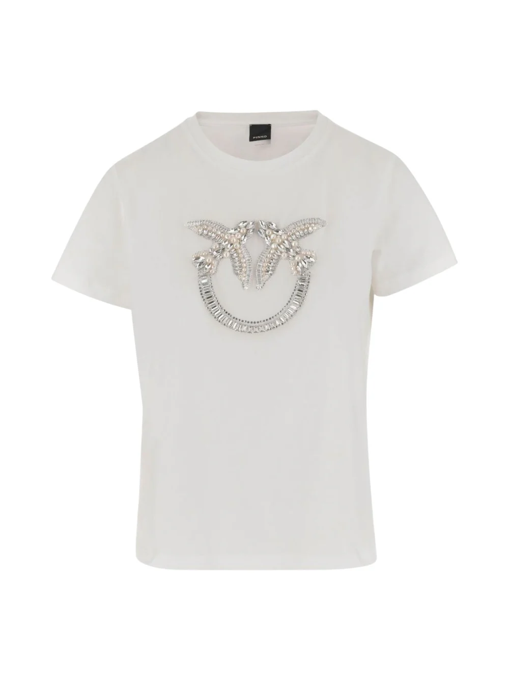 T-shirt a maniche corte in jersey di cotone. Il capo è impreziosito dal logo Love Birds decorato da un ricamo realizzato a mano composto di perle, catenina di cristalli con taglio baguette e strass di diversa forma fissati con apposite alette laterali per renderli più saldi. Questa maglietta è perfetta da indossare in qualunque occasione, dalle più formali alle più sporty, per un tocco femminile e iconico.