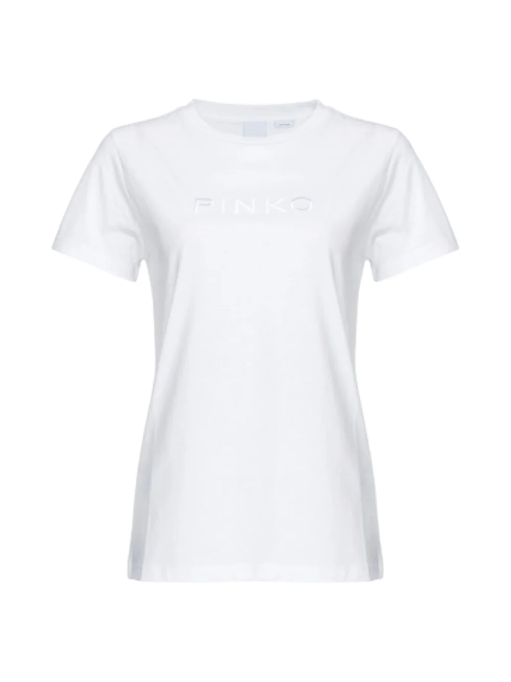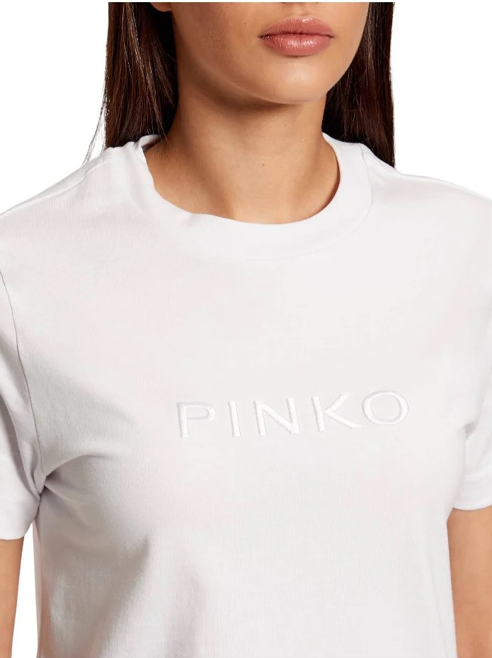 T-shirt a maniche corte dal taglio leggermente slim in jersey di cotone con ricamo logo PINKO davanti. Eleva l'eleganza e la femminilità di qualsiasi outfit grazie a questo top, che è il sottogiacca perfetto abbinato a pantaloni sartoriali, ma anche a un paio di jeans speciali.