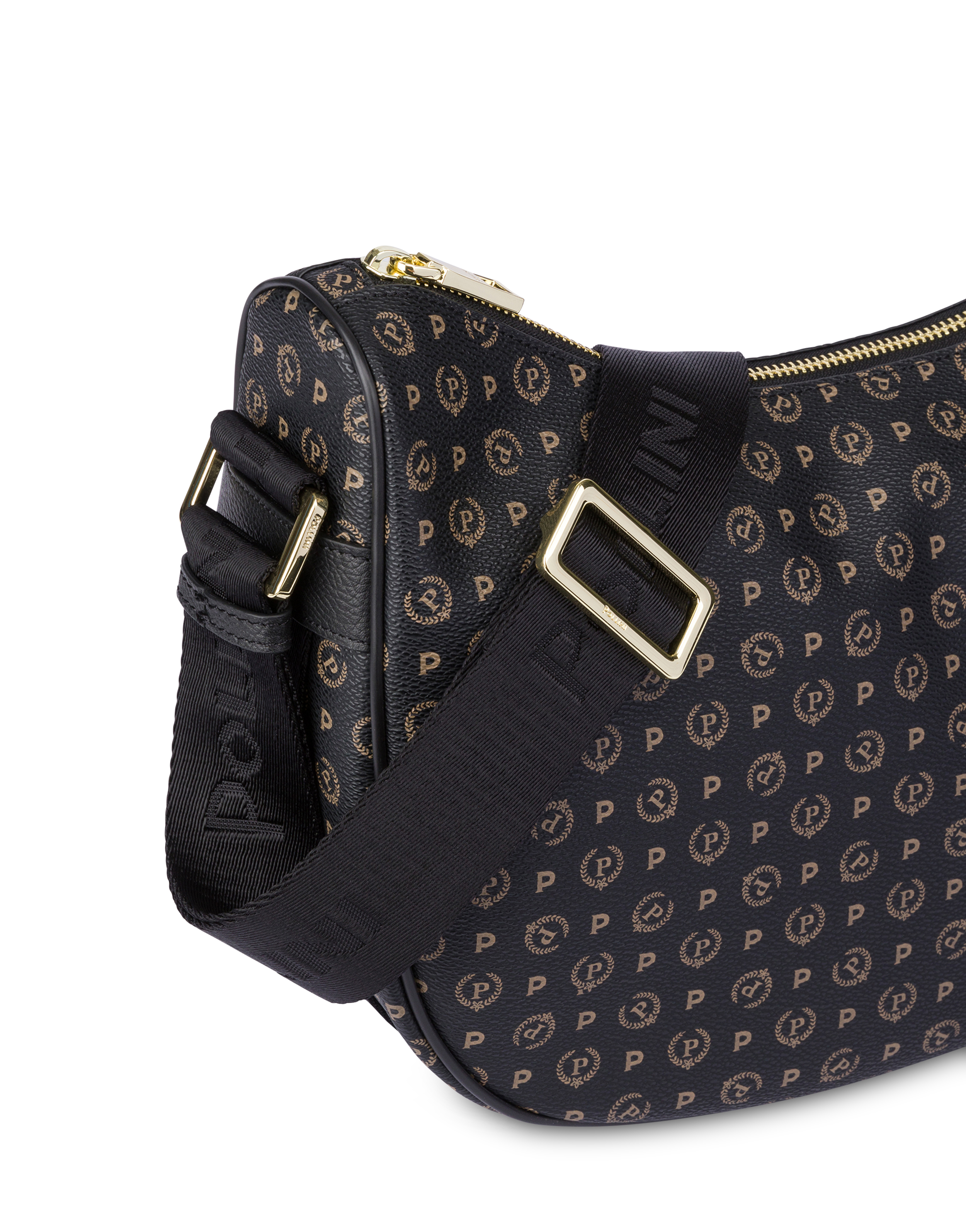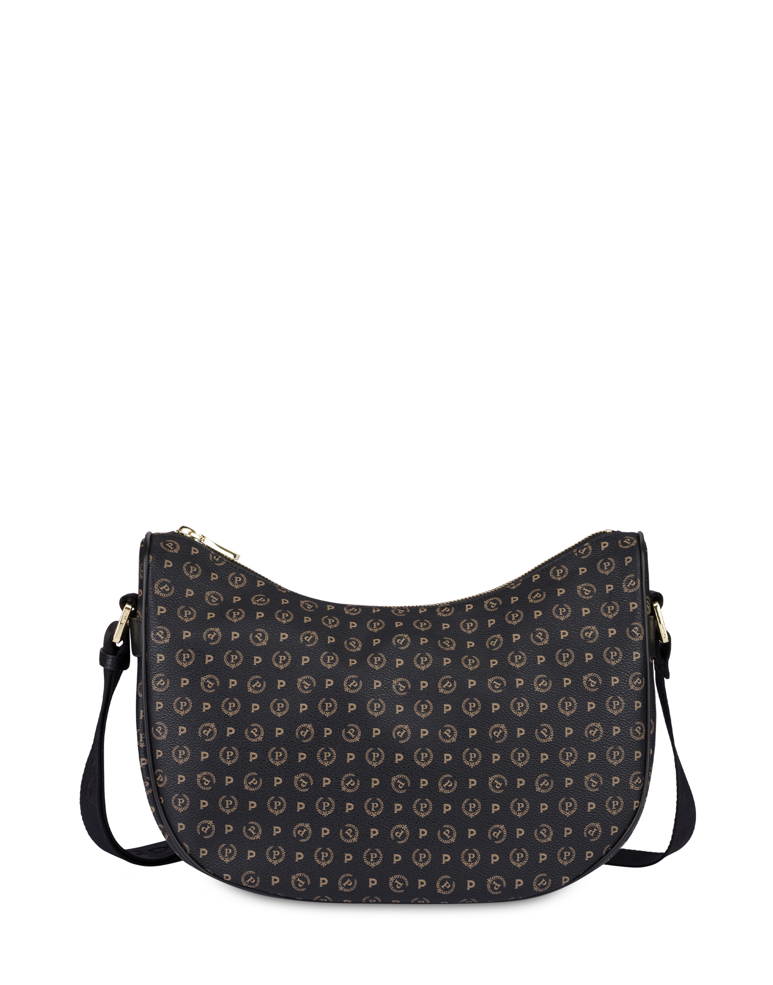 Hobo bag collezione Heritage PVC. L'iconico pattern all over dona un'allure elegante e senza tempo. Il nastro logato Pollini percorre tutto il fianco della borsa, trasformandosi in tracolla.