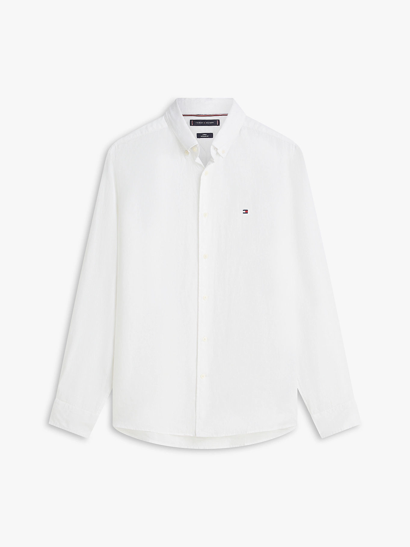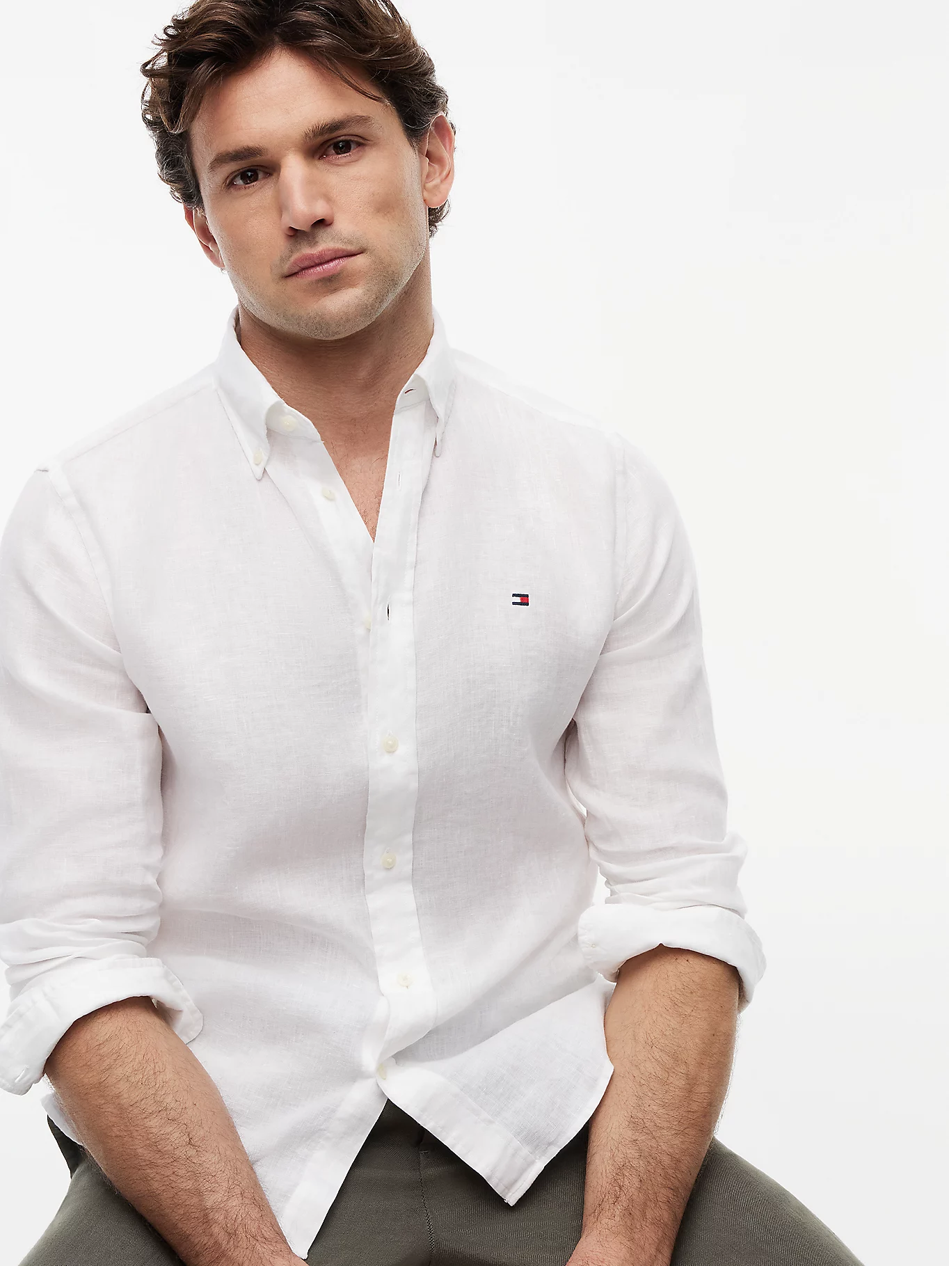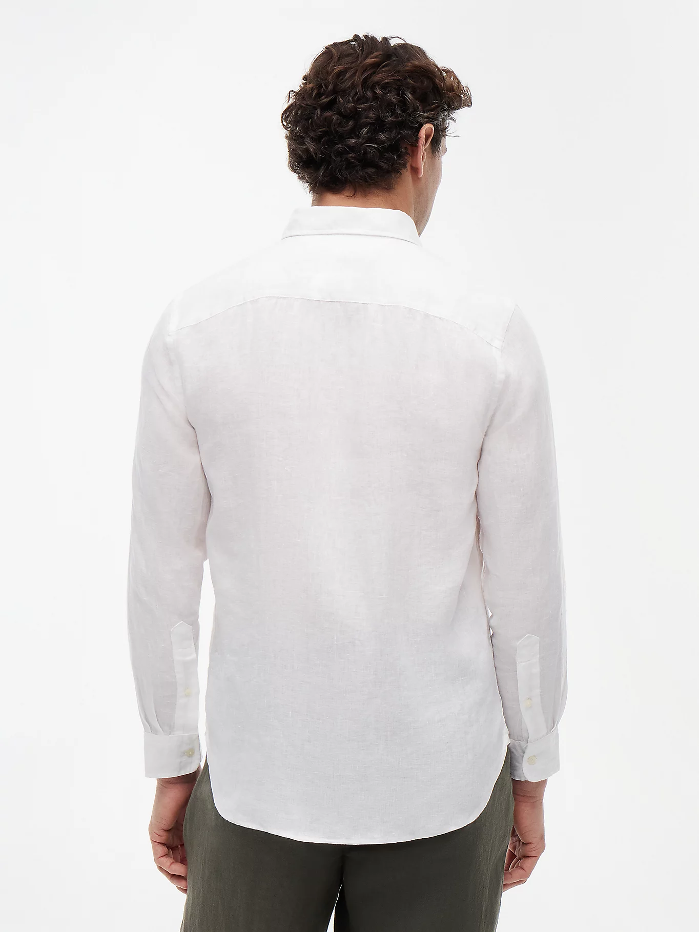 Sfoggia un look rétro grazie alla camicia in popeline di puro lino tinta con pigmenti, completata dal raffinato colletto button down e dalla bandierina ricamata.