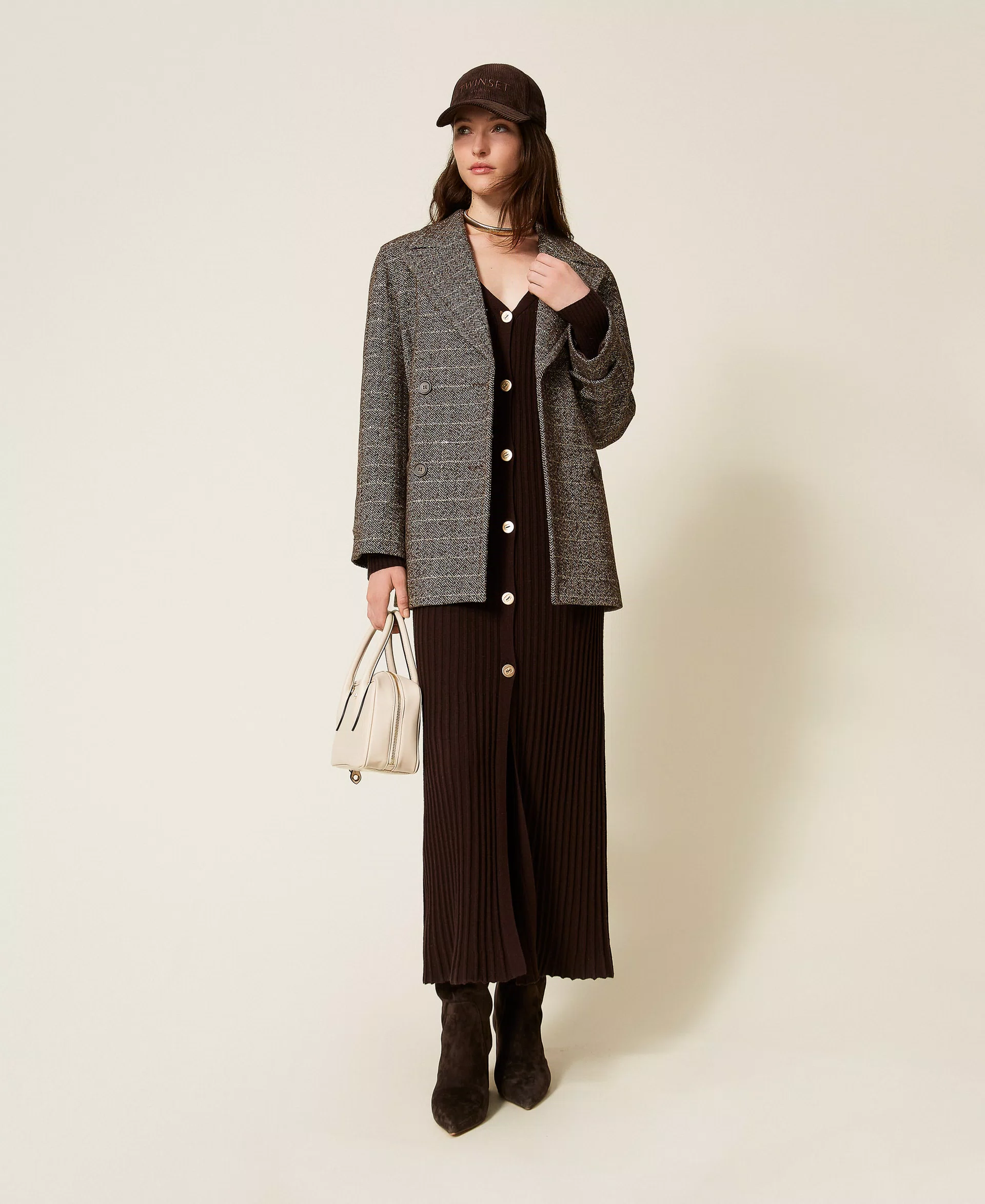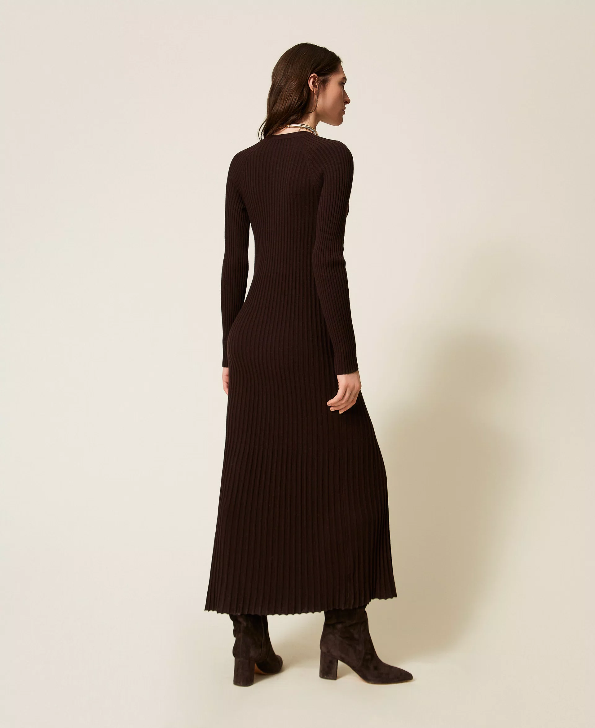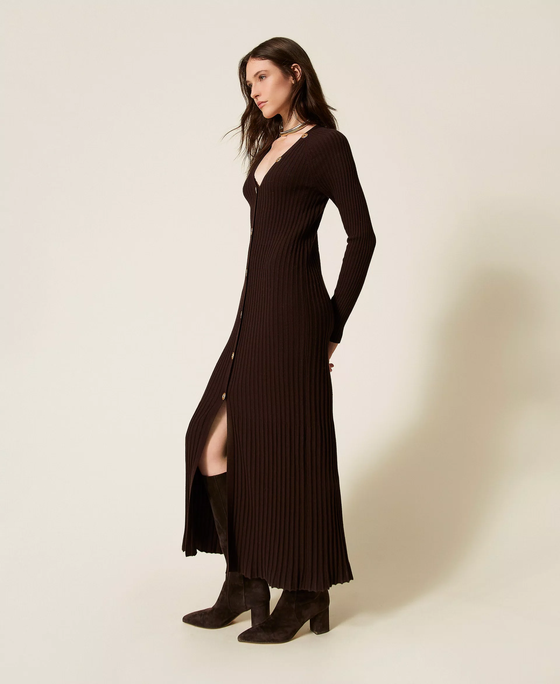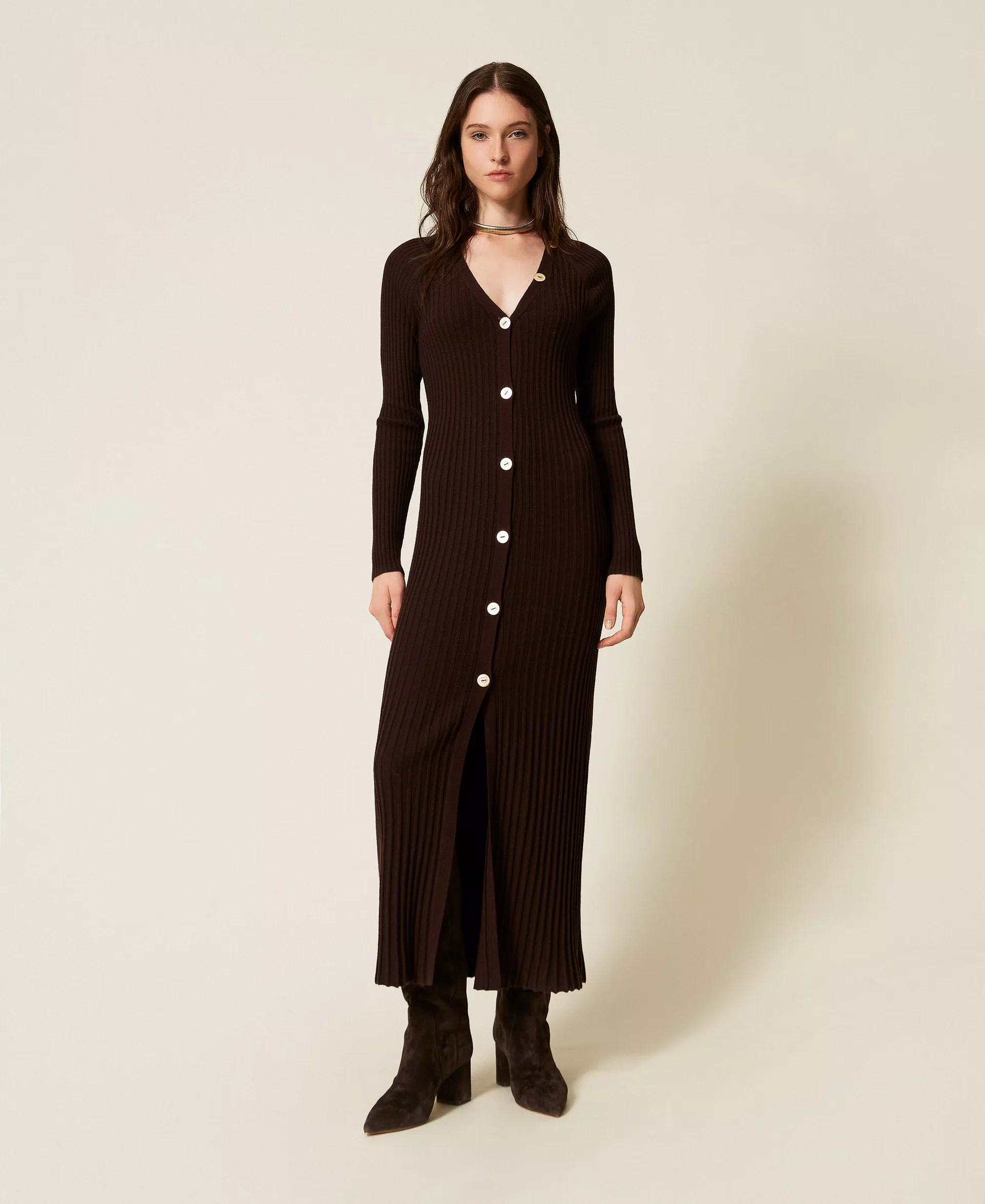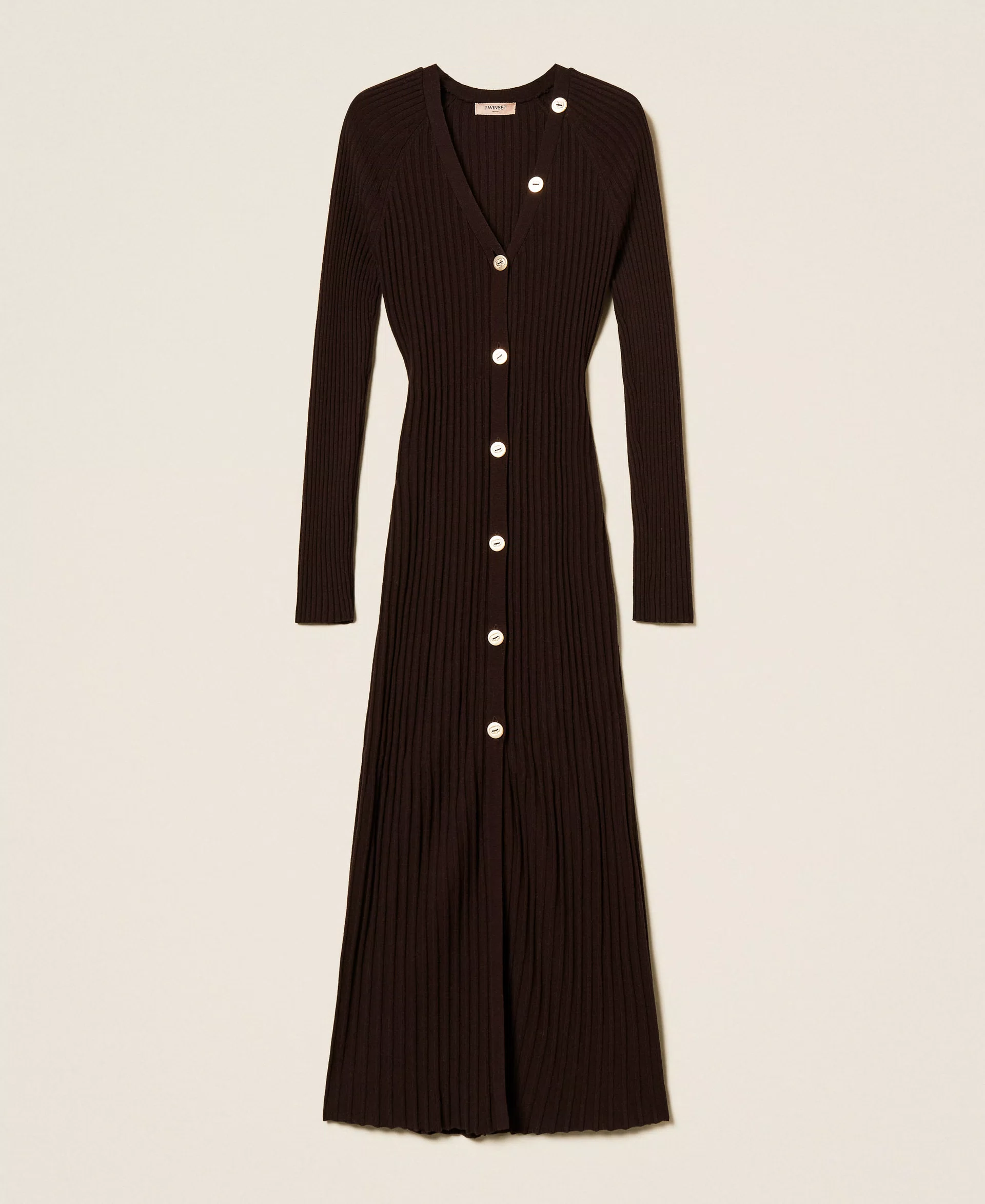 Maxi cardigan, indossabile anche come abito, in misto lana e viscosa con lavorazione a costine. Ha scollatura a V, maniche lunghe, chiusura con bottoni logati, placchetta logo Oval T sul retro, linea fitted.