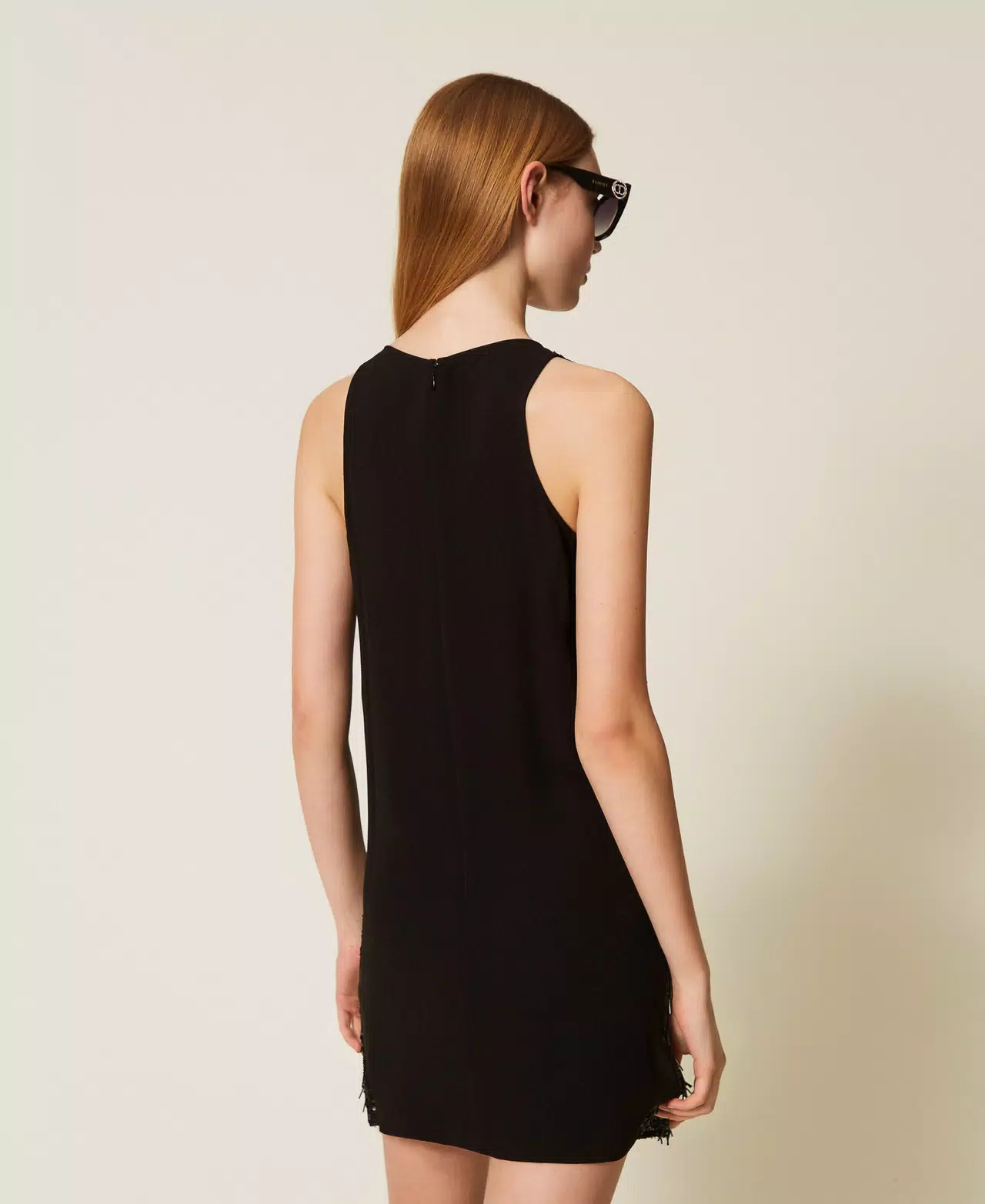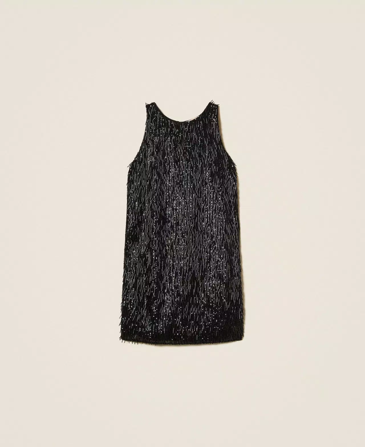 Abito corto in tessuto con frange di paillettes e canottiglie davanti e in georgette sul retro. Senza maniche, ha collo tondo, chiusura con zip invisibile e placchetta logo Oval T sul retro, linea morbida. Perfetto per party e cerimonie.