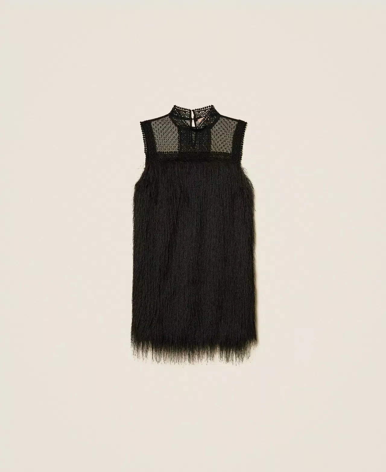 Abito corto in tessuto a frange con carré in tulle plumetis con passamanerie in pizzo applicate ai profili. Senza maniche, ha collo tondo, apertura a goccia con bottone sul retro, fodera e linea dritta.