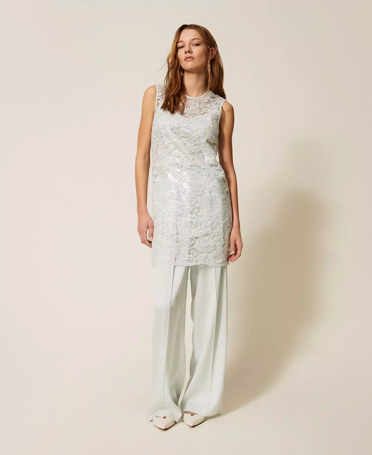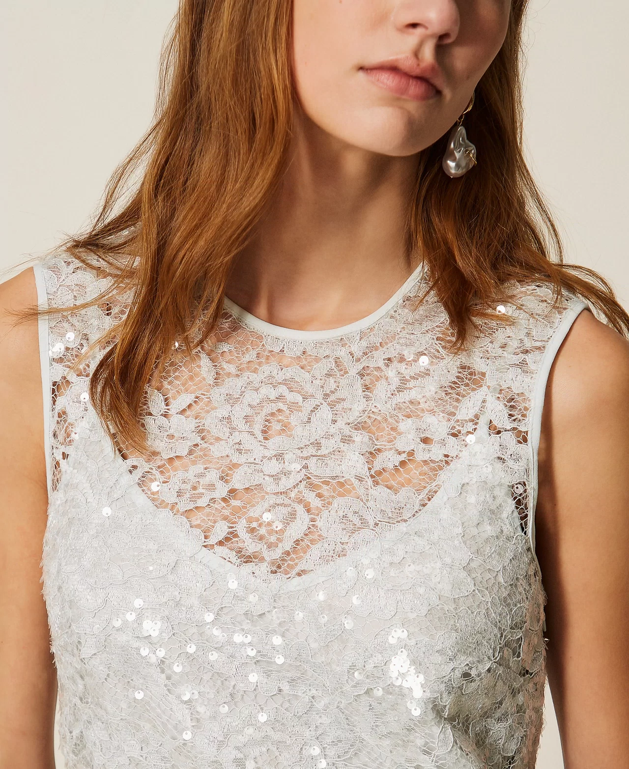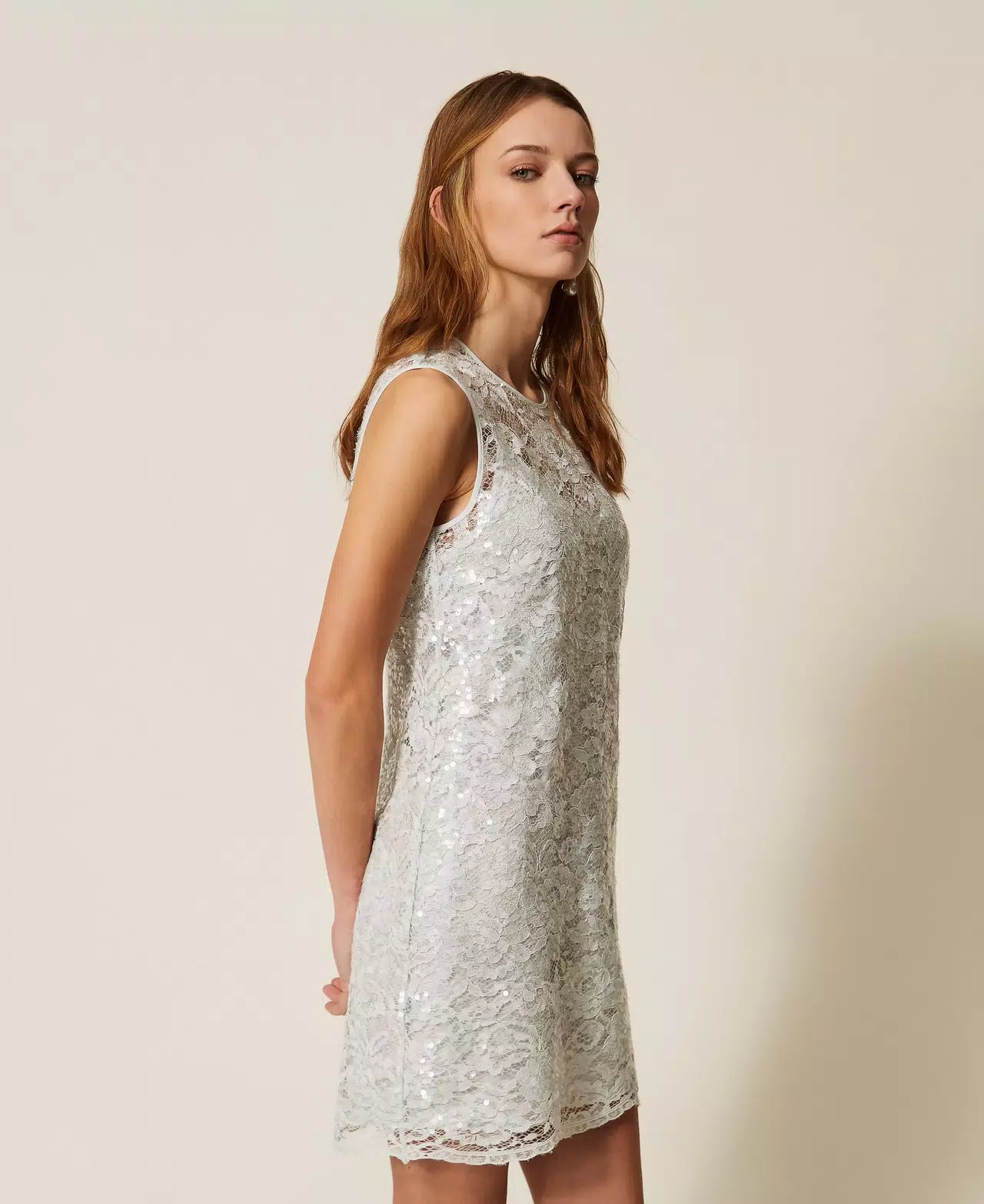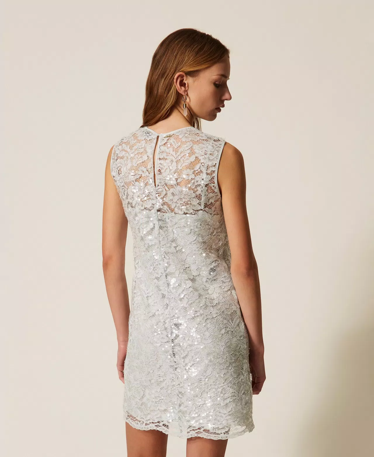 Abito corto smanicato in pizzo con paillettes trasparenti. Ha collo tondo, chiusura con zip, apertura a goccia con bottone sul retro, sottoveste rimovibile in crêpe de Chine, linea dritta.