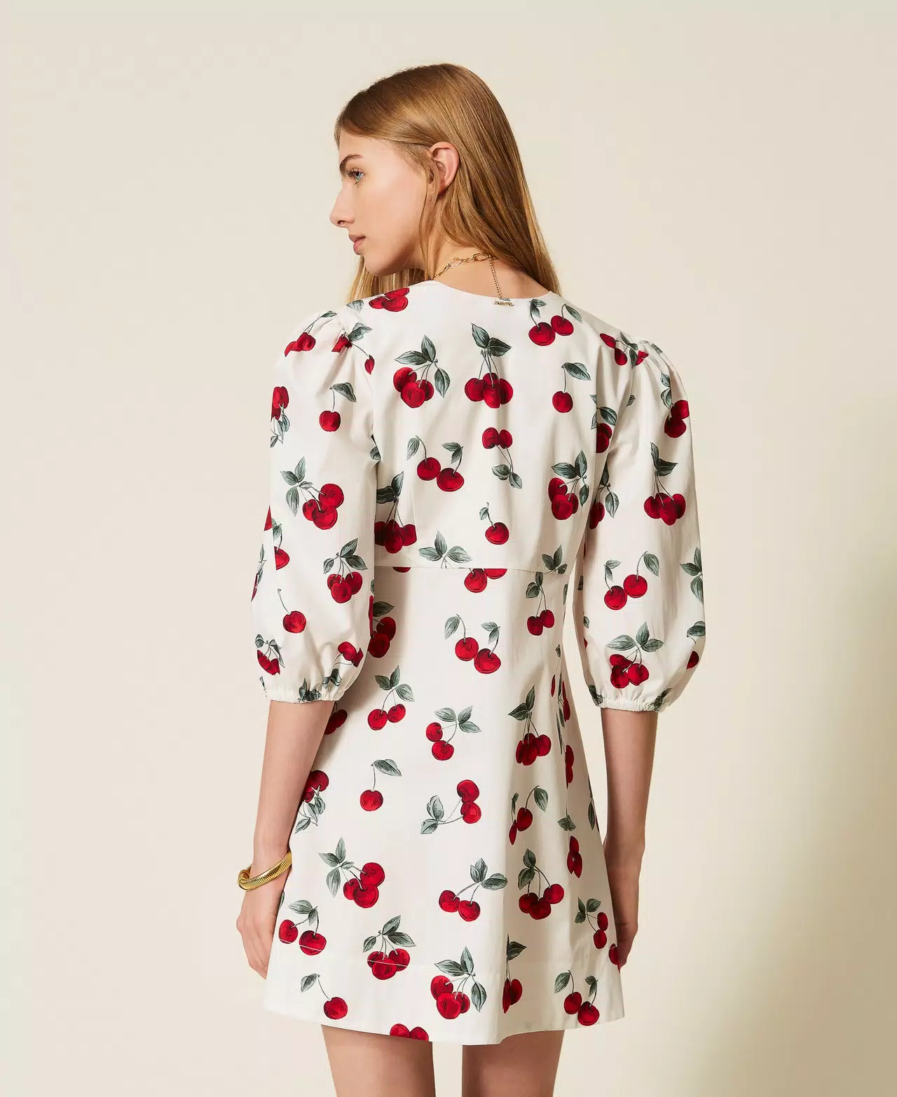 Abito corto chemisier made in Italy in popeline di cotone con stampa ciliegie all over, disegno esclusivo Twinset. Ha scollatura a V, chiusura con bottoni, maniche a tre quarti arricciate ai giri con elastico al fondo, linea fit & flare.
