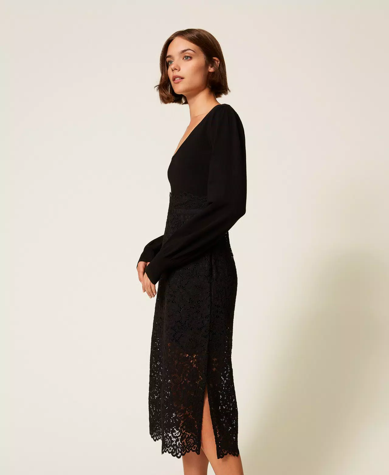 Abito longuette in maglia di viscosa stretch con parte inferiore in pizzo smerlato e passamaneria che delinea il punto vita. Ha collo ampio, maniche lunghe a sbuffo, chiusura con zip invisibile al fianco, linea fitted.