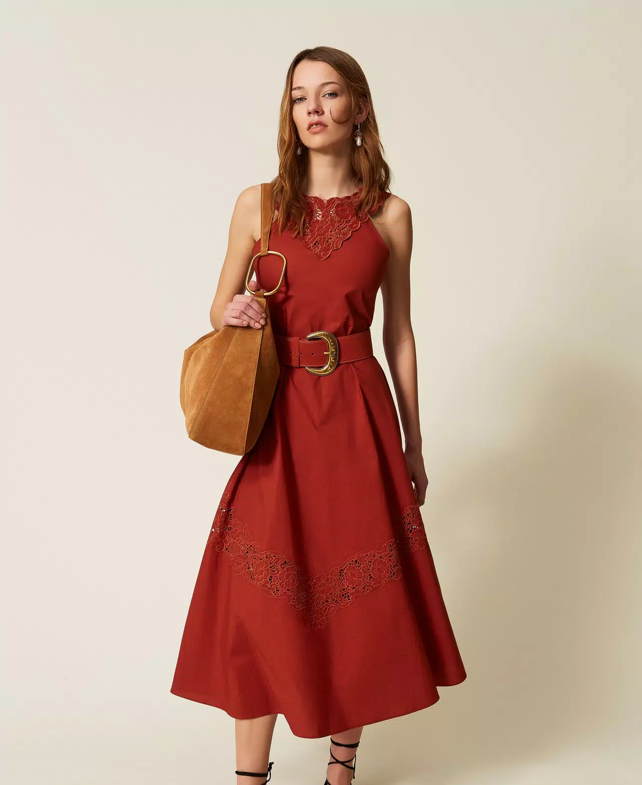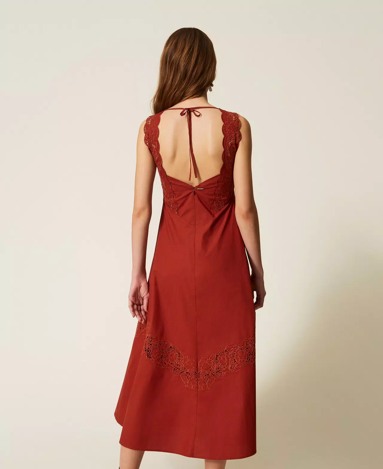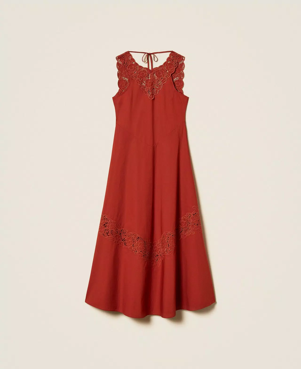 Abito lungo in popeline di puro cotone con sangallo inserito in bande diagonali e ricamo piazzato sullo scollo che crea spalline smerlate. Ha taglio in vita, chiusura con zip sul retro e laccetto al collo, linea fit & flare.