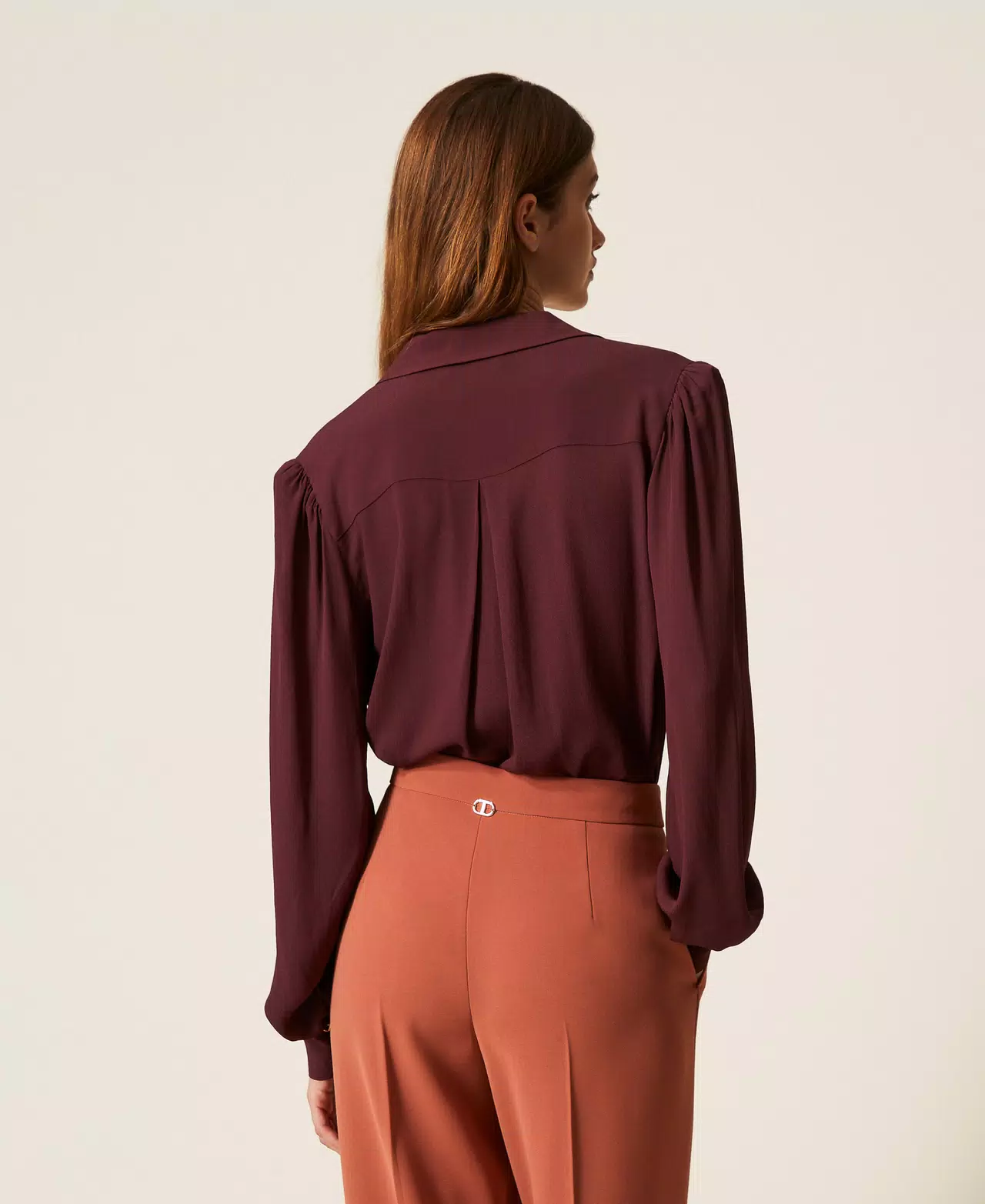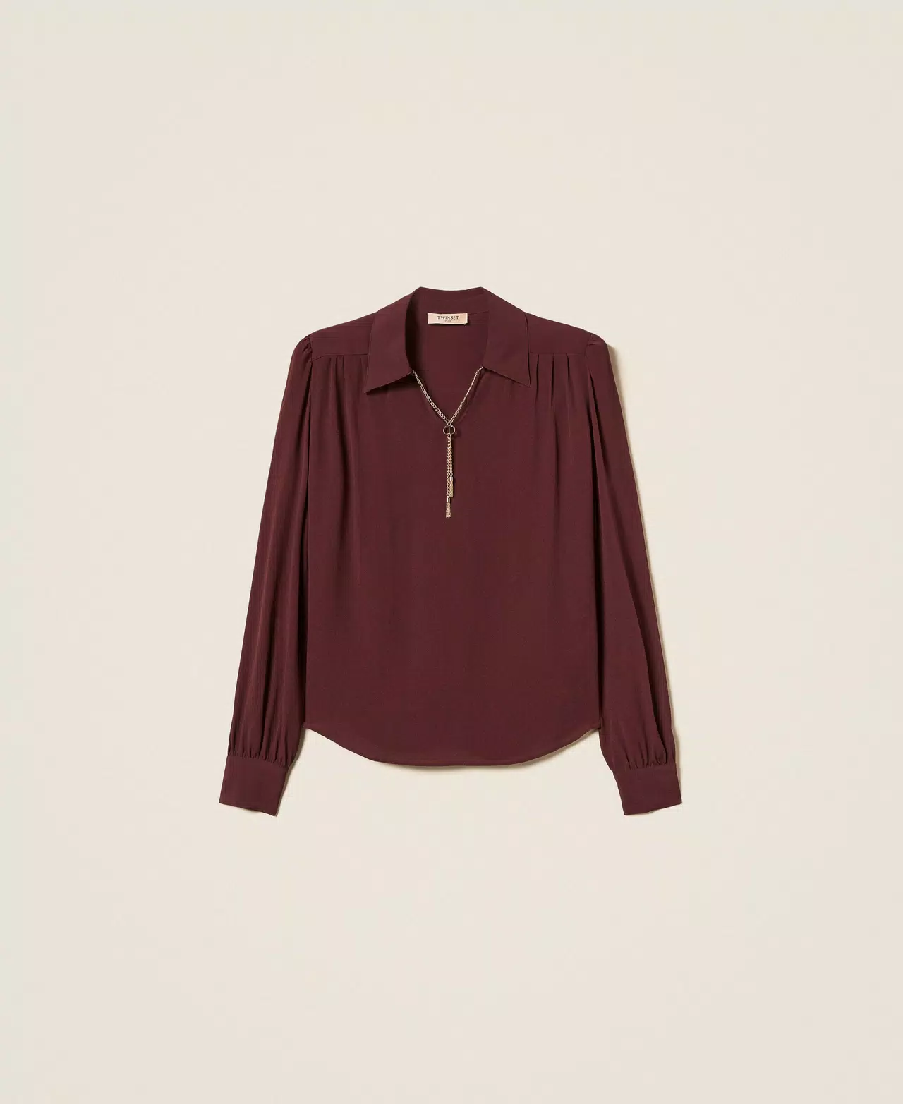 Blusa in crêpe de Chine con dettaglio di catena Oval T rimovibile allo scollo. Ha colletto e arricciatura al carré e ai polsi, maniche lunghe con bottoni logati Oval T al fondo, linea morbida.
