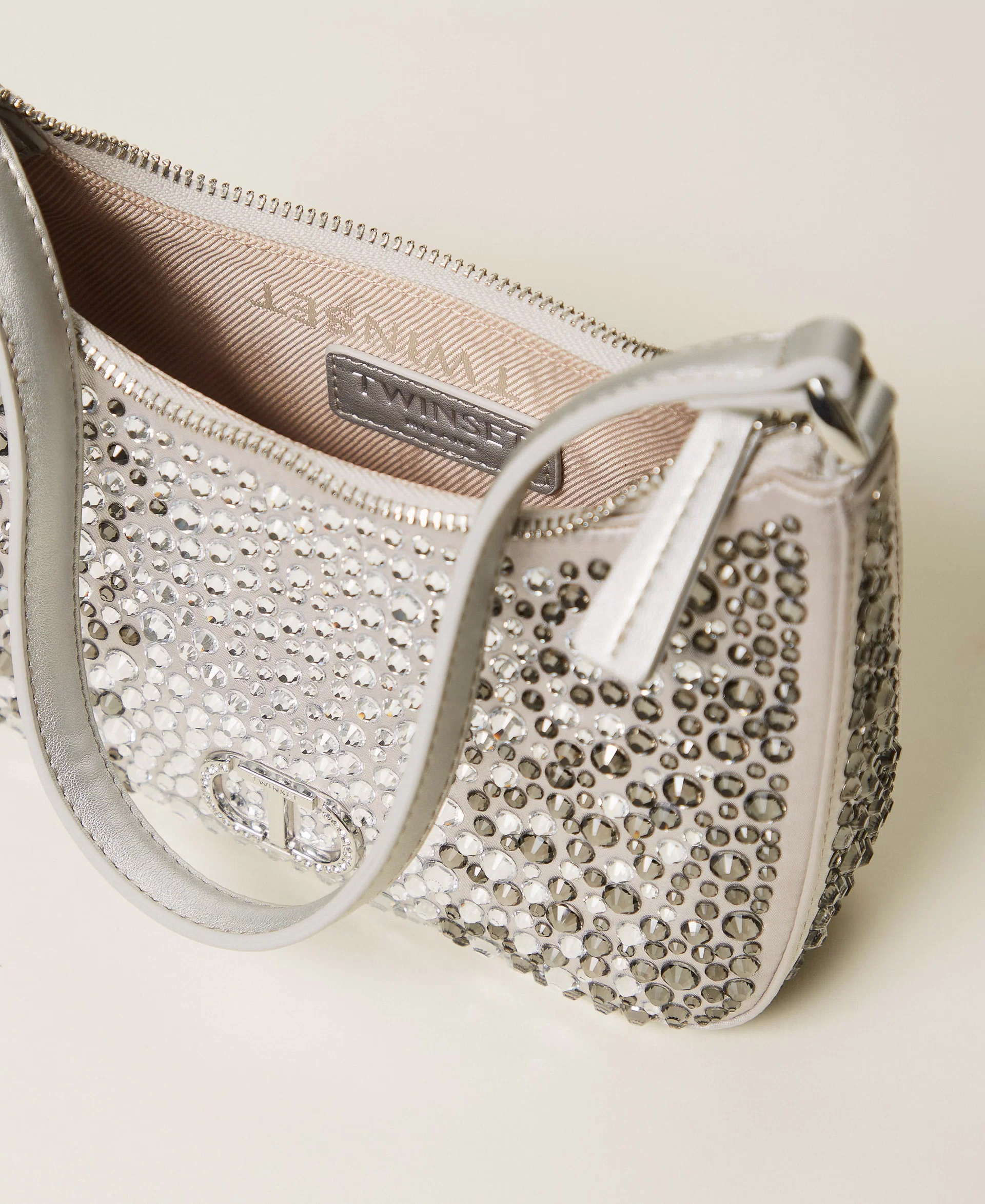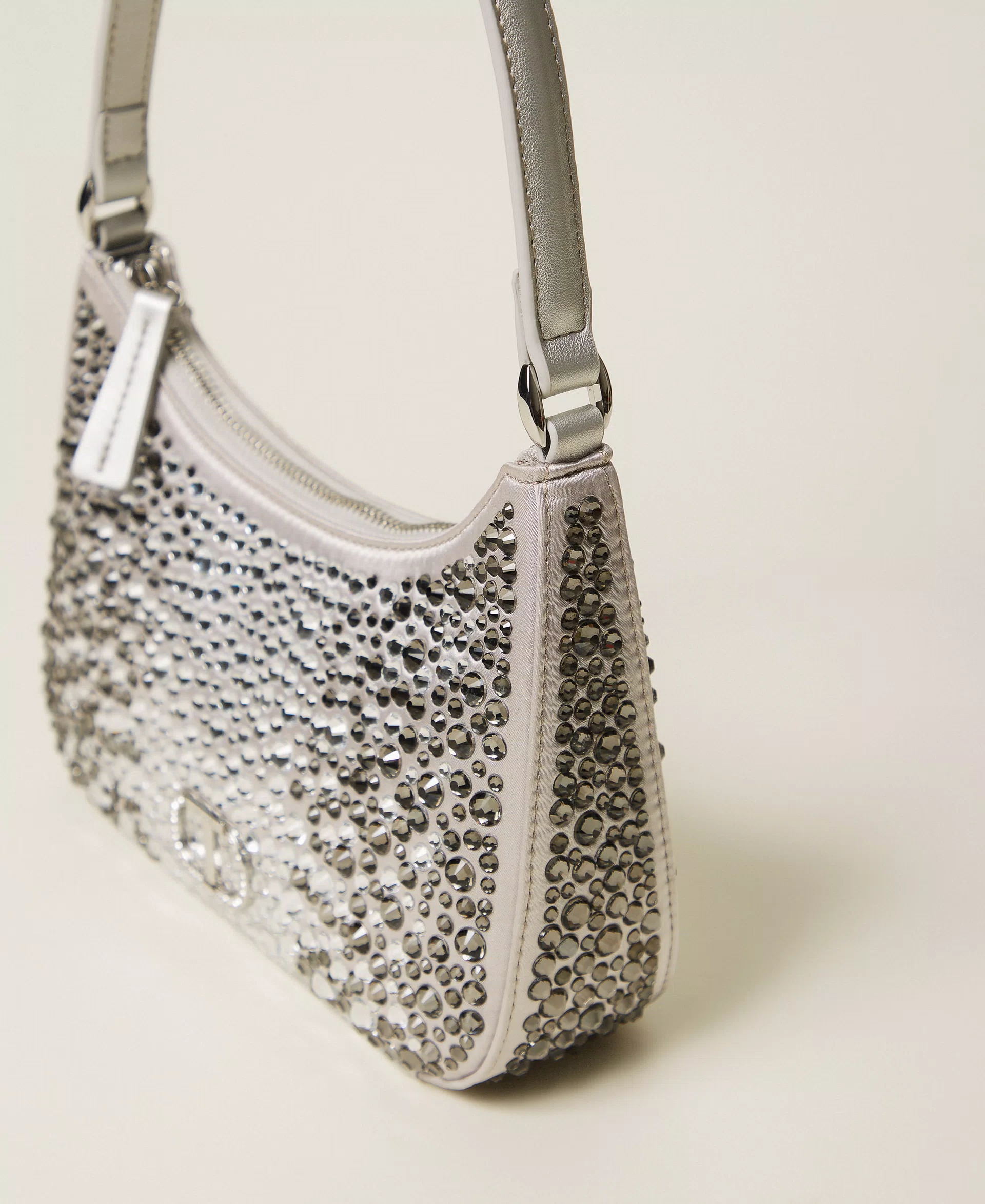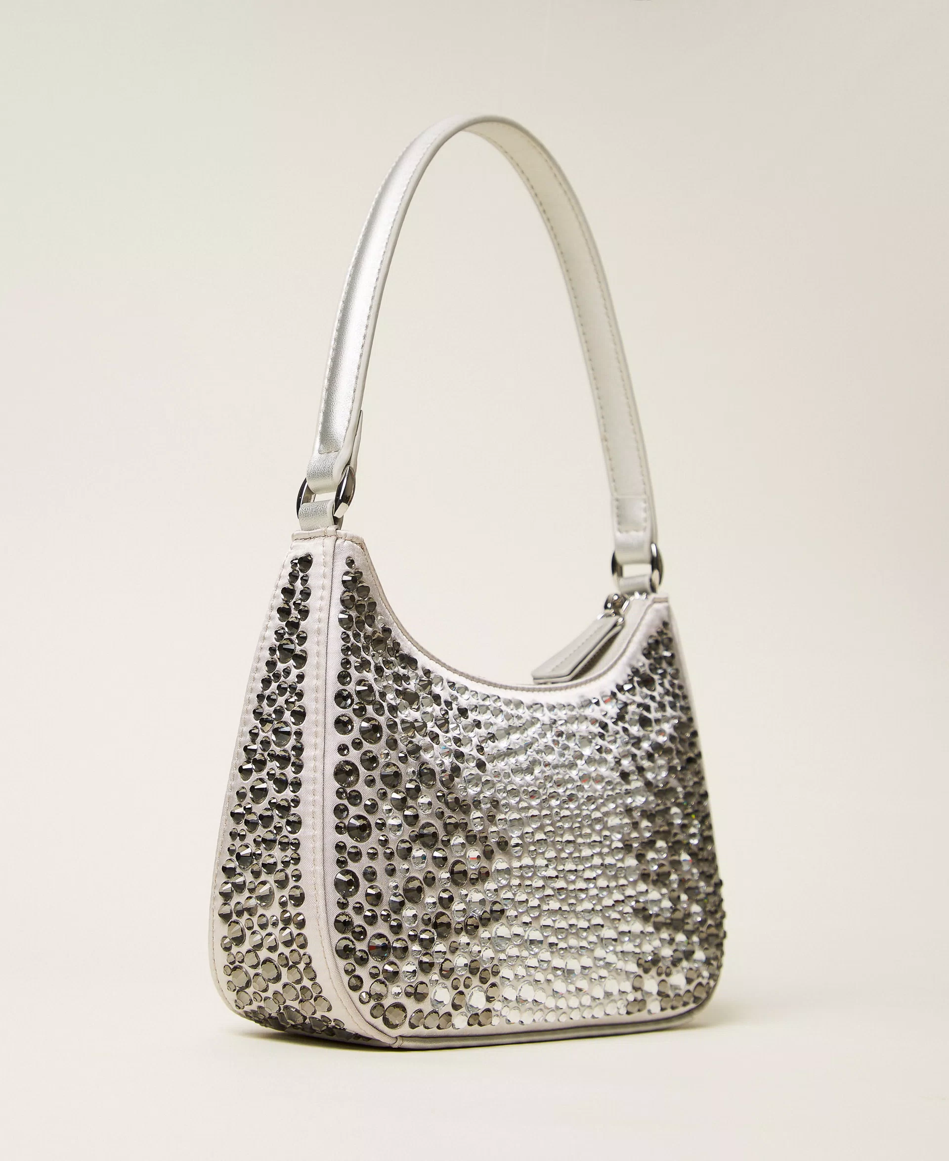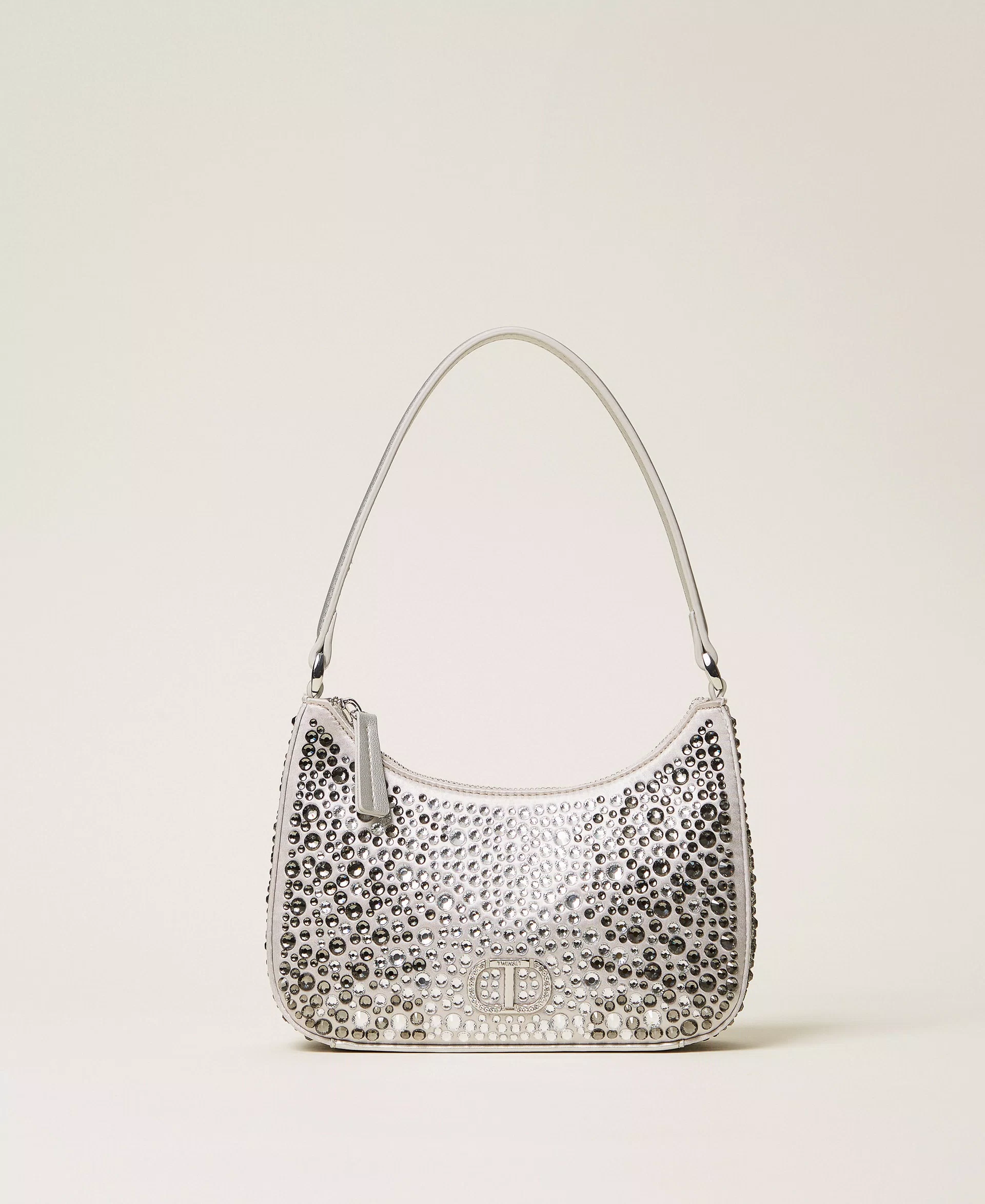 Borsa hobo in raso con applicazione di strass termosaldati, di varie dimensioni e con effetto cromatico dégradé. Ha i dettagli effetto pelle di vitello liscio in tinta, chiusura con zip, manico a spalla, logo Oval T con strass incastonati, foderata.