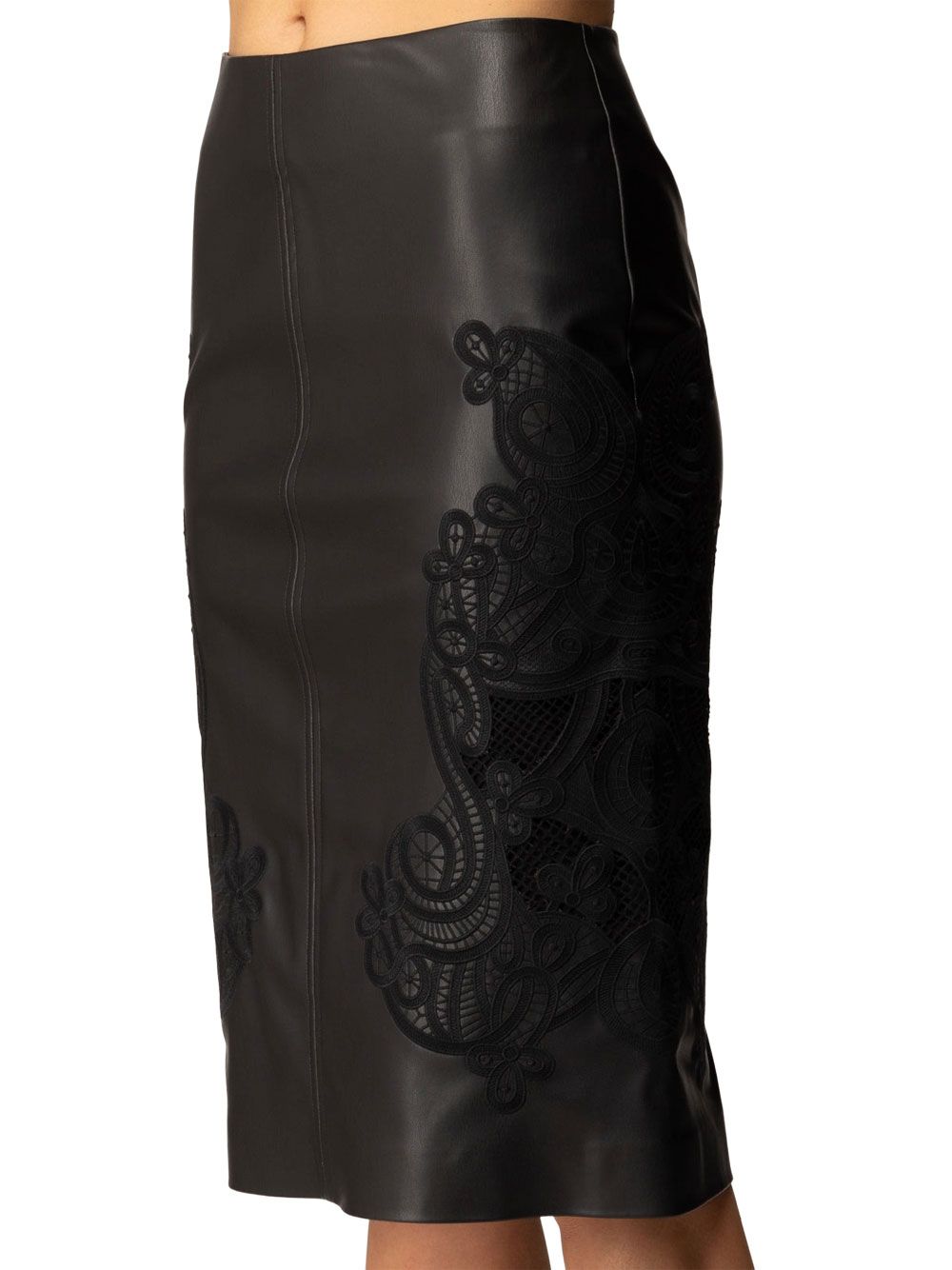 Gonna Midi, Twin Set, ecopelle, nero, silhouette a tubino, morbida e confortevole, ricami ton sur ton, chiusura con zip sul retro, spacco posteriore, versatile e adattabile a diverse occasioni, sensuale ed elegante.