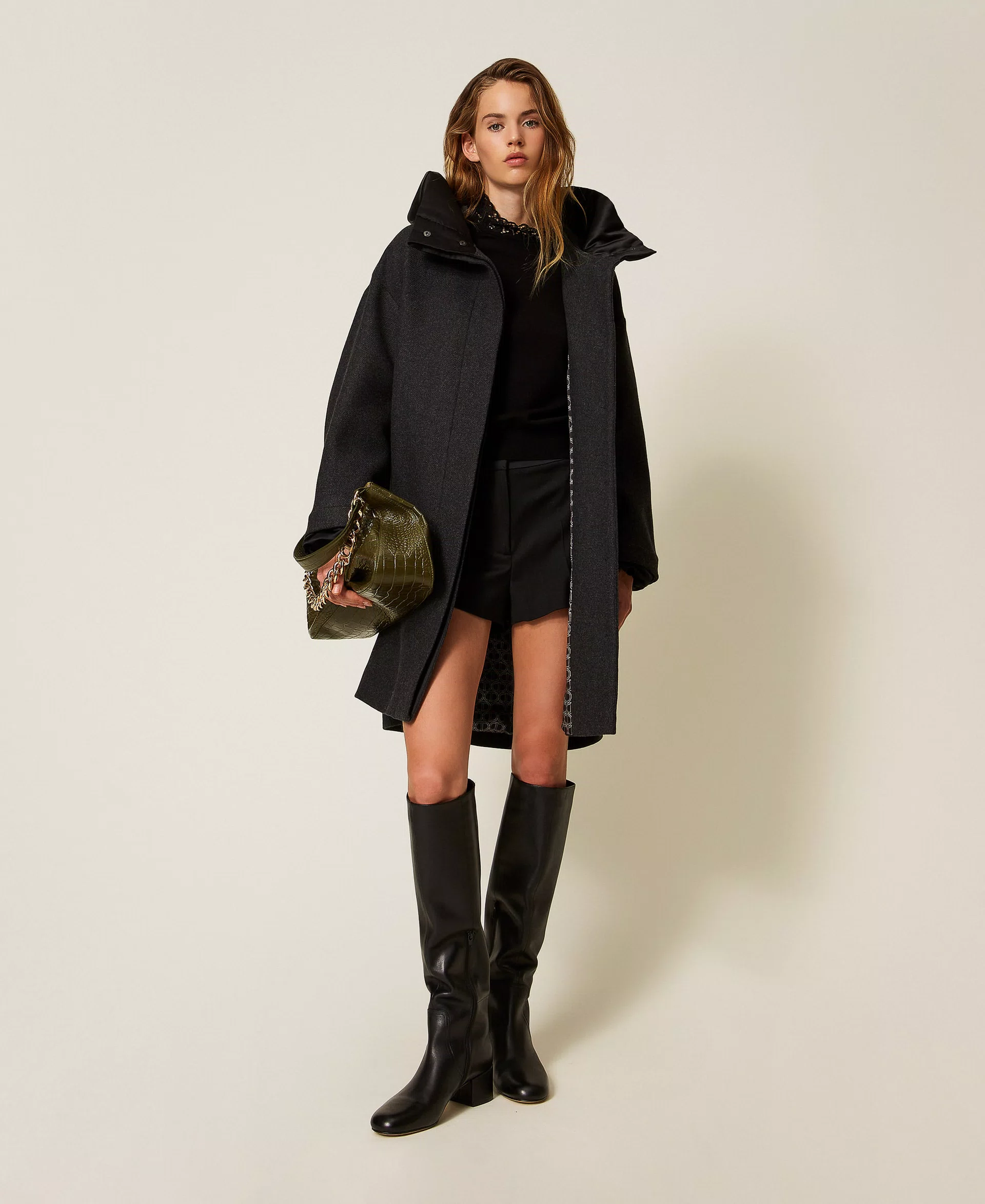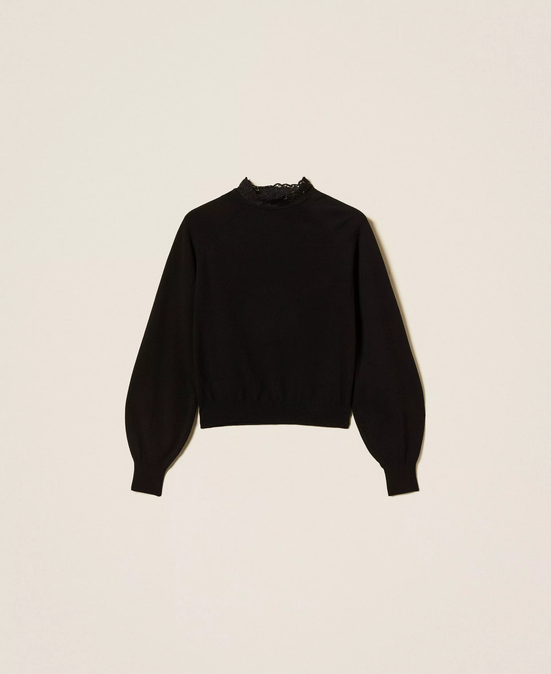 Maglia lupetto in misto viscosa con lavorazione rasata e applicazione di passamaneria in pizzo che rifinisce il collo. Ha maniche lunghe morbide, apertura a goccia con bottoni sul retro, linea morbida.