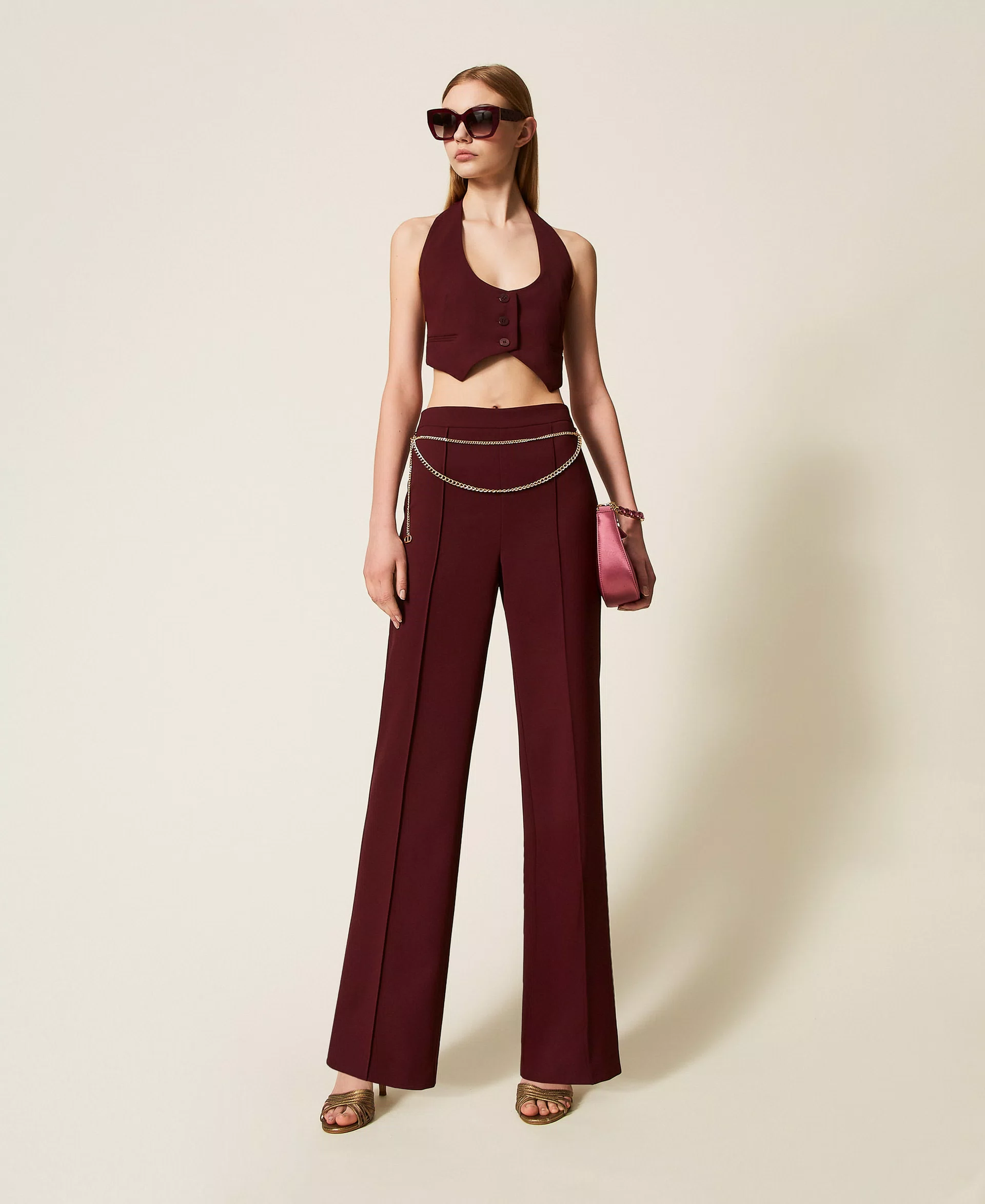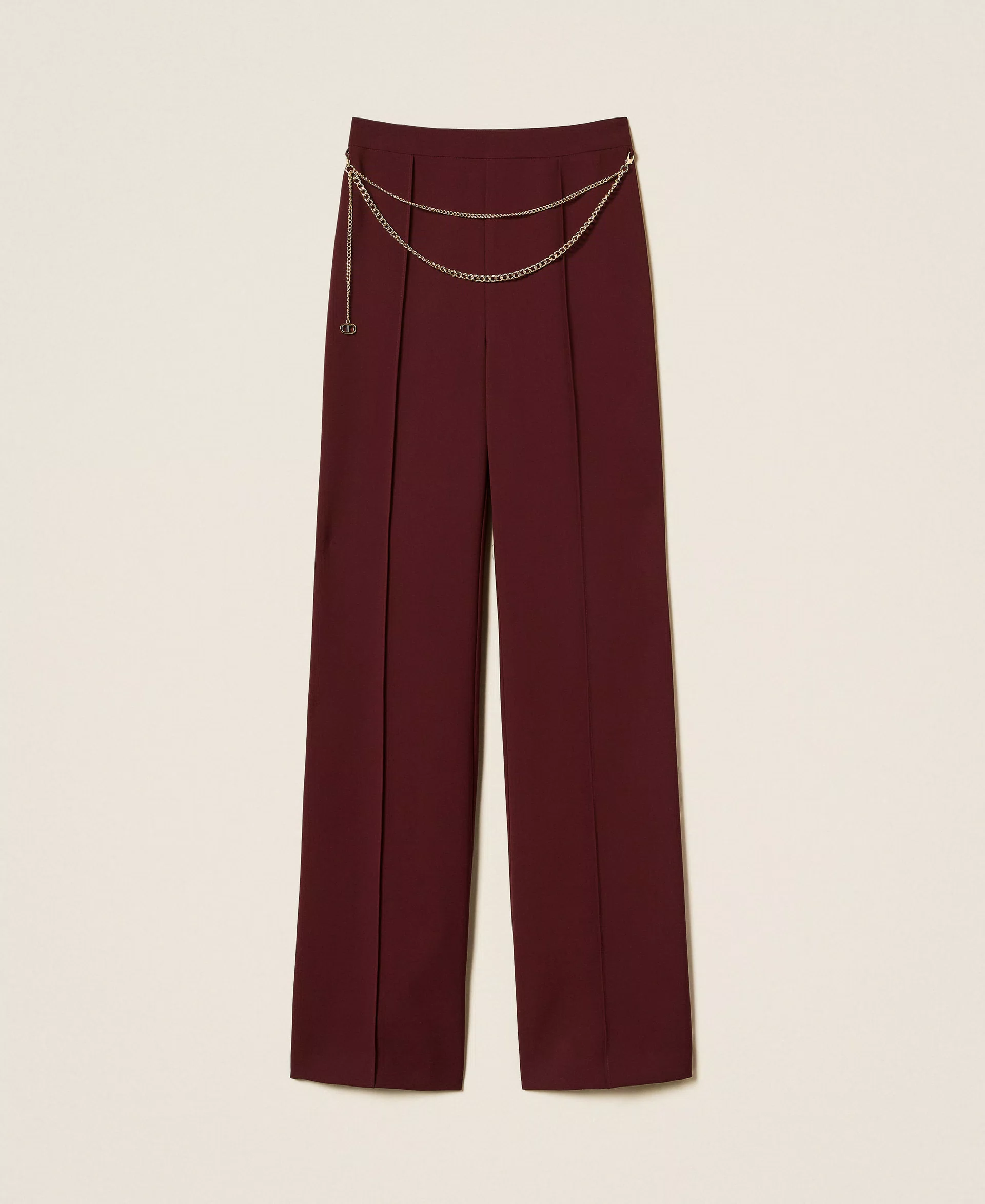 Pantaloni in crêpe cady con cintura rimovibile in catena davanti e dettaglio Oval T. Ha chiusura con zip invisibile al fianco, nervatura centrale, linea a palazzo.