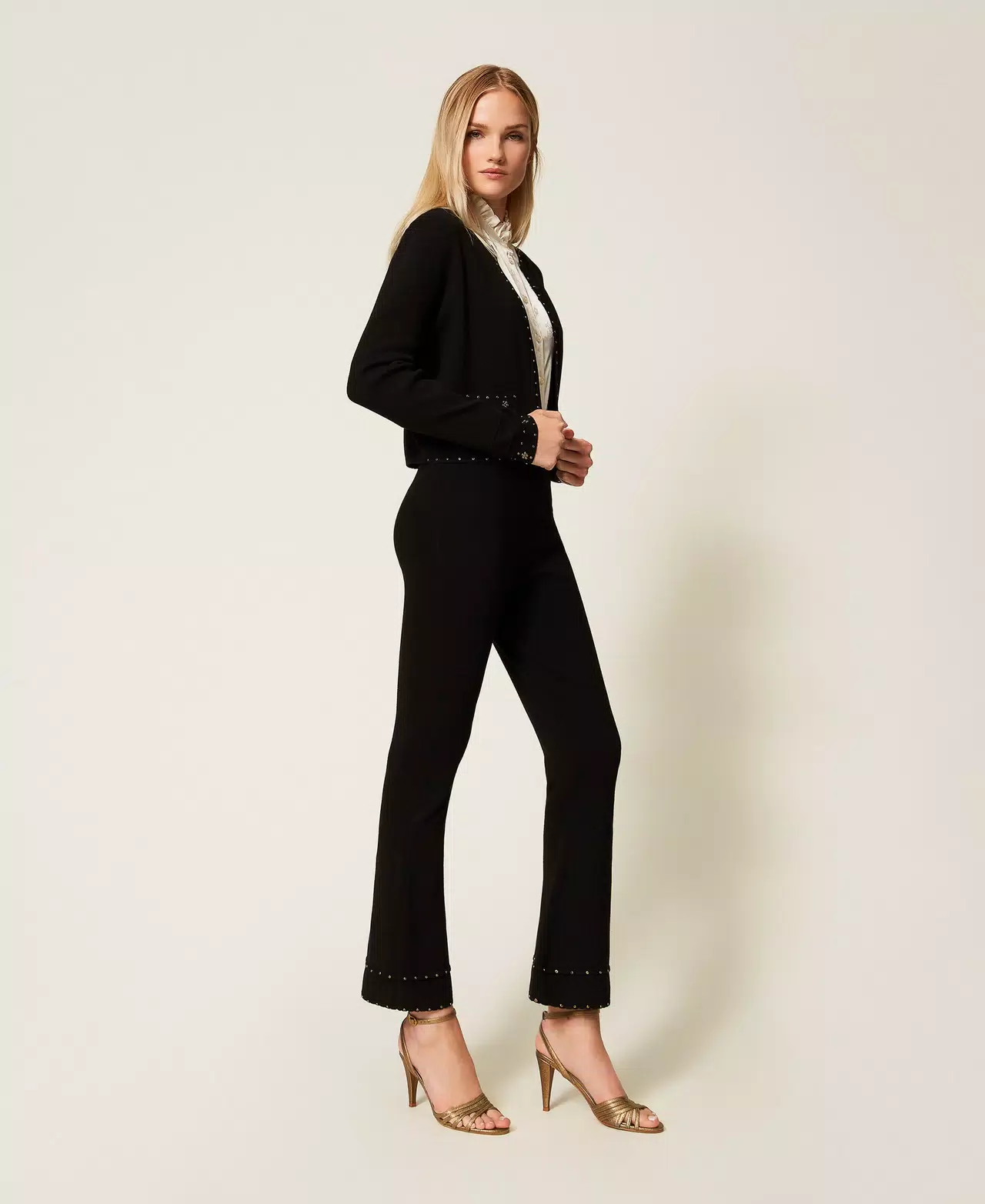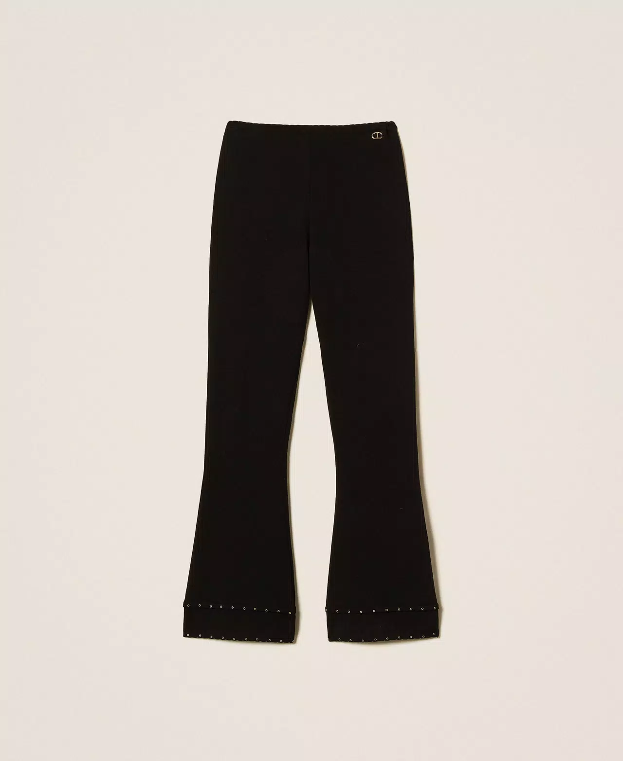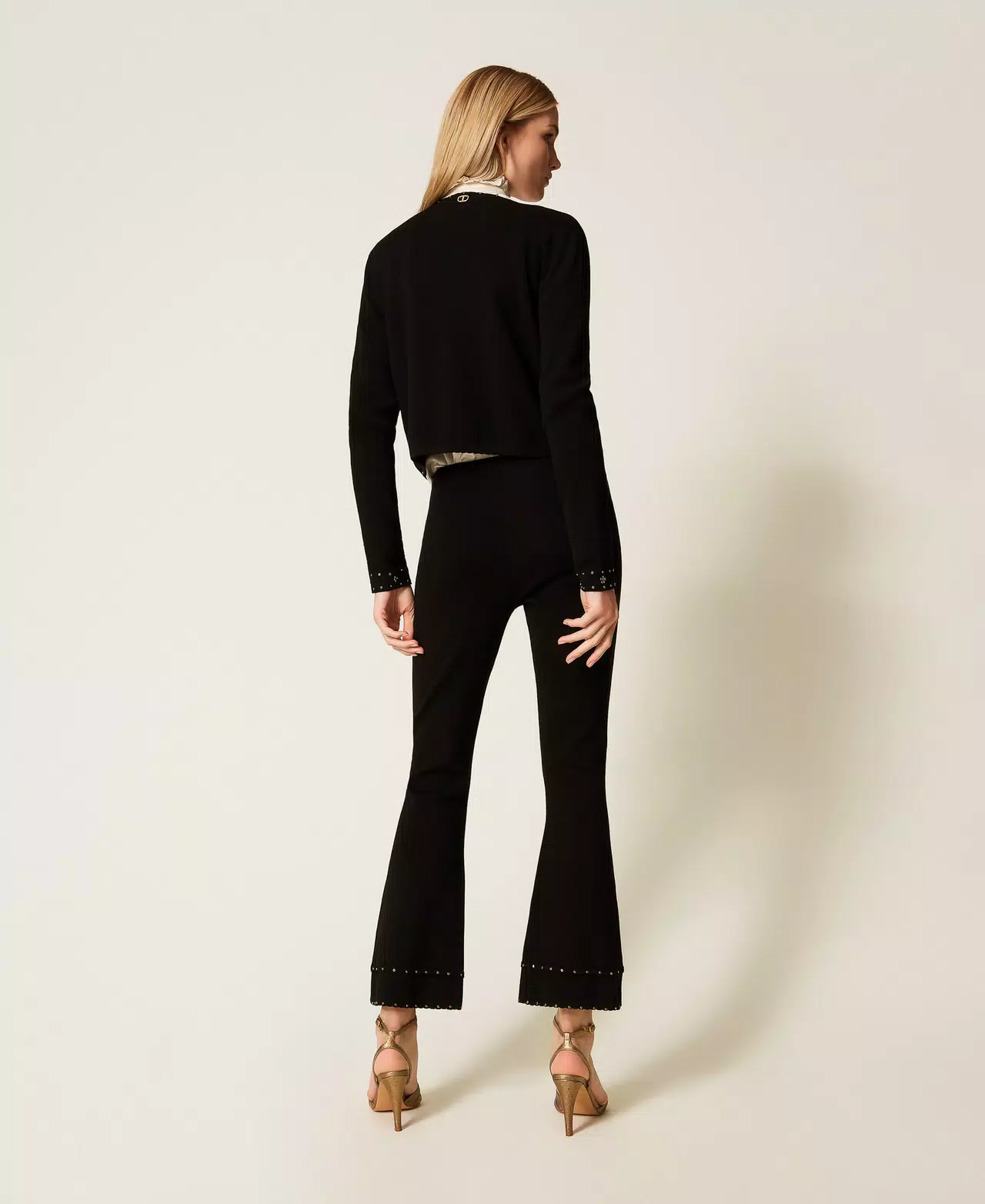 Pantaloni in maglia di viscosa stretch con lavorazione rasata, applicazione di borchie strass, elastico in vita, placchetta logo Oval T, linea flare.