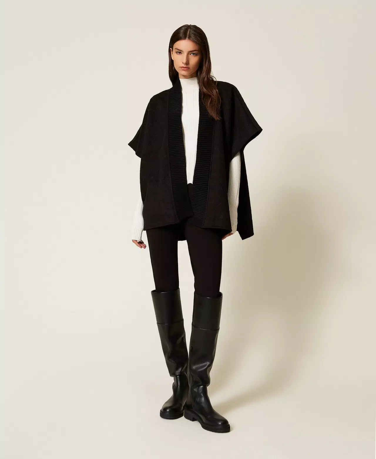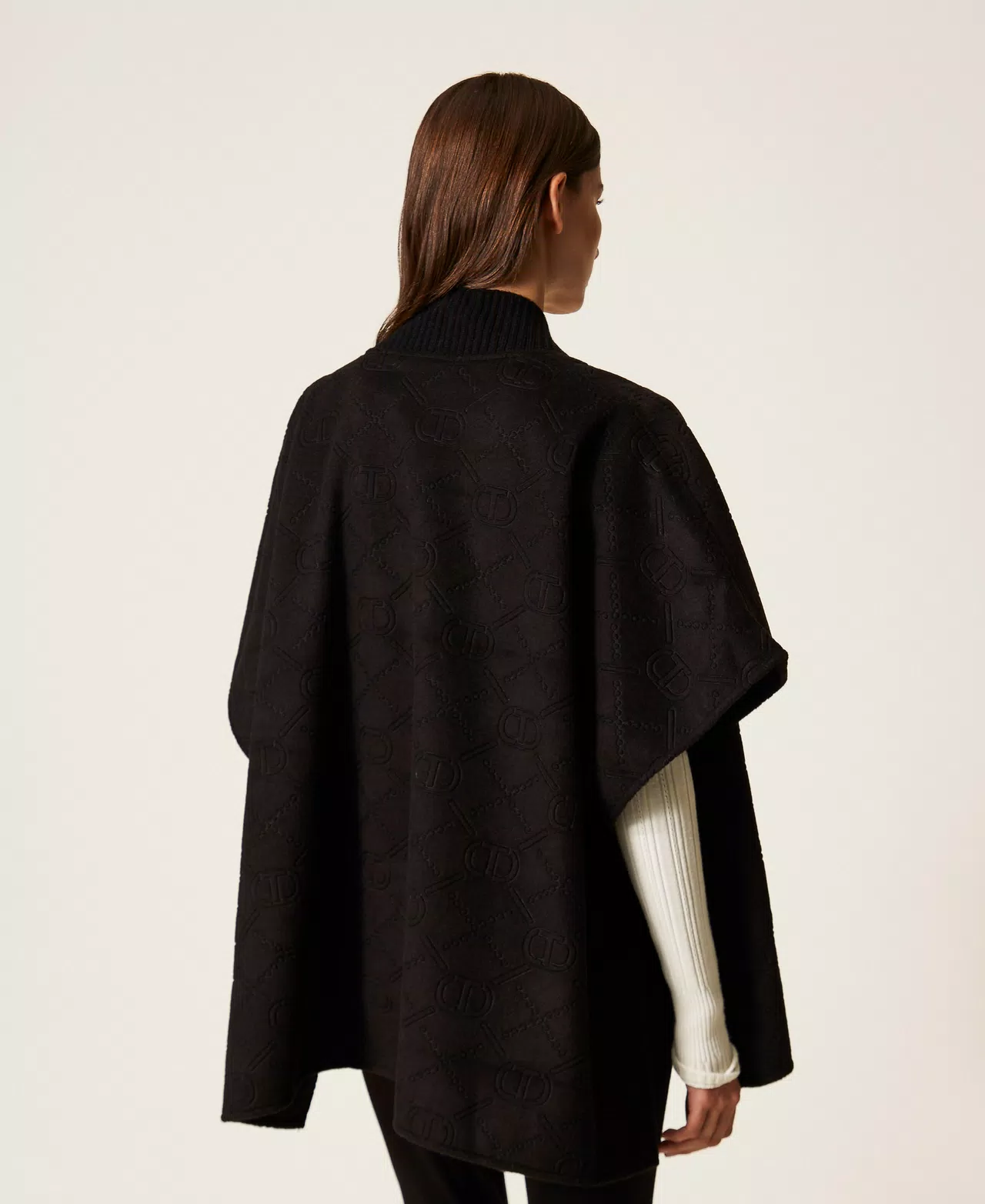 Poncho in panno con logo Oval T embossed all over. Ha apertura rifinita in maglia a coste e bottoni con Oval T ai fianchi.
